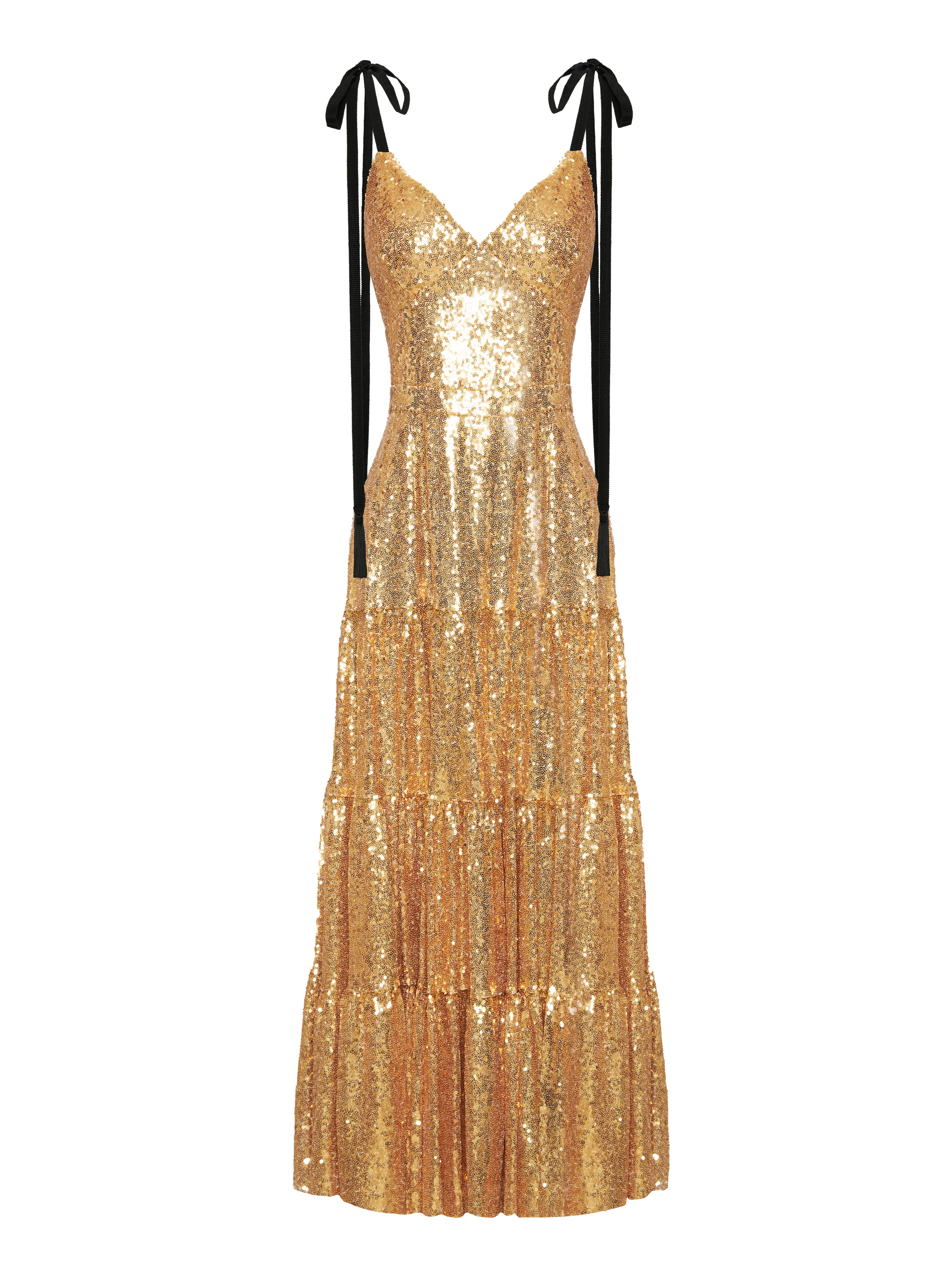 A sundress dress embroidered with sparkling golden sequins, with black contrasting tie straps. The hem is cut in three tiers. Back zip fastening.