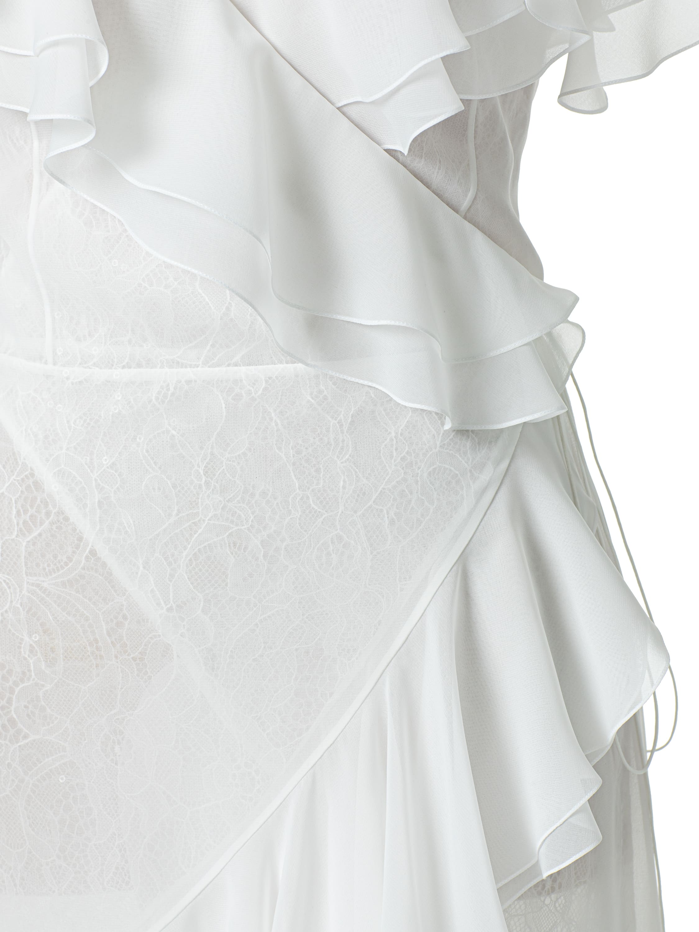 A romantic maxi dress with an asymmetric hem, made of white chiffon. The model is decorated with flounces and lace, which adds lightness and sophistication to the look.