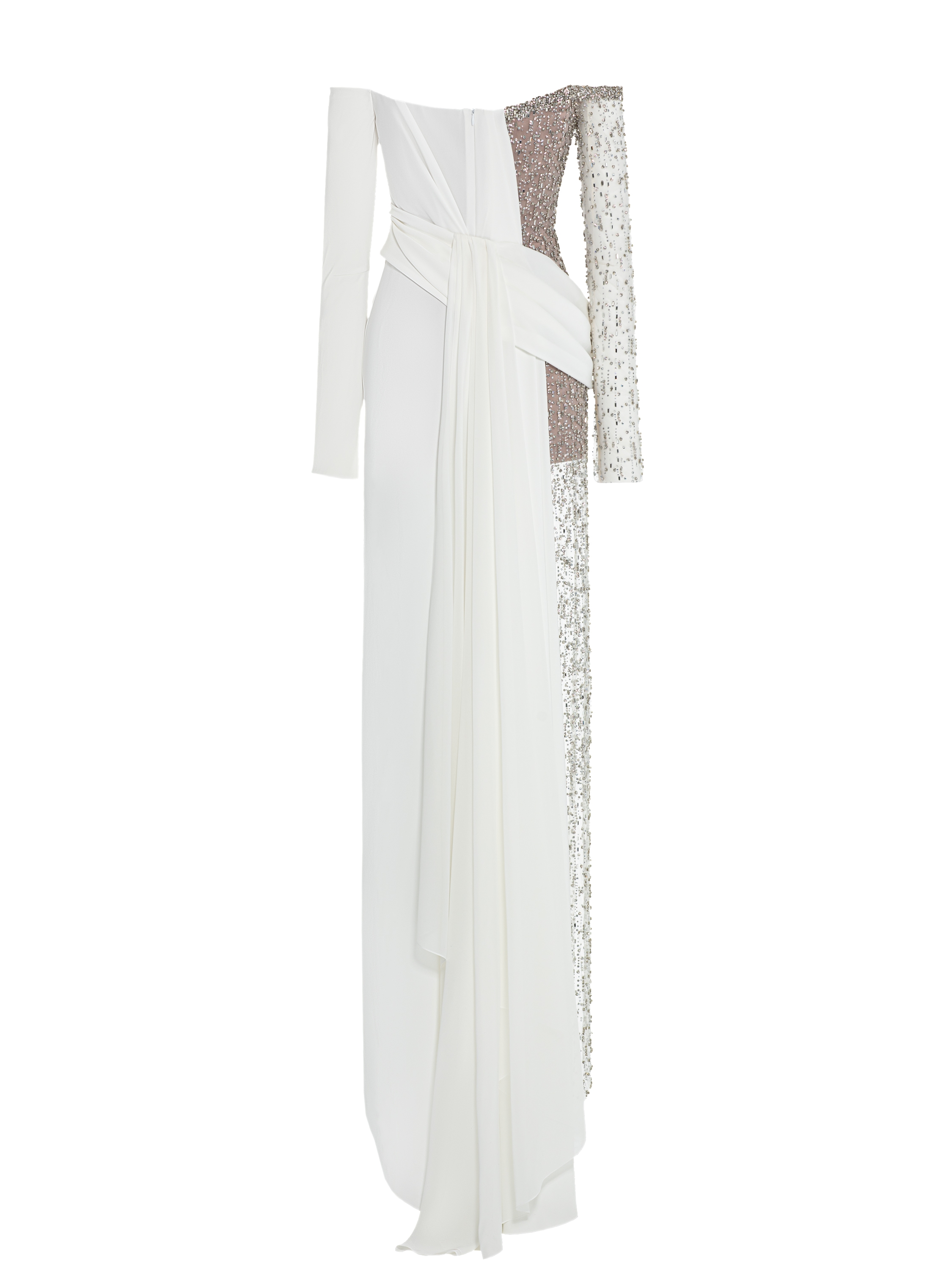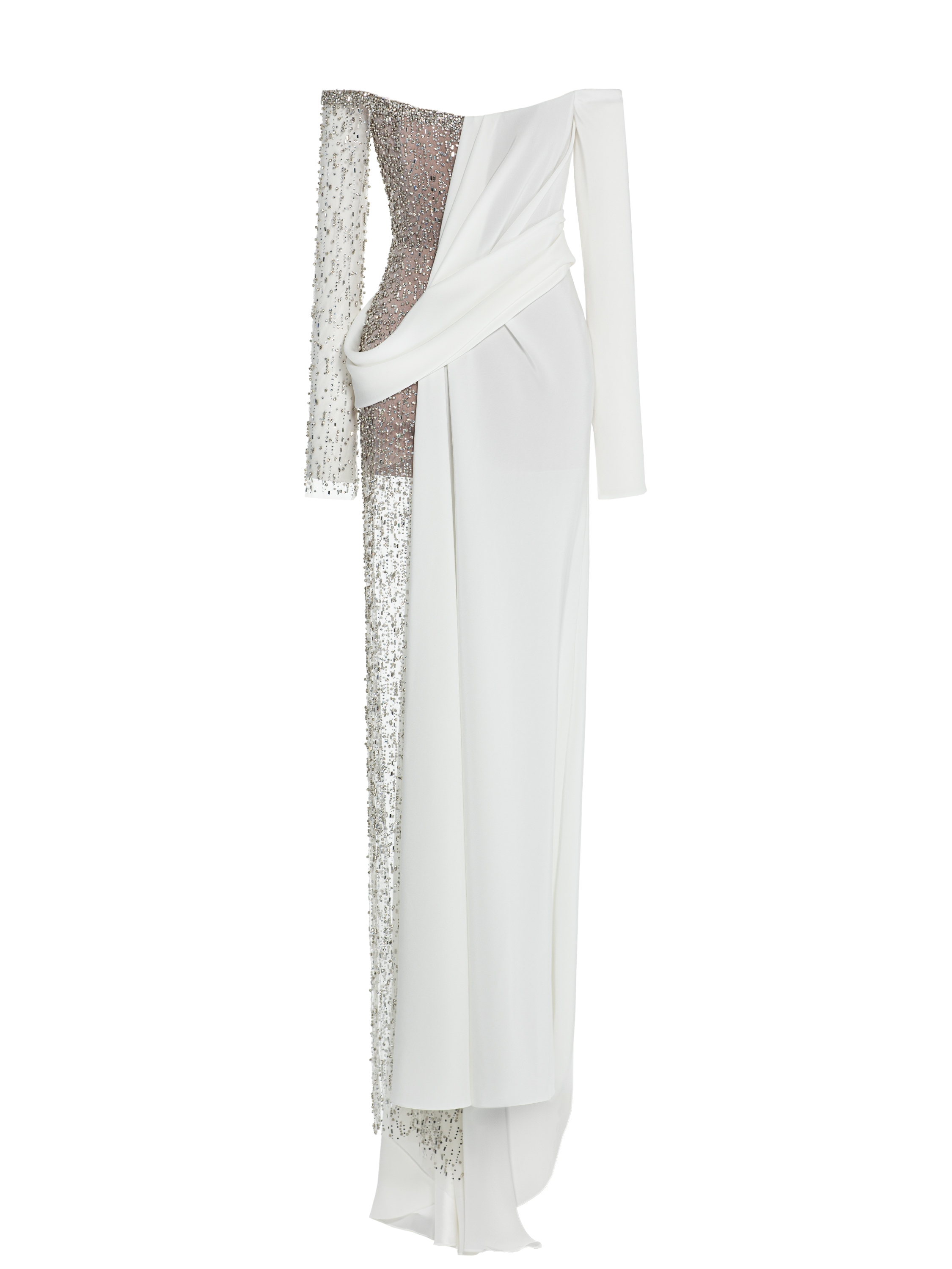 The evening maxi dress is made of semi-sheer mesh and snow-white triacetate. The model with a corset top and long sleeves is decorated with smooth asymmetric draping. The craftsmen of the Yana Fashion House spent 42 hours of handwork decorating the piece with shimmering crystals.