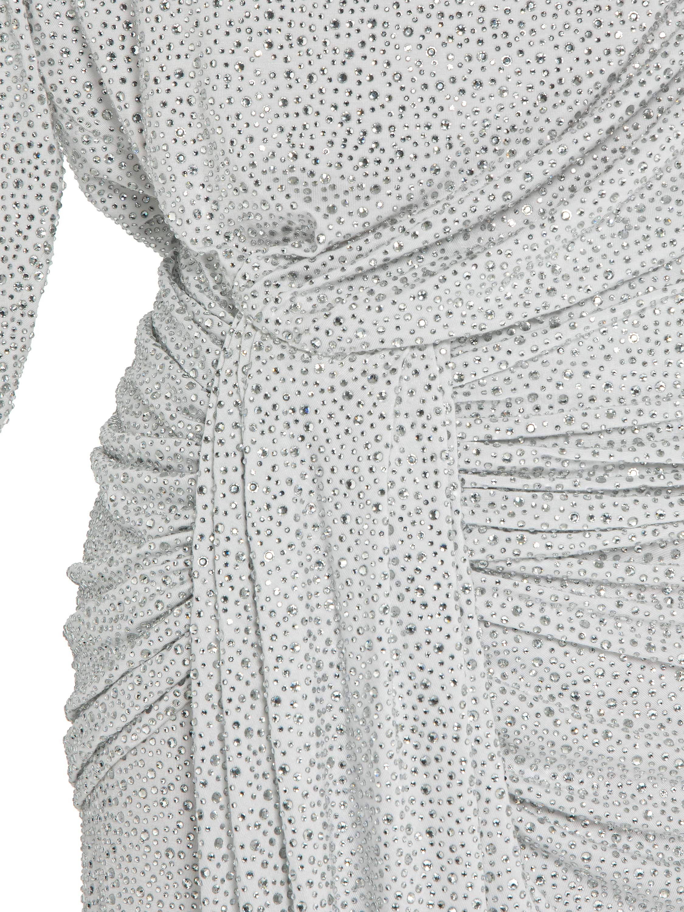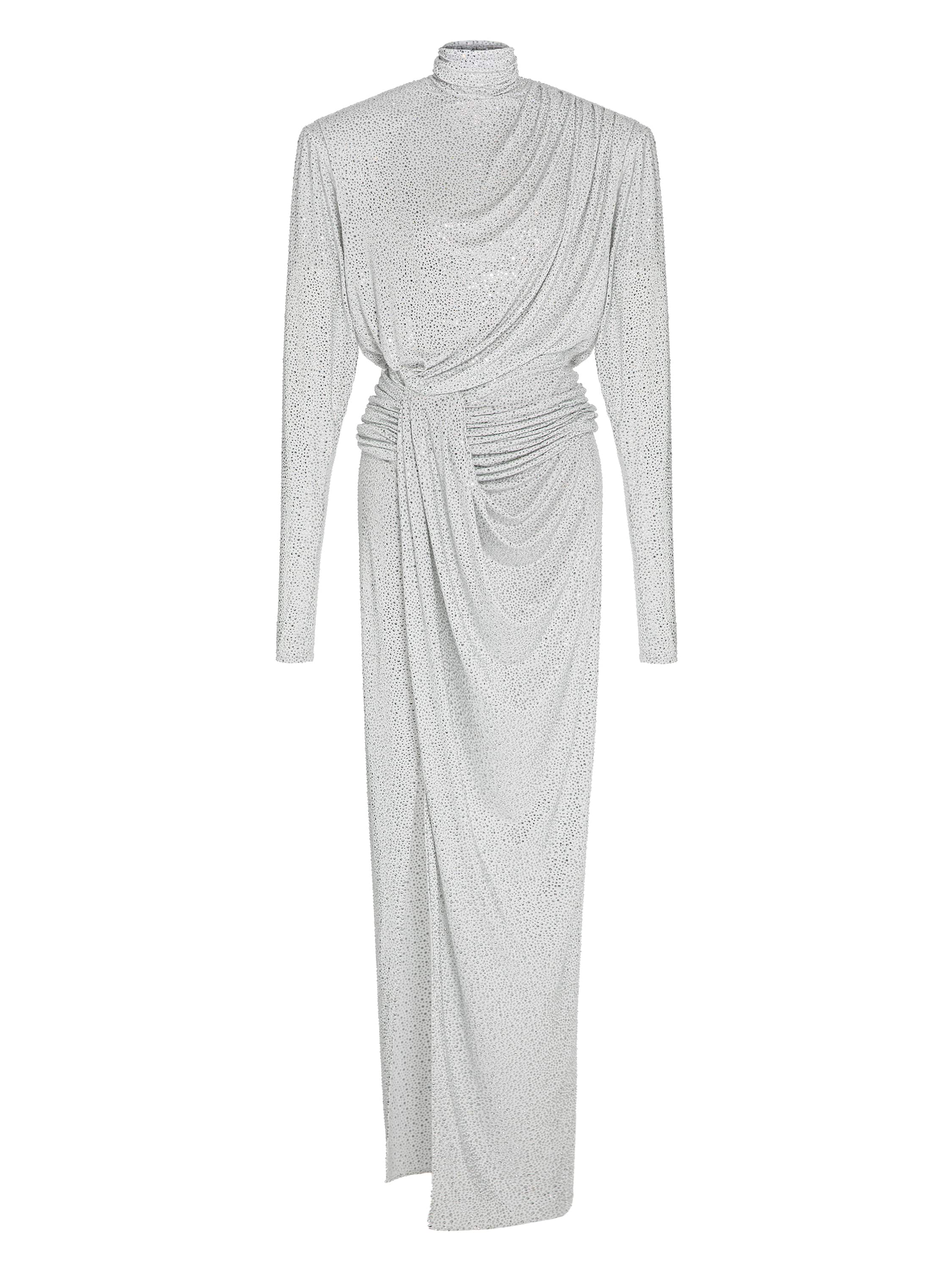 The long-sleeved maxi dress is made of knit fabric, hand-decorated with rhinestones. It took the Fashion House’s craftsmen 140 hours of handwork to apply the rhinestones. The design is complemented by an elegant draping at the waist and a high front slit.