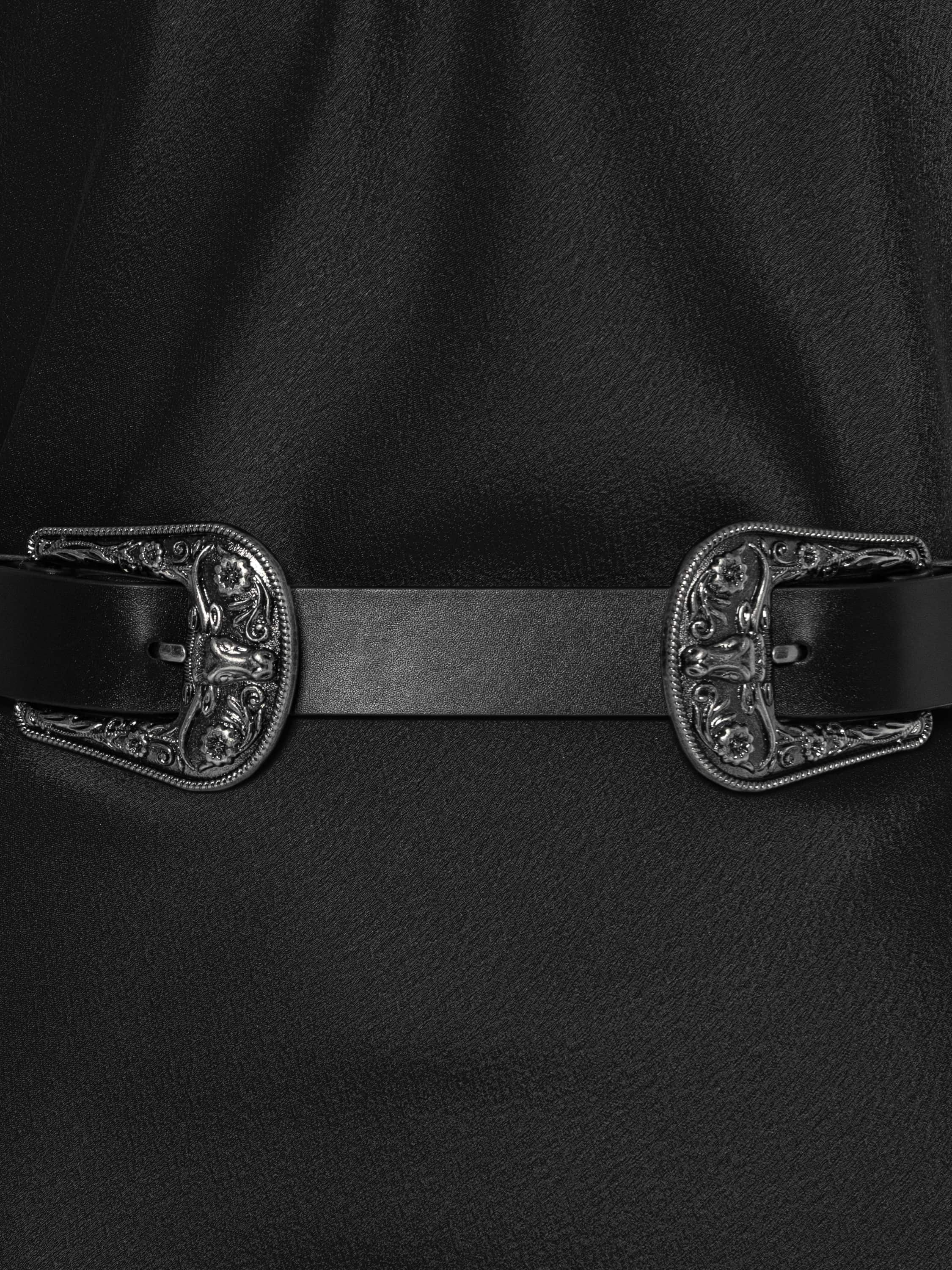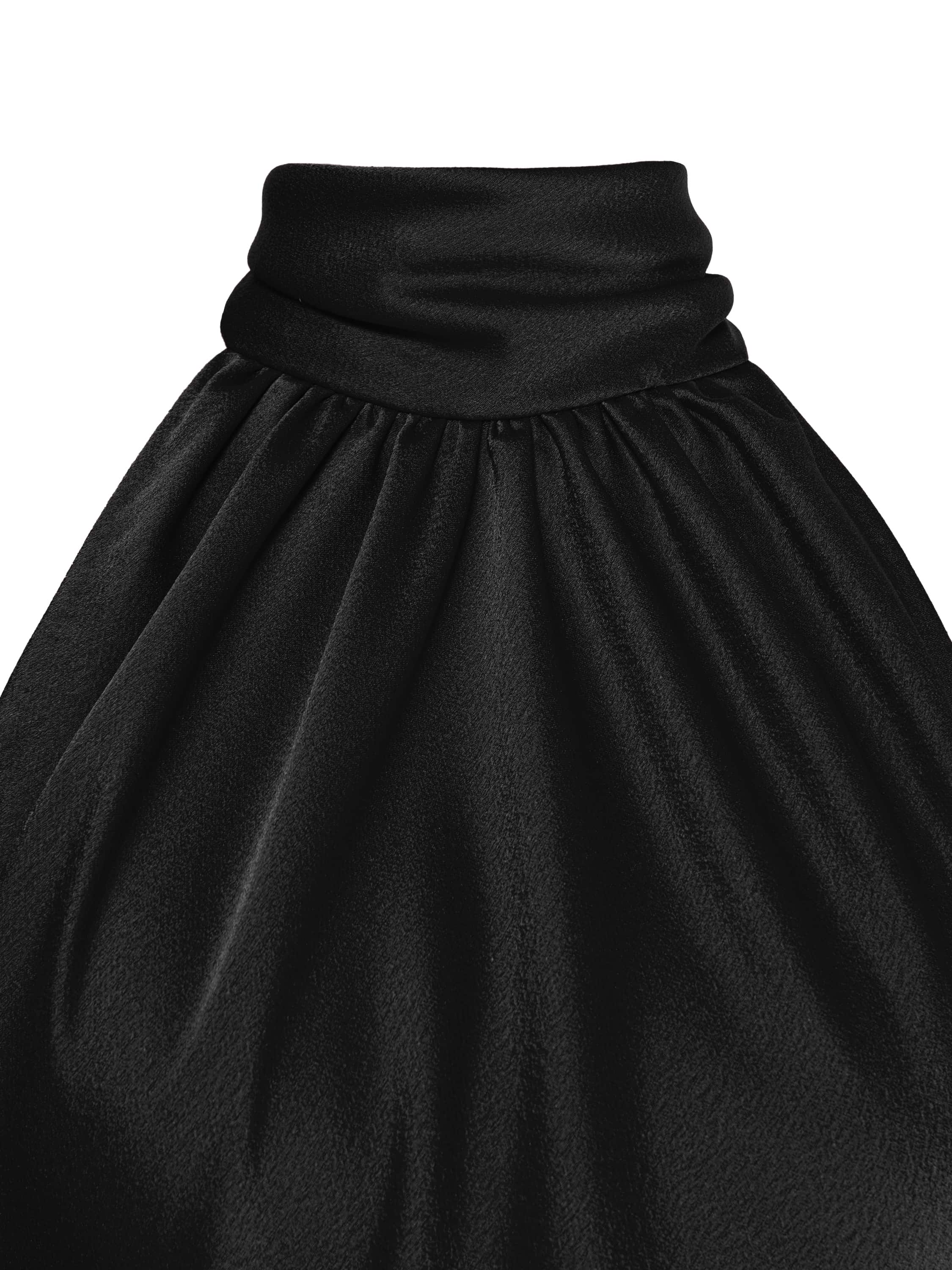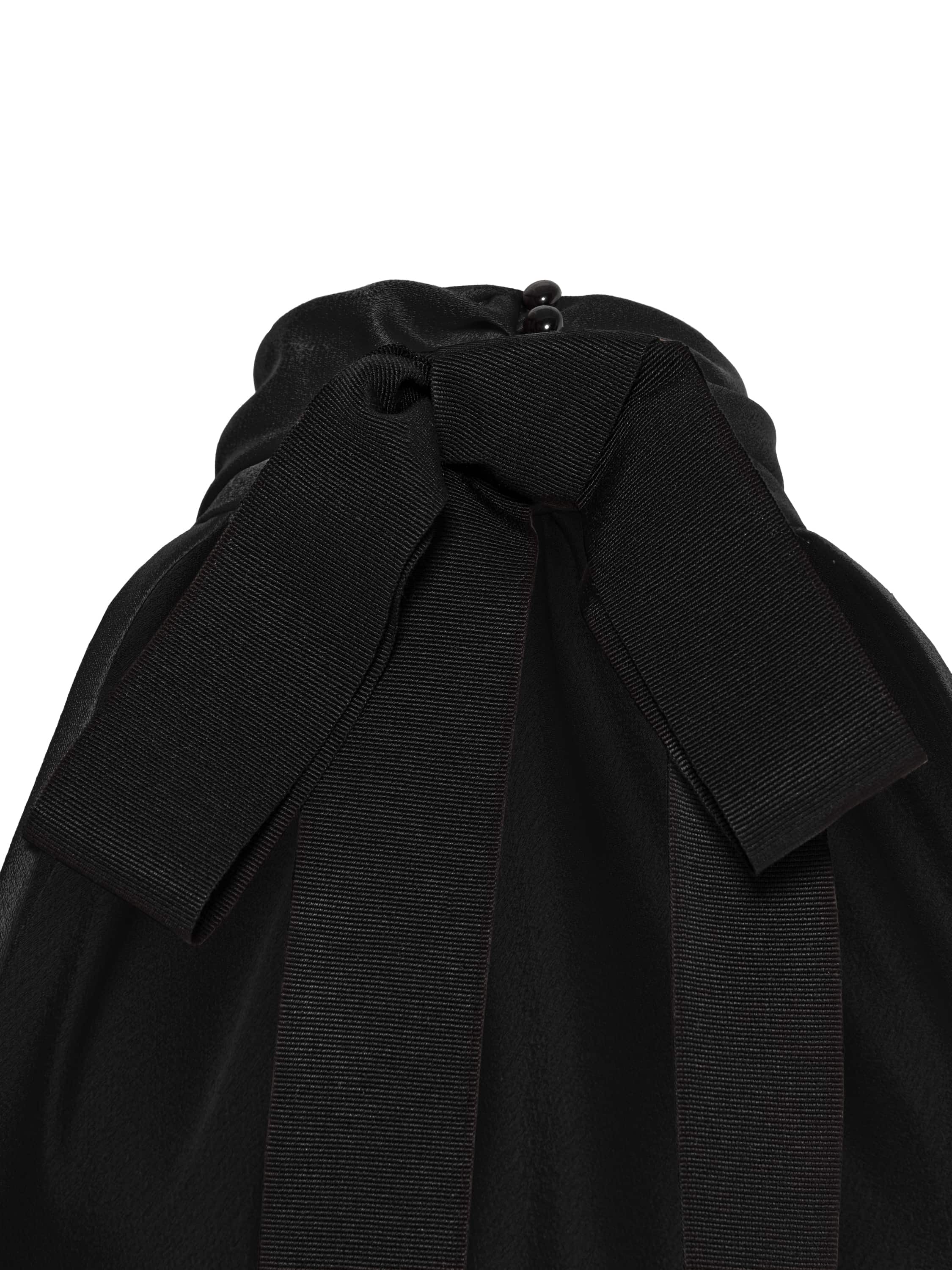 The open-back maxi dress is made of black artificial silk fabric. The model features a high draped collar. At the back there is a black bow with long grosgrain ribbons. The dress comes with a black leather belt with two buckles.