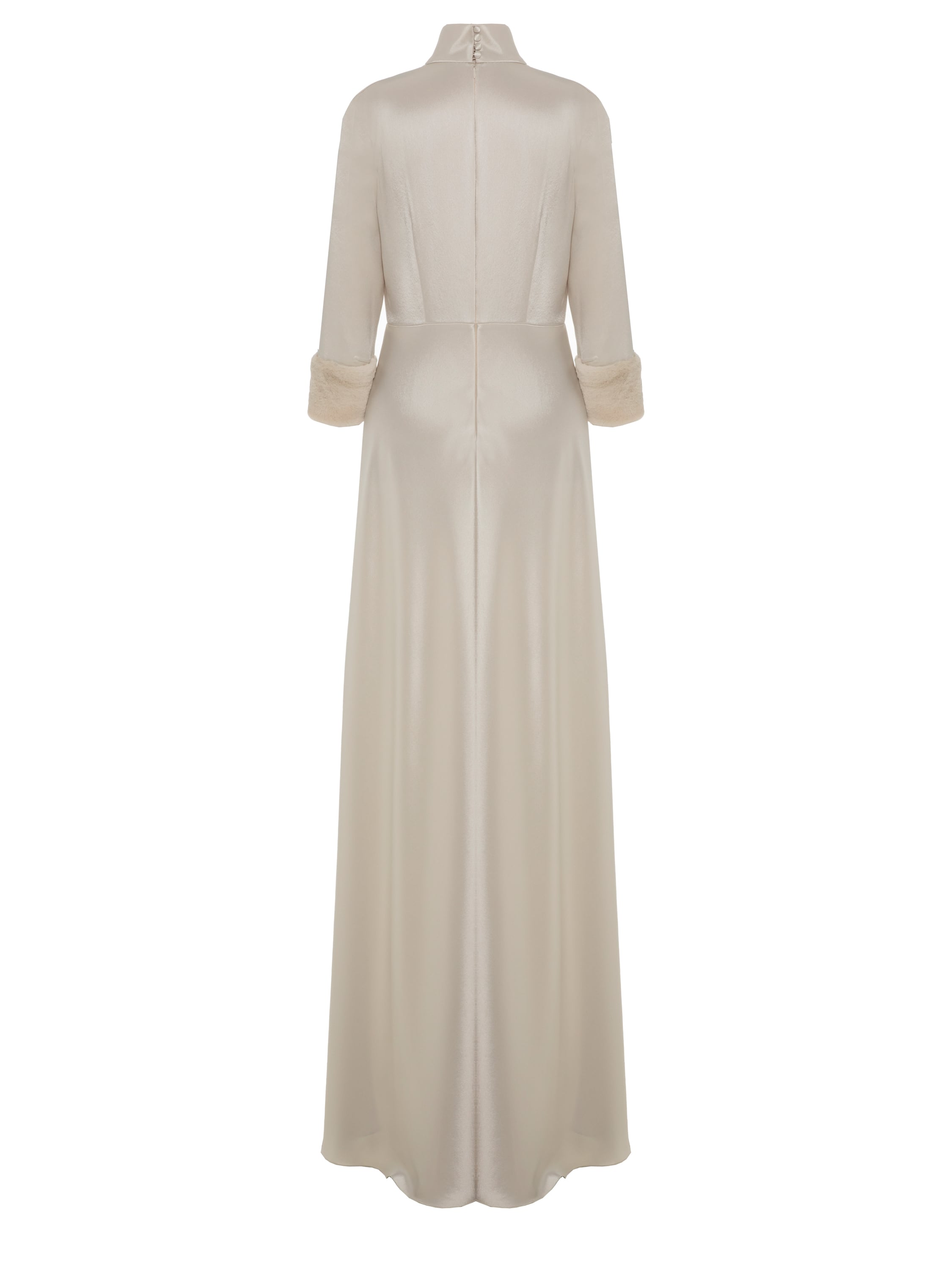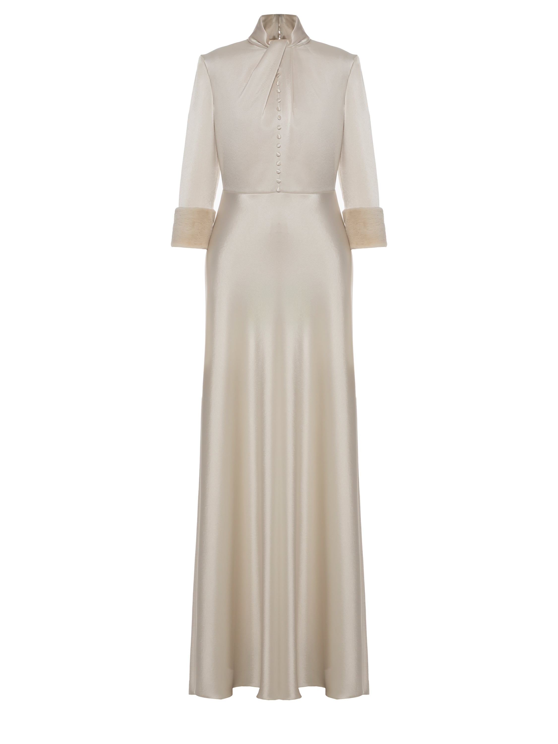 A maxi dress made of milk-colored silk with mink fur cuffs is a delicate look for a special occasion. The laconic model is complemented by a draped stand-up collar and tone-on-tone buttons. Fastens with a concealed back zipper.