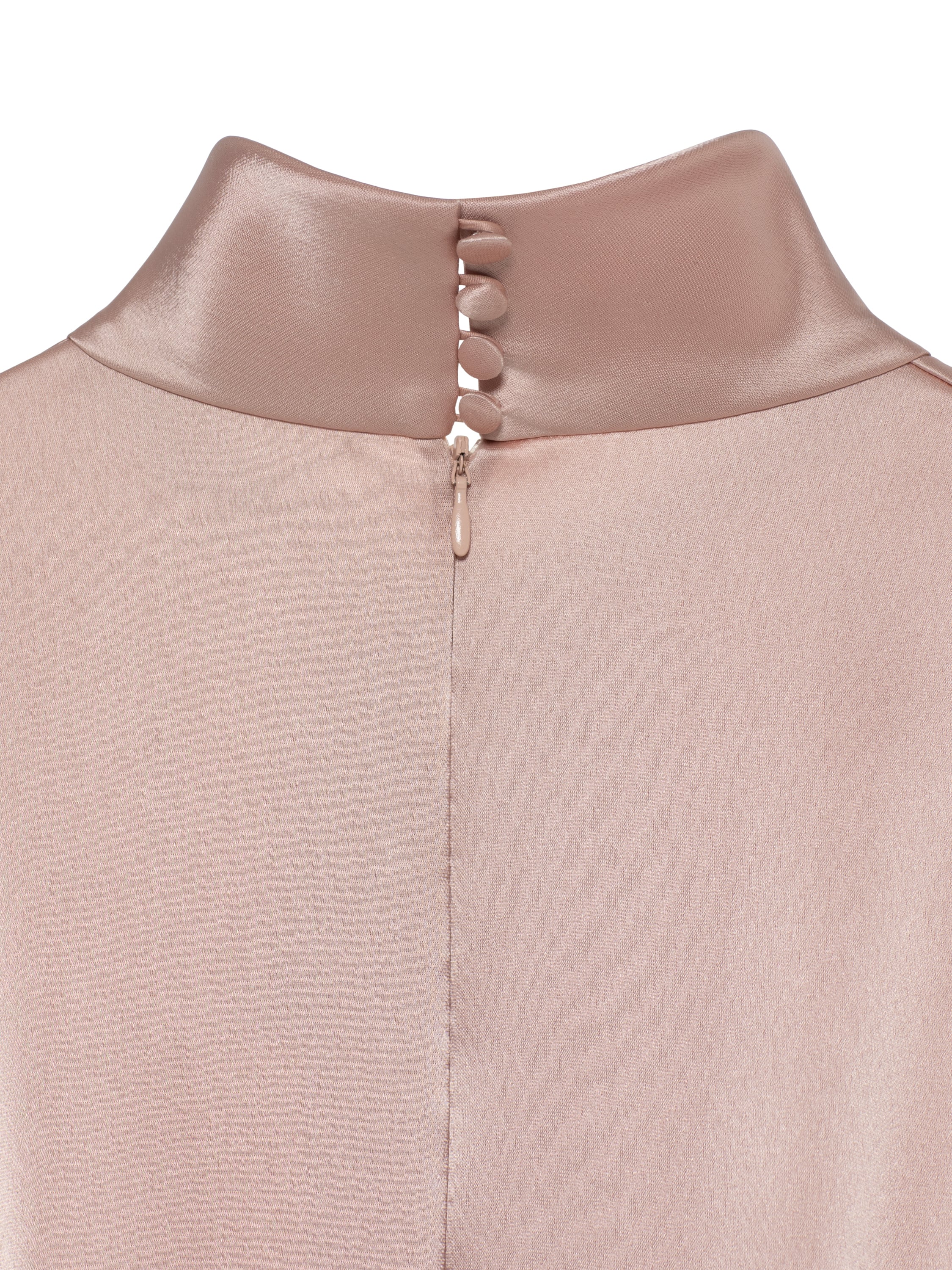 A powder pink silk maxi dress with mink fur cuffs is a delicate look for a special occasion. The minimalist design is complemented by a stand-up collar with draping and tone-on-tone buttons. Fastens with a concealed zip at the back.