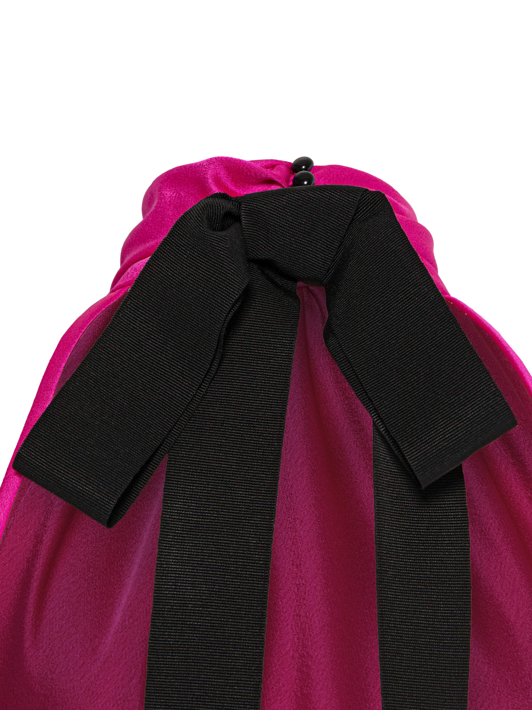 The open-back maxi dress is made of fuchsia-colored artificial silk fabric. The model features a high draped collar. At the back there is a black bow with long grosgrain ribbons. The dress comes with a black leather belt with two buckles.