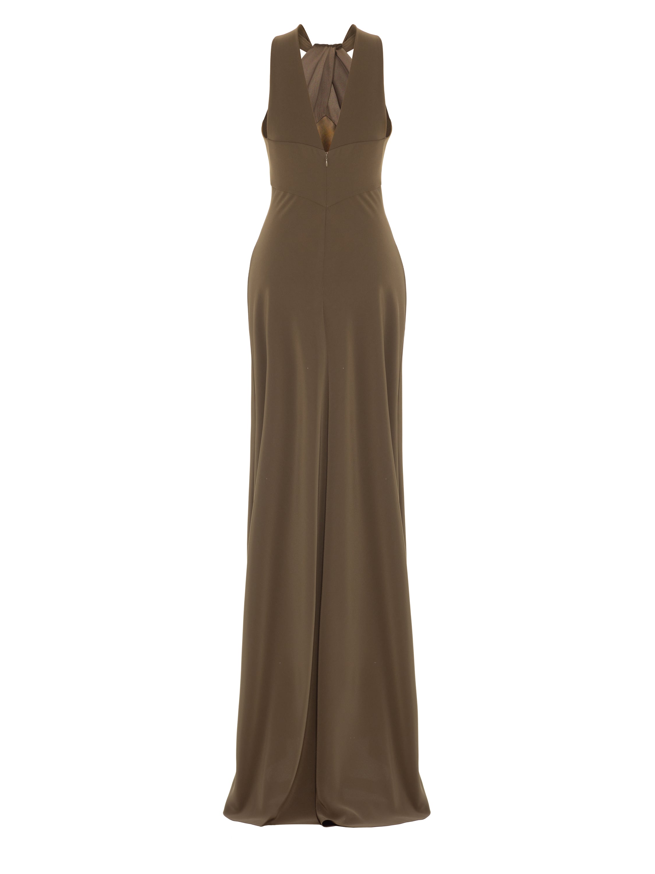 The fitted khaki maxi dress perfectly accentuates the silhouette. The model with an expressive draped bodice is complemented by an open back. It fastens with a concealed zip at the back.