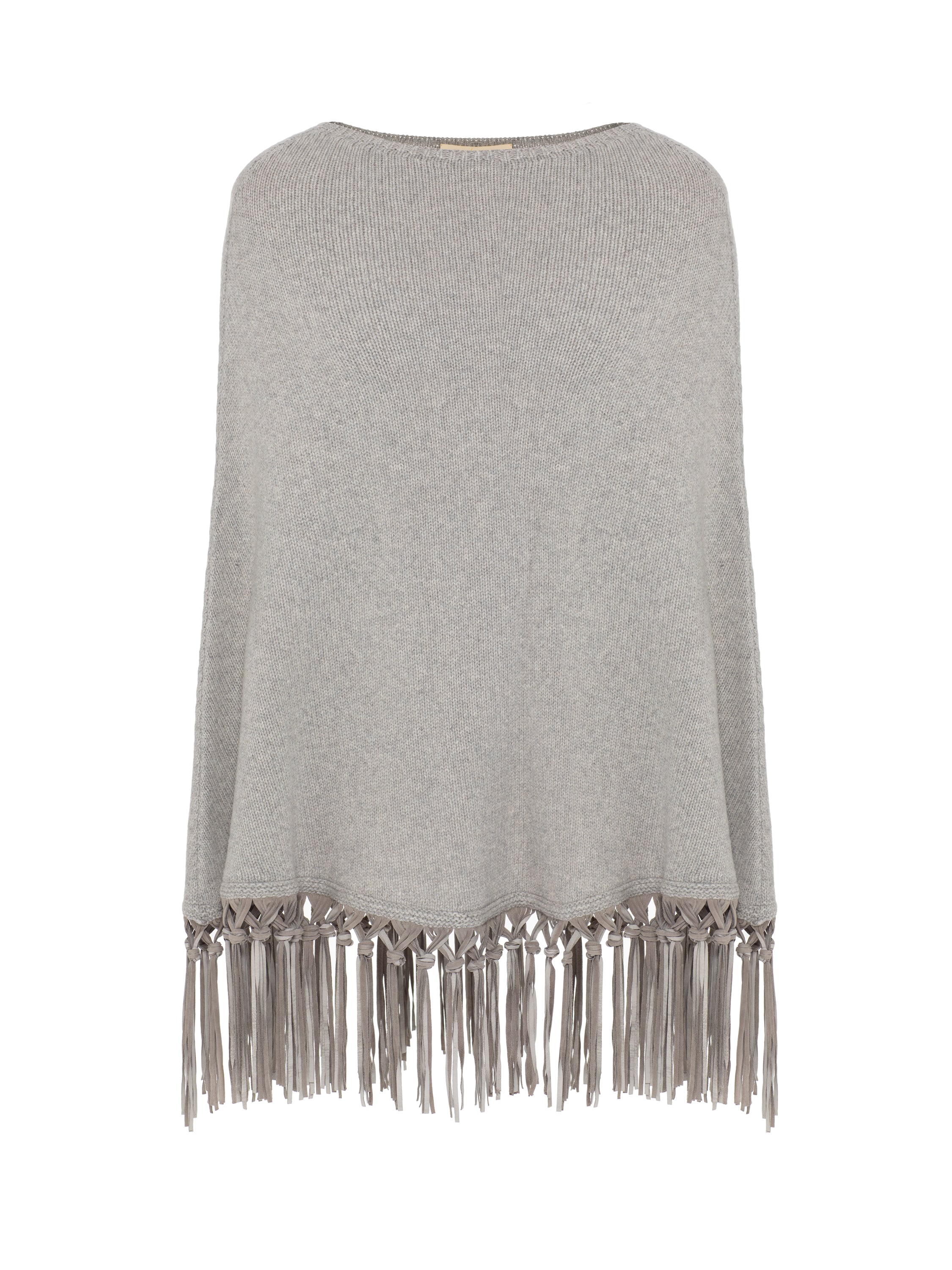 The light gray poncho is made of natural cashmere and complemented with leather fringe.