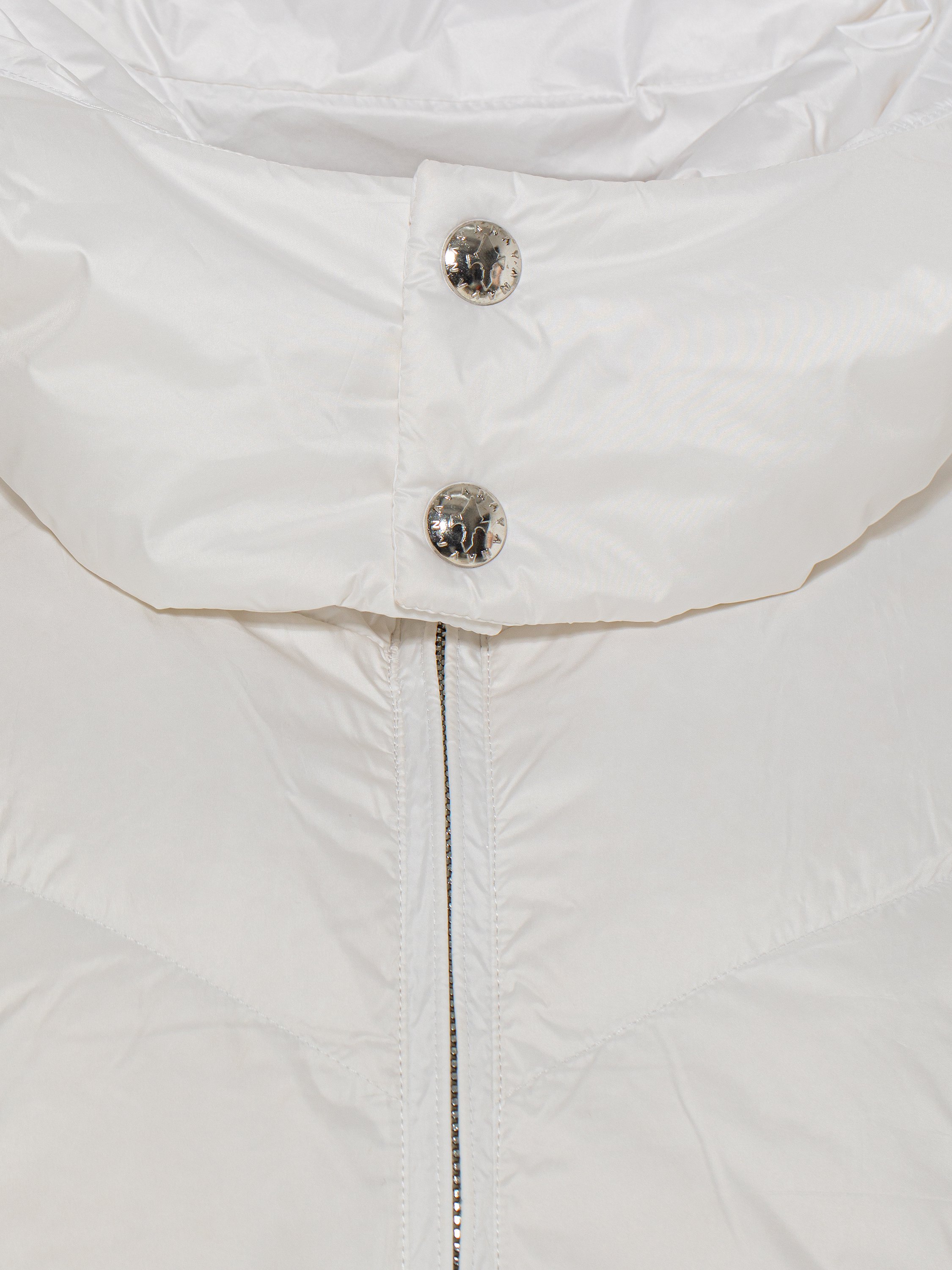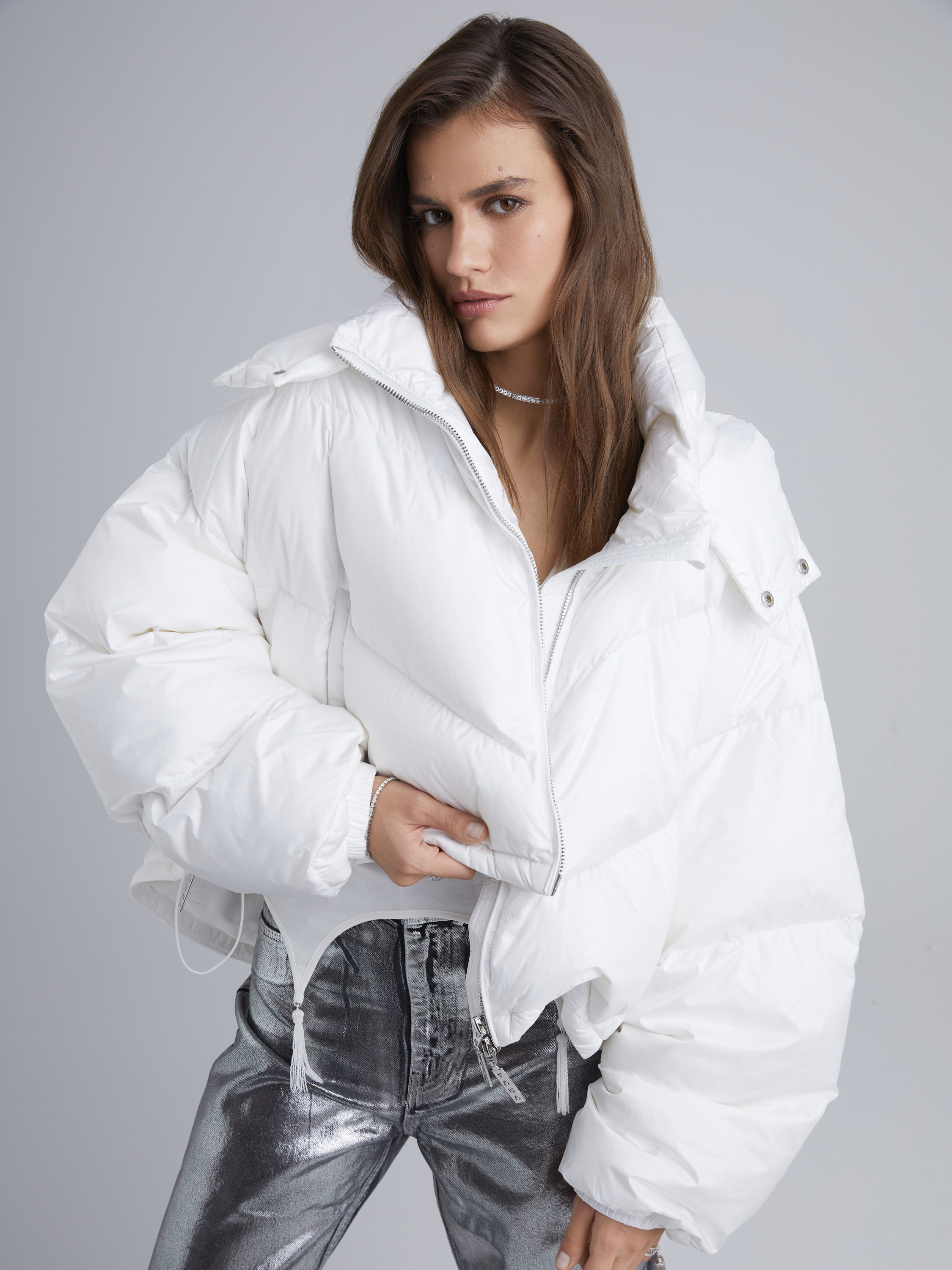 The white cropped down jacket is made of thin fabric with a soft‑touch effect, to which two types of coating are applied: water‑repellent Teflon, which also protects the fabric from splashes and dirt, and a membrane responsible for windproofing and thermoregulation. Premium quality natural goose down makes the jacket voluminous yet ultra‑light. The model is complemented by a hood, two side welt pockets and elasticated cuffs. It fastens with a front zipper. This cozy down jacket will keep you warm even in the coldest winter (down to -35°C).