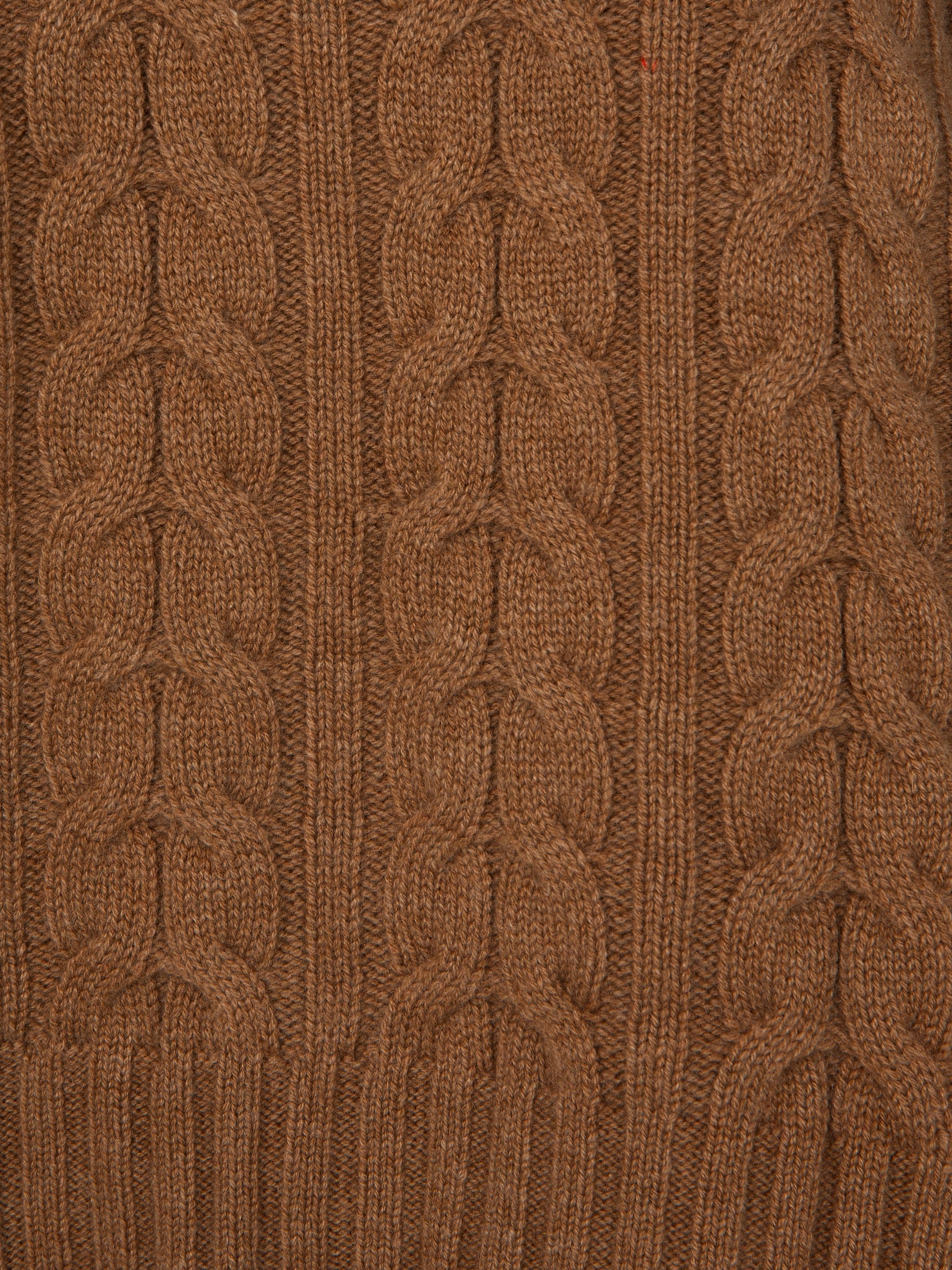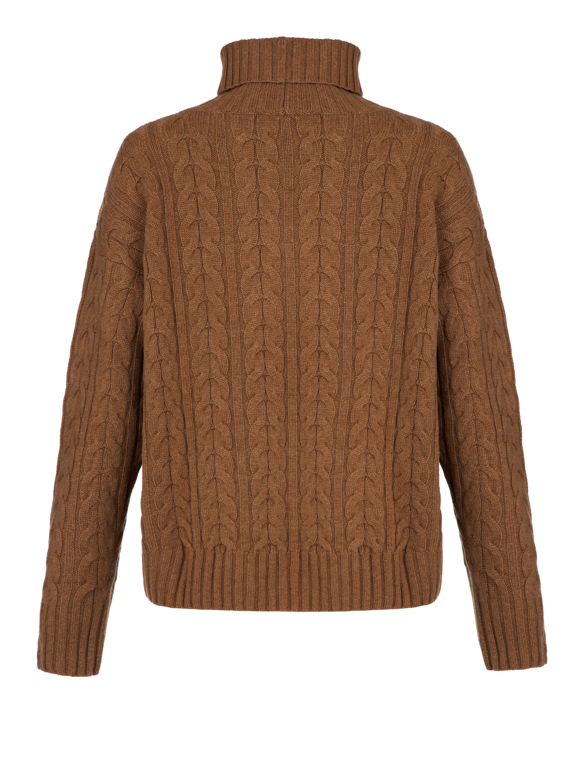 A cozy cable-knit sweater is made of natural cashmere in a trendy caramel shade. The high-neck design protects from wind and cold and gives its wearer a feeling of warmth even in the most inclement weather.