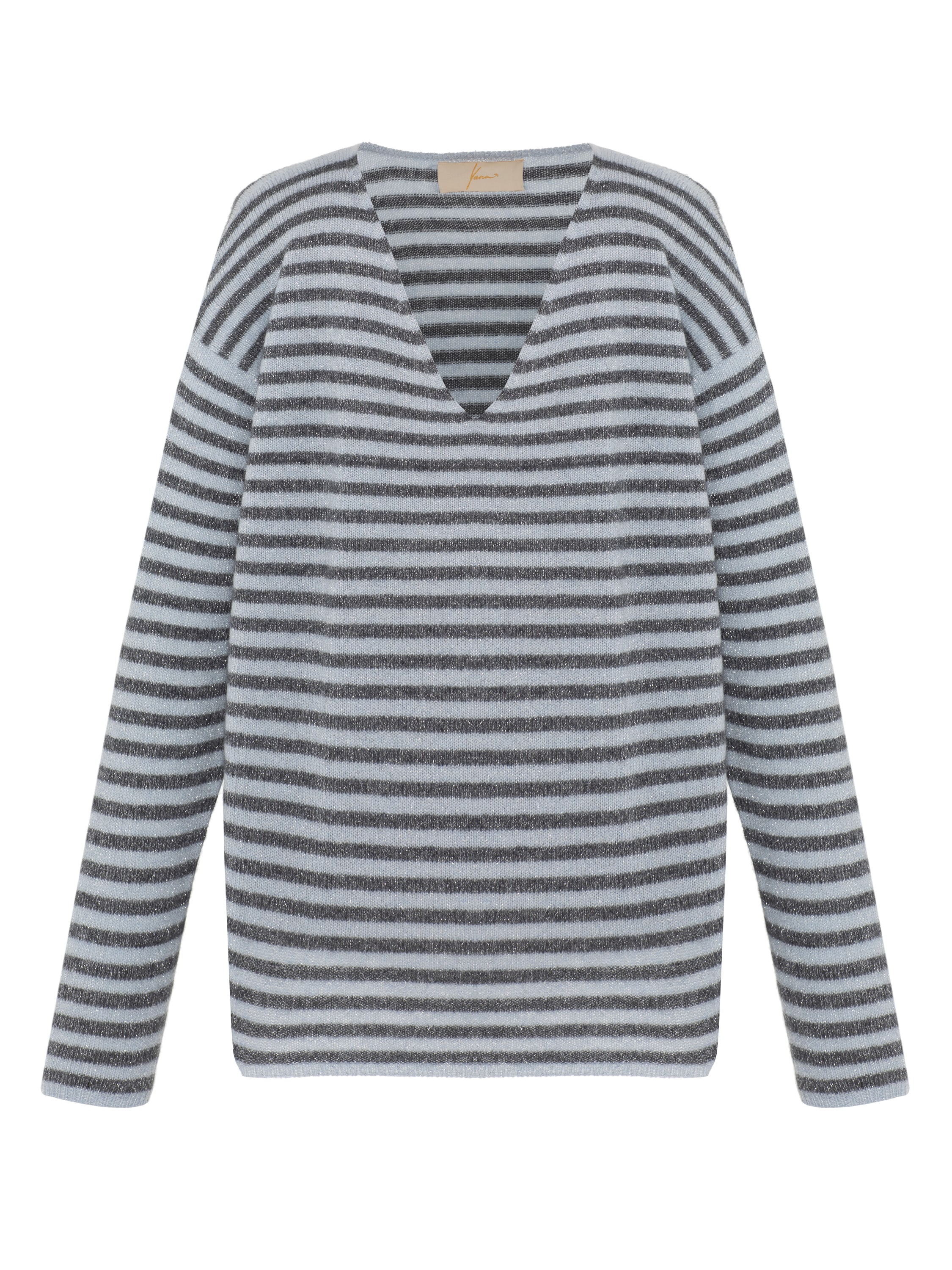 The gray striped pullover is made of natural cashmere with lurex. The model features a V-neck and long sleeves.
