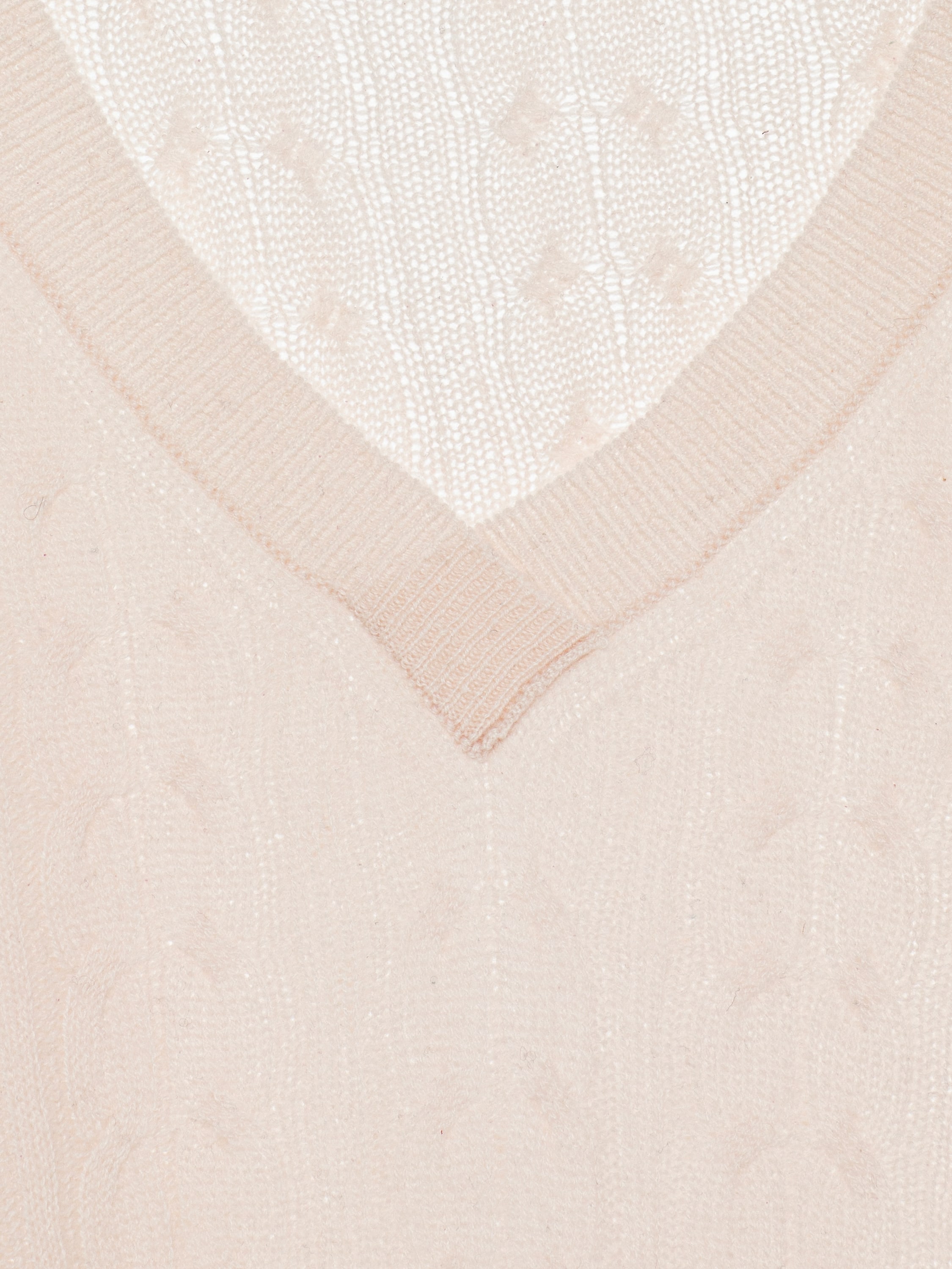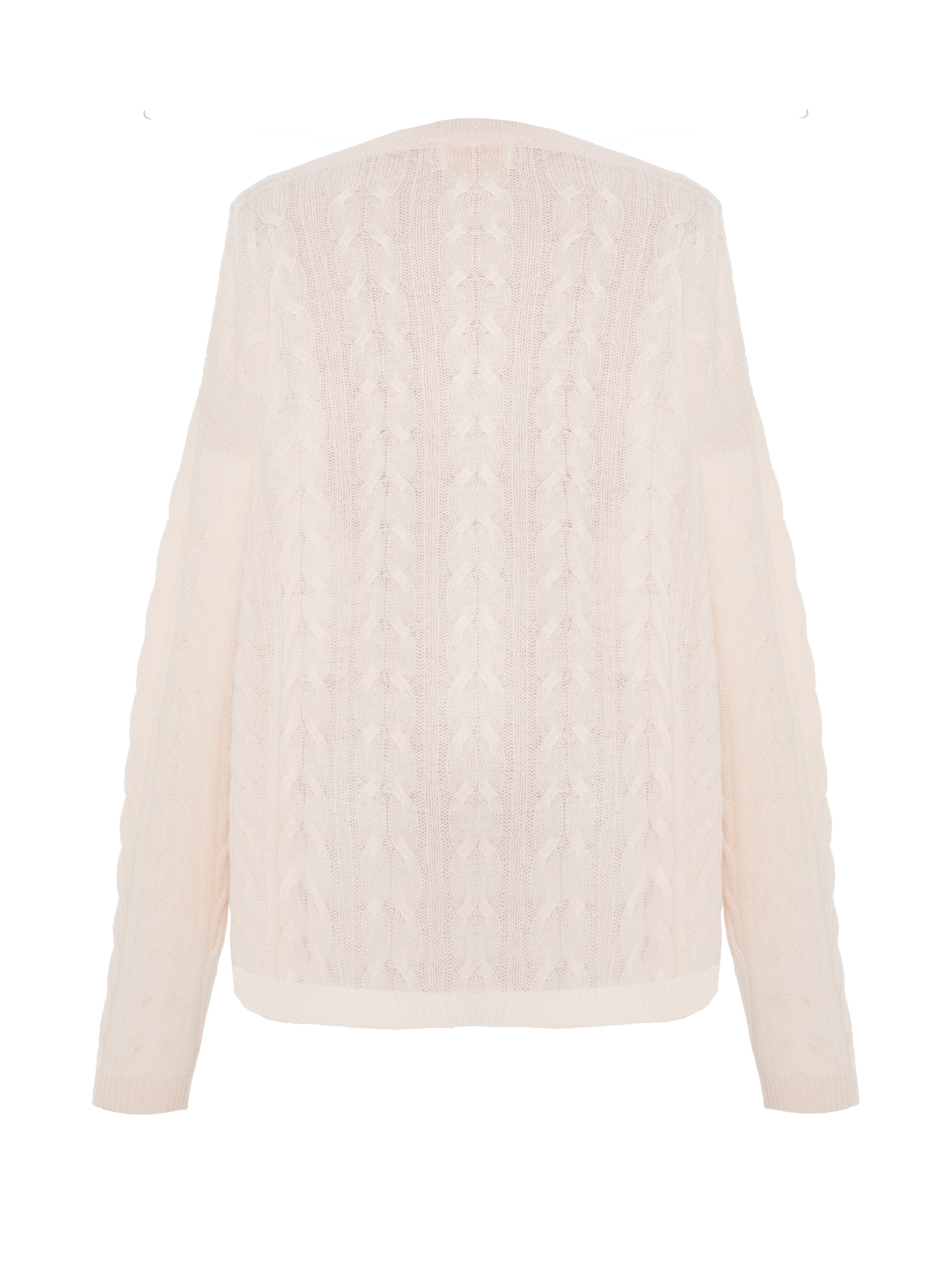 A light pink V-neck pullover is hand-knitted in a single thread from soft cashmere yarn. The textured cable knit pattern makes the basic model cozy and delicate.