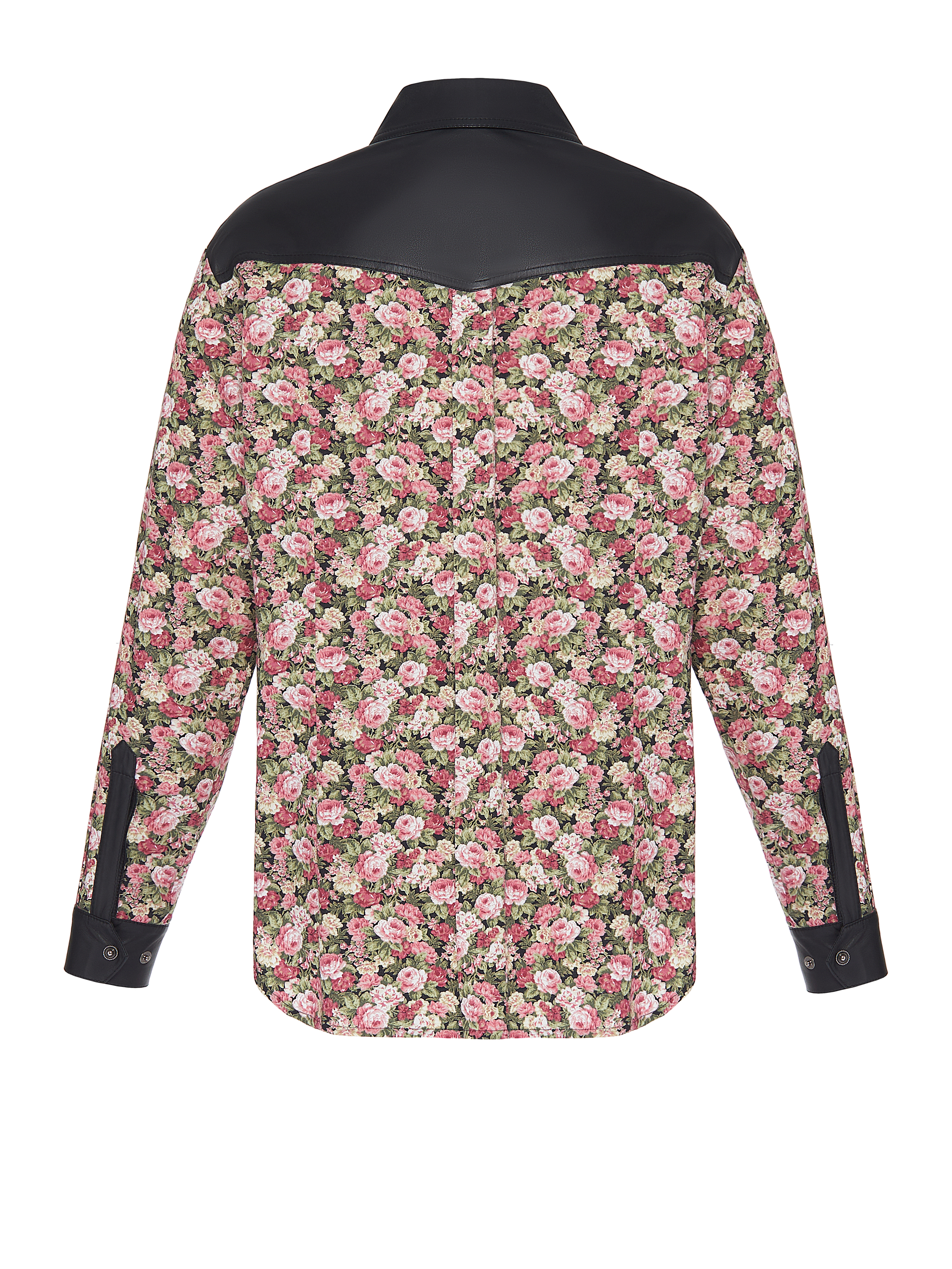 The pink shirt with a floral print is made of natural cotton and complemented by a black leather yoke and shaped leather flaps on the pockets. The model fastens with snaps at the front.