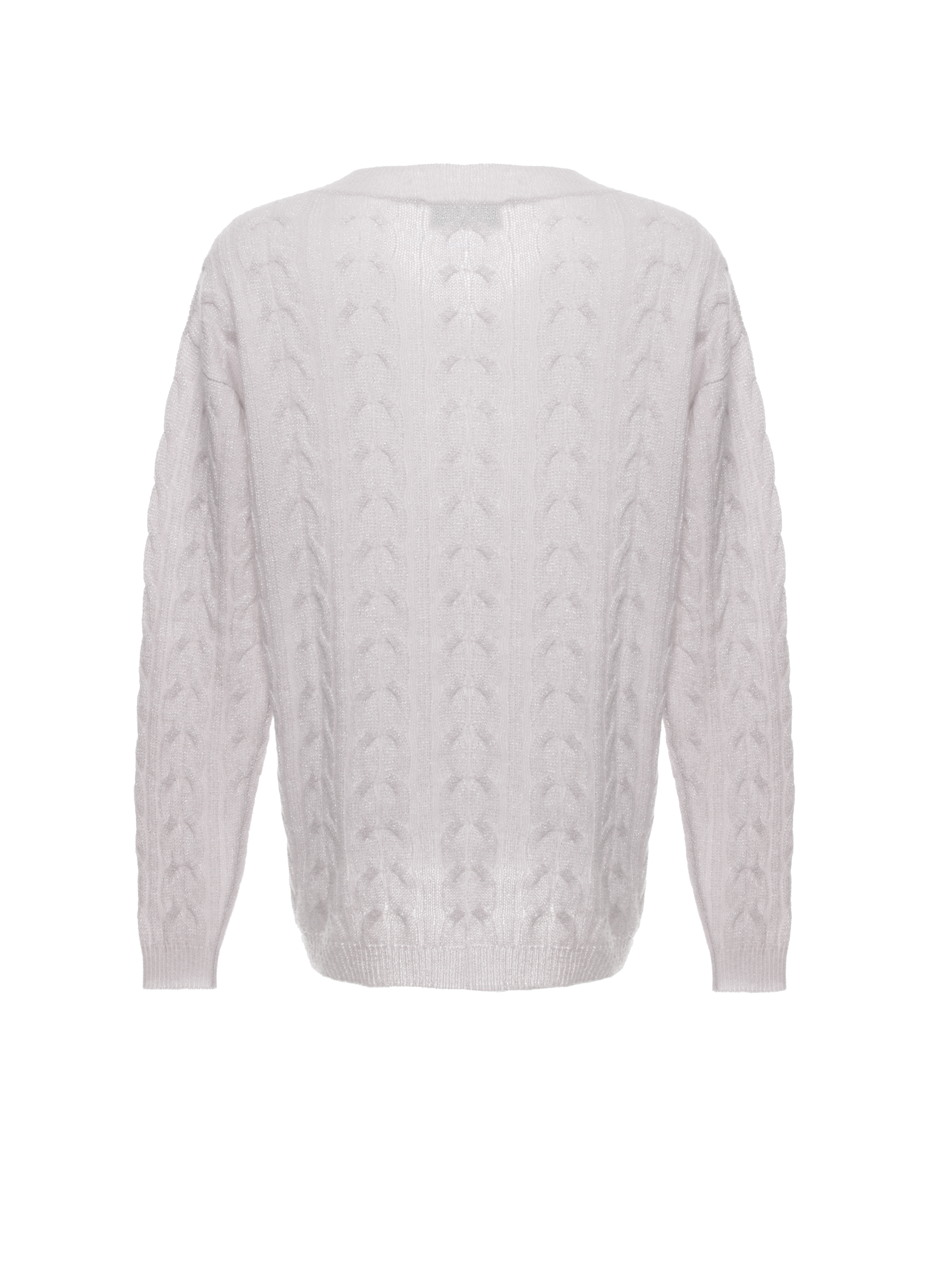 A cozy pink cable knit pullover made of natural cashmere with lurex and complemented with a V-neckline.