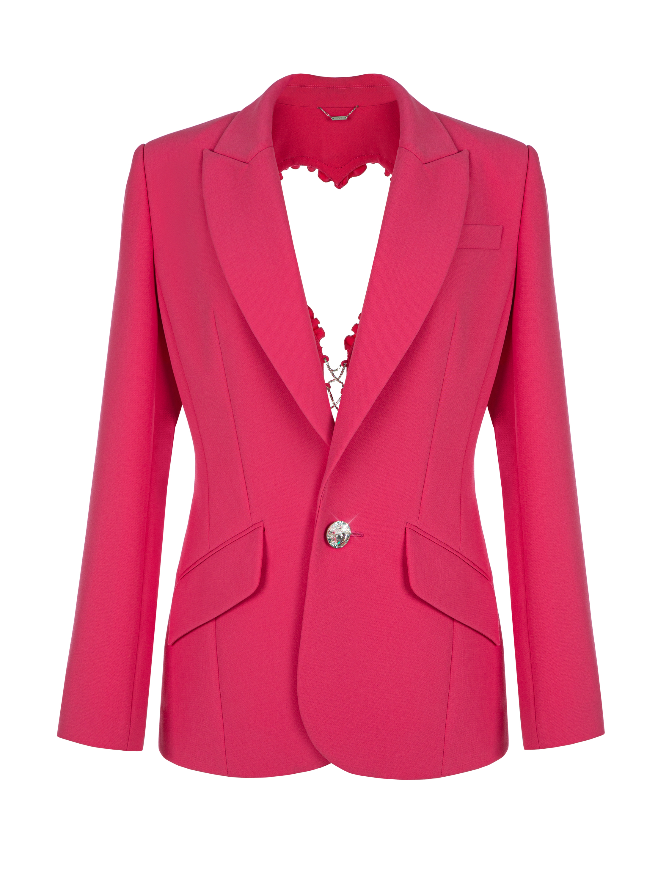 Bright pink single-breasted blazer with silk lining and a notched collar. The piece is complemented by a heart-shaped cutout on the back. The cutout is trimmed with tone-on-tone ruffles and lacing made of shimmering rhinestones. Fastens with a large crystal button.