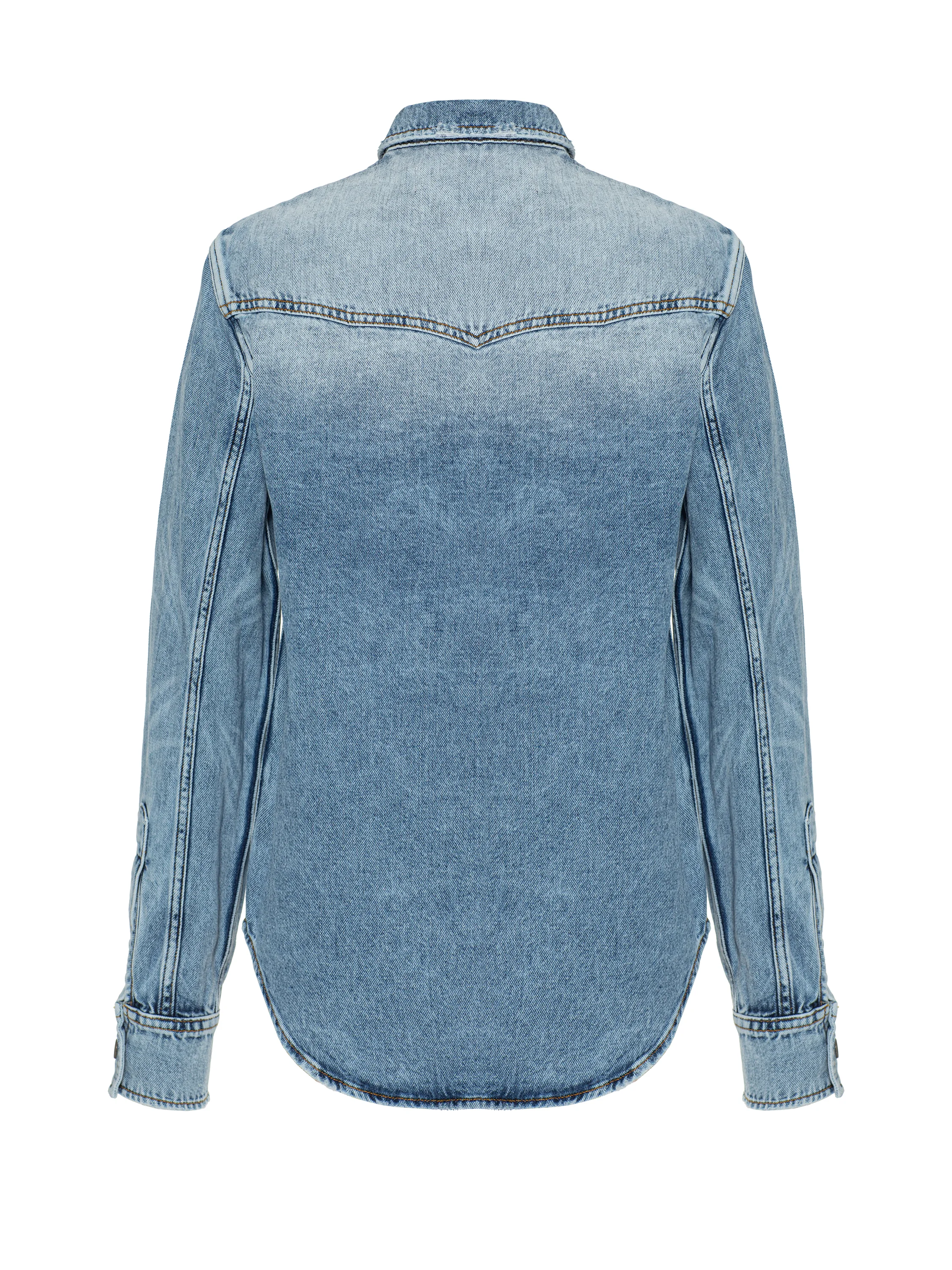 An oversized light blue denim shirt with distressed details. A classic model with a turn-down collar and large patch pockets on the chest. Pair it with your favorite jeans and cowboy boots from Yana Dress.