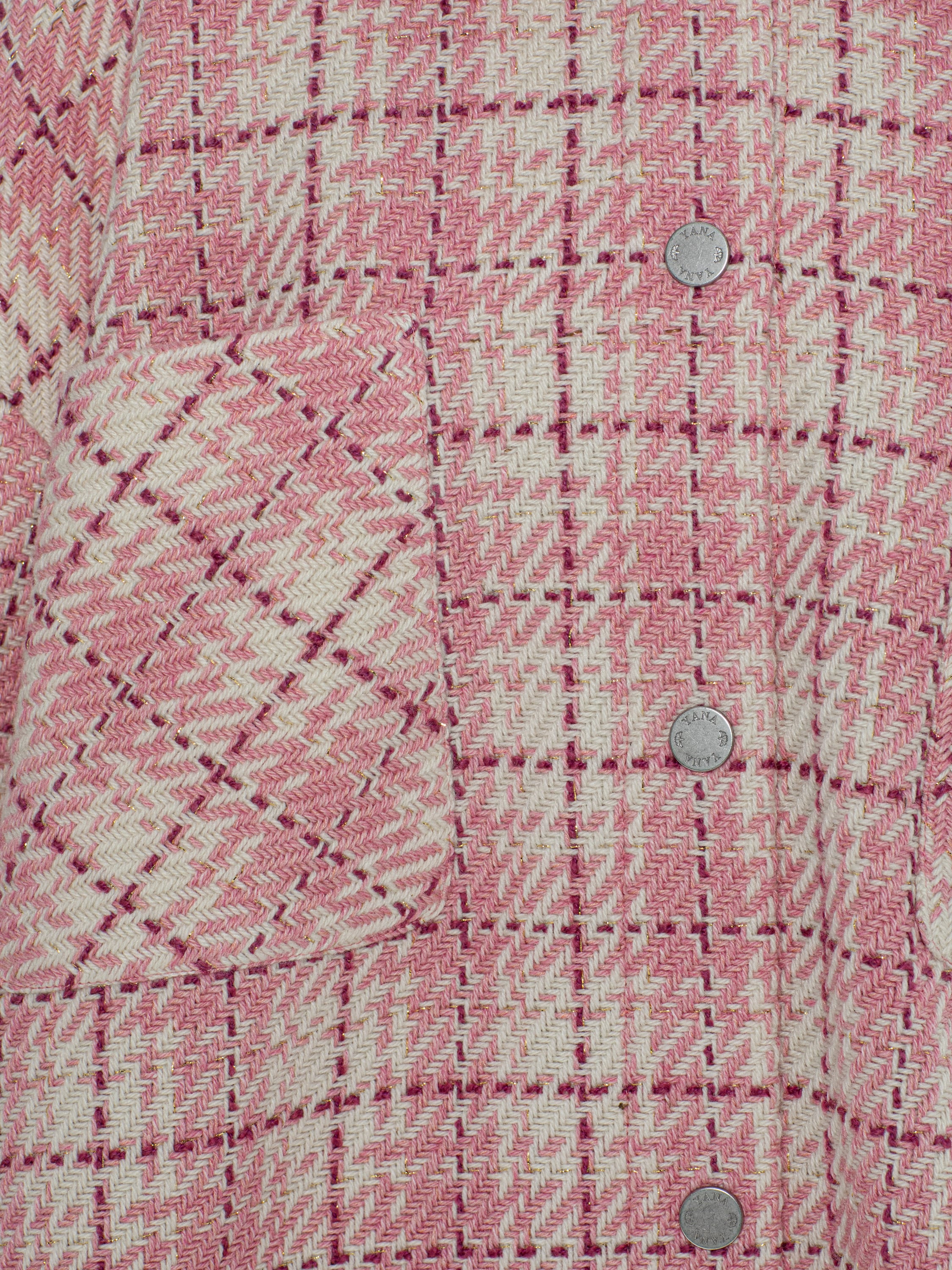 The loose pink checked shirt is made of tweed fabric. Snap-button fastening at the front. Two patch pockets on the chest at the front.