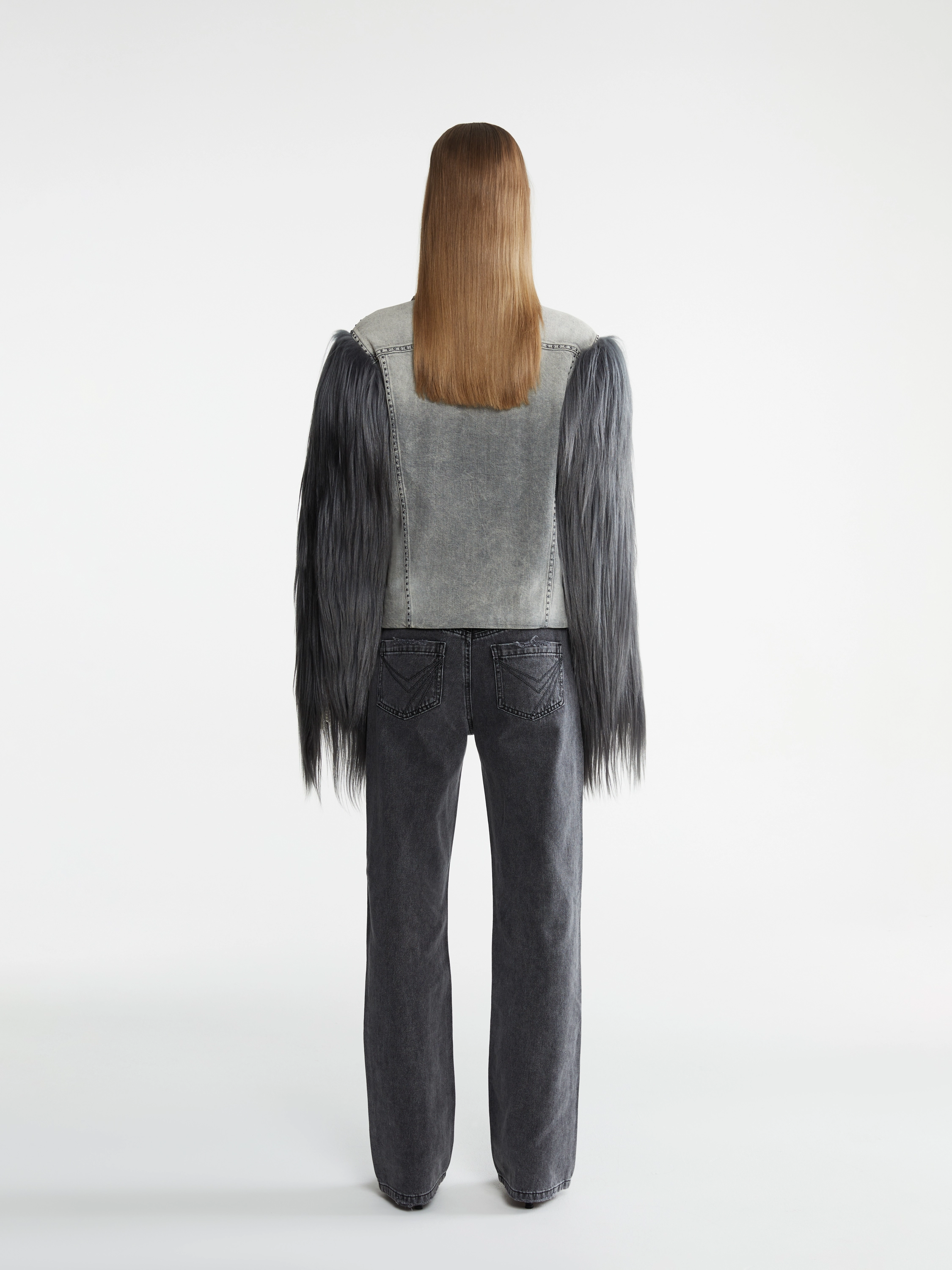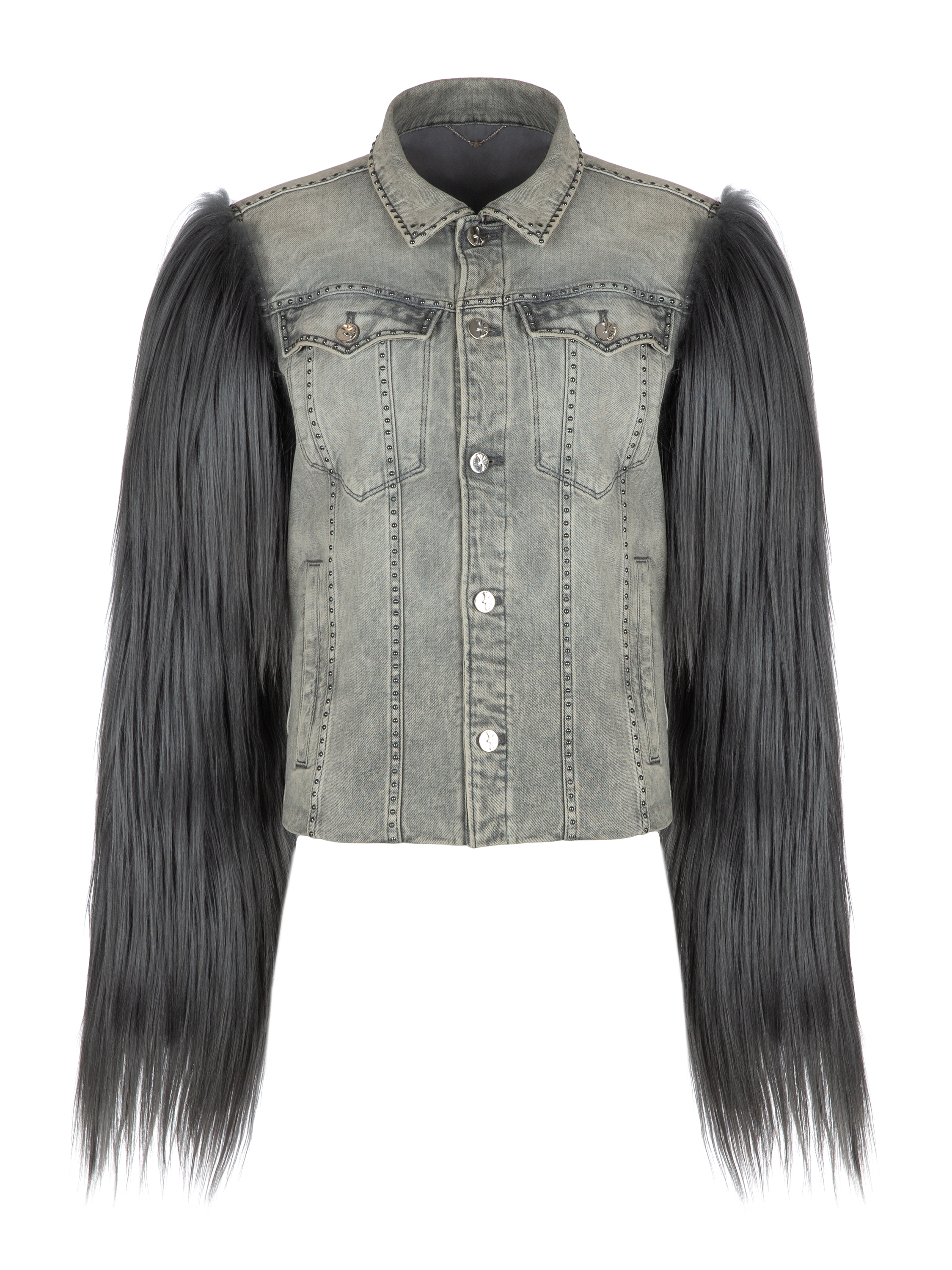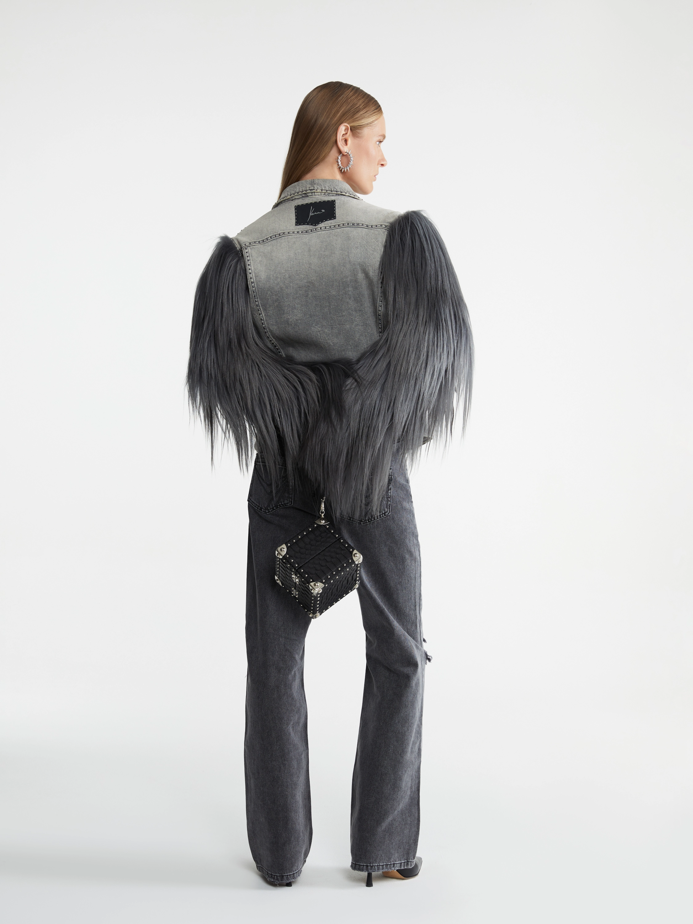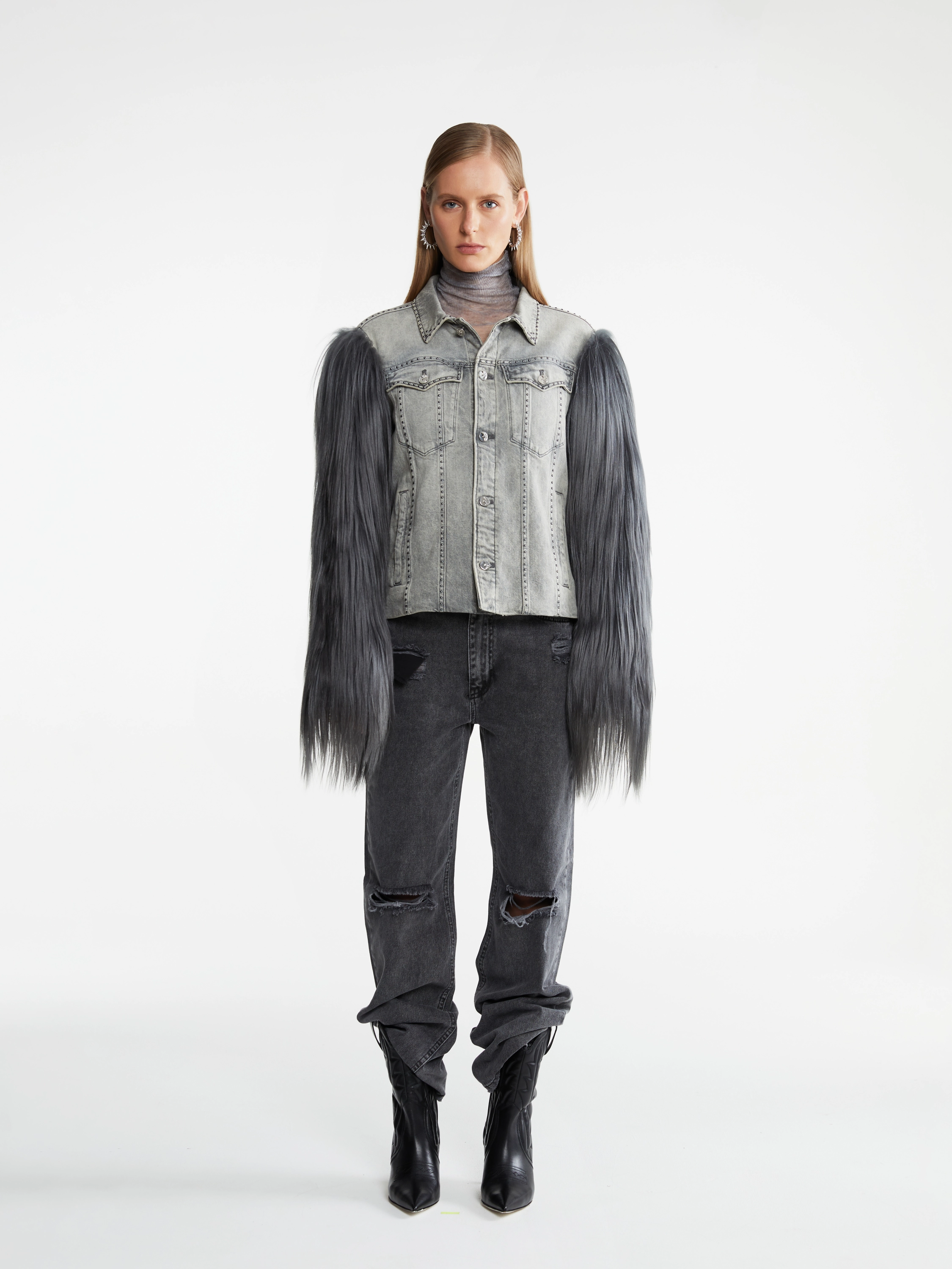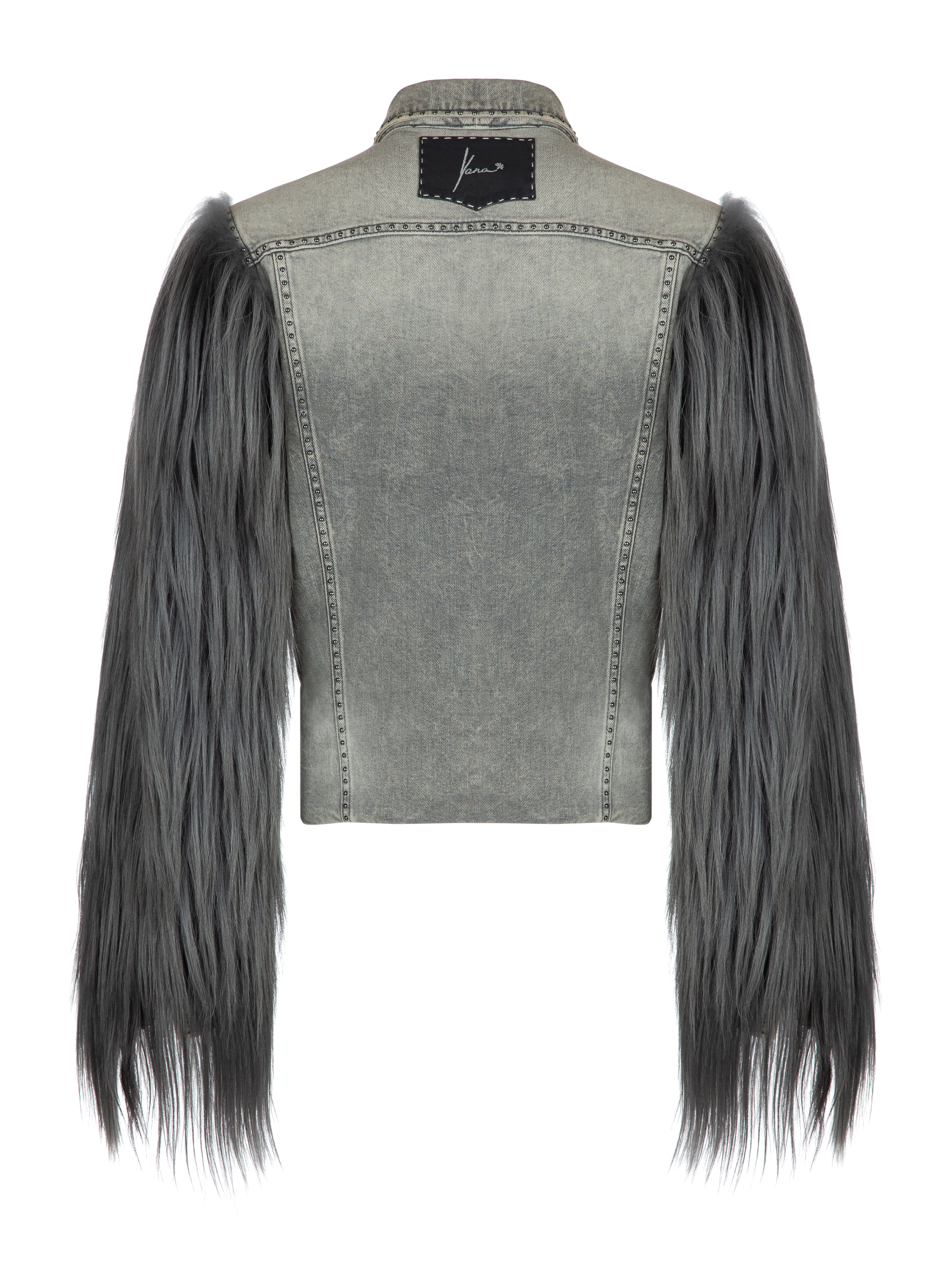 The denim jacket made of grey denim is complemented by decorative studs along the seams. The sleeves are made of natural graphite-colored yak fur. Two patch pockets on the chest and two welt pockets on the sides. The model fastens with silver-tone buttons featuring a cornflower, and has a leather brand logo patch on the back.