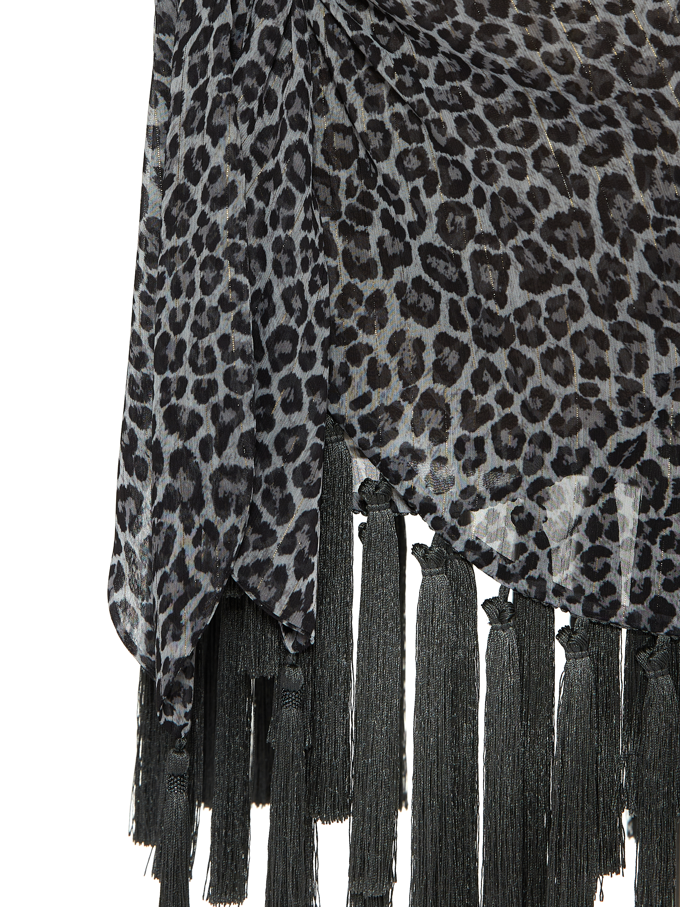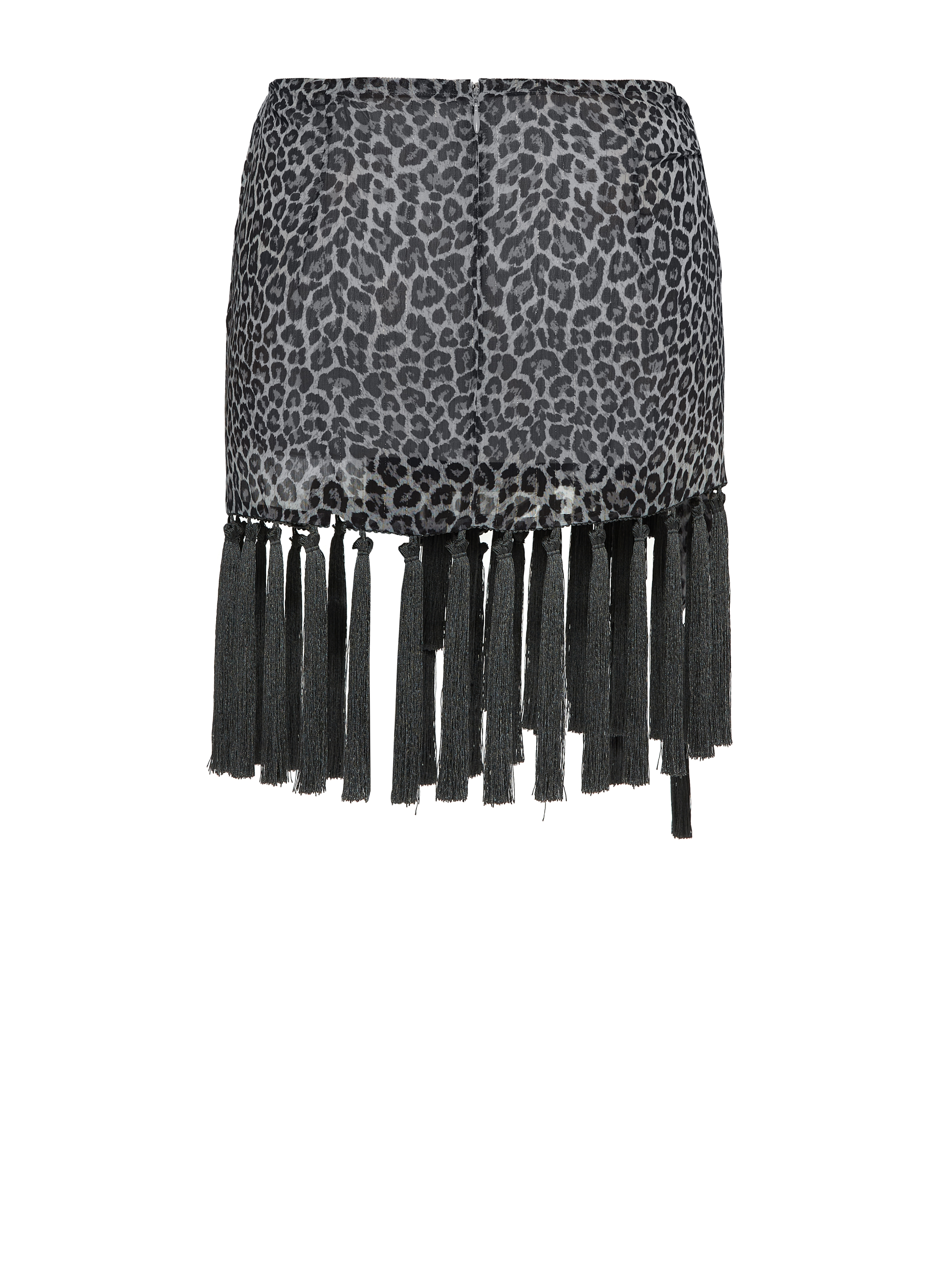 The gray wrap mini skirt is made of natural silk with a leopard print and is complemented by matching fringe along the hem. Fastens with a zip at the back.