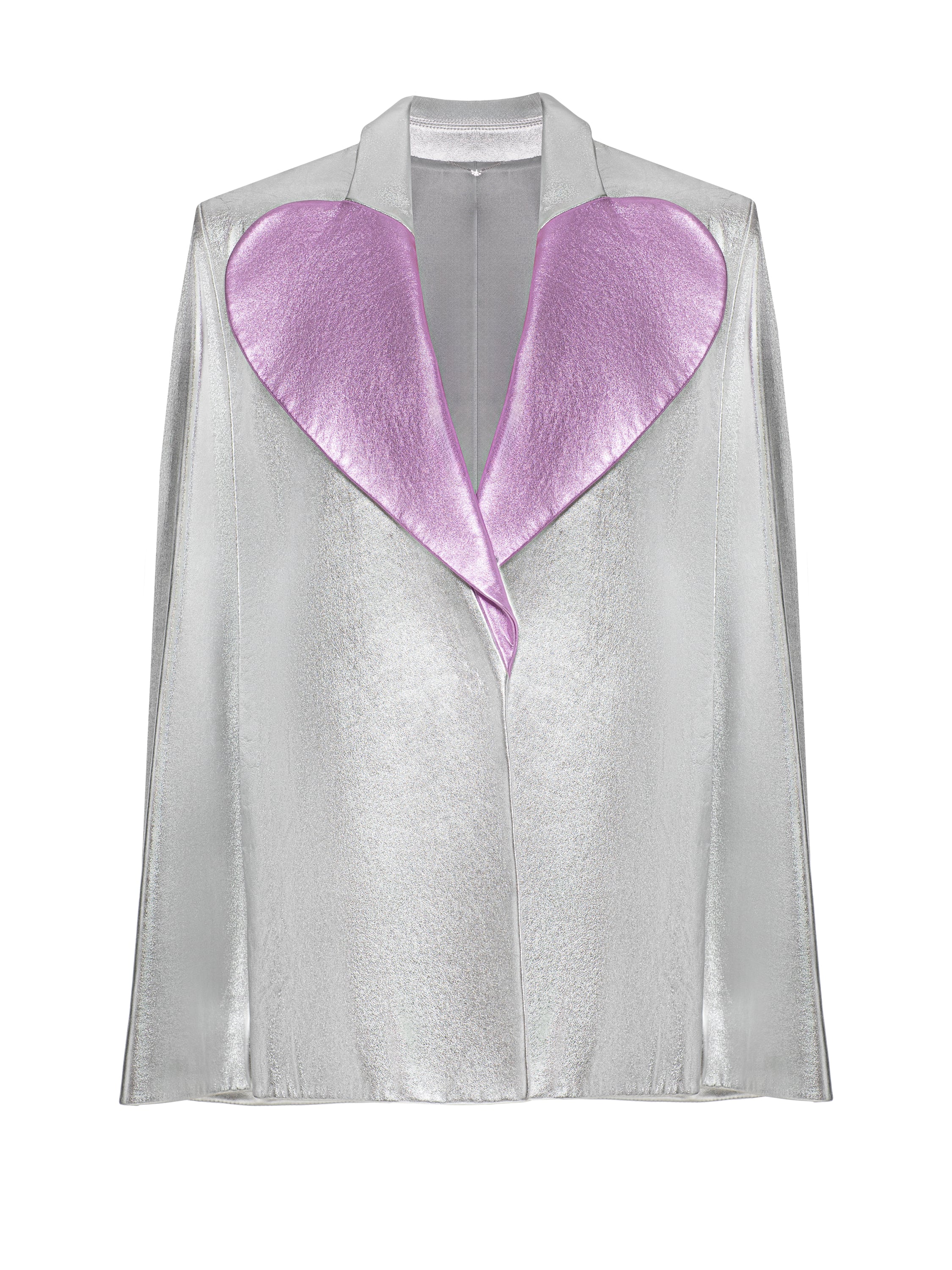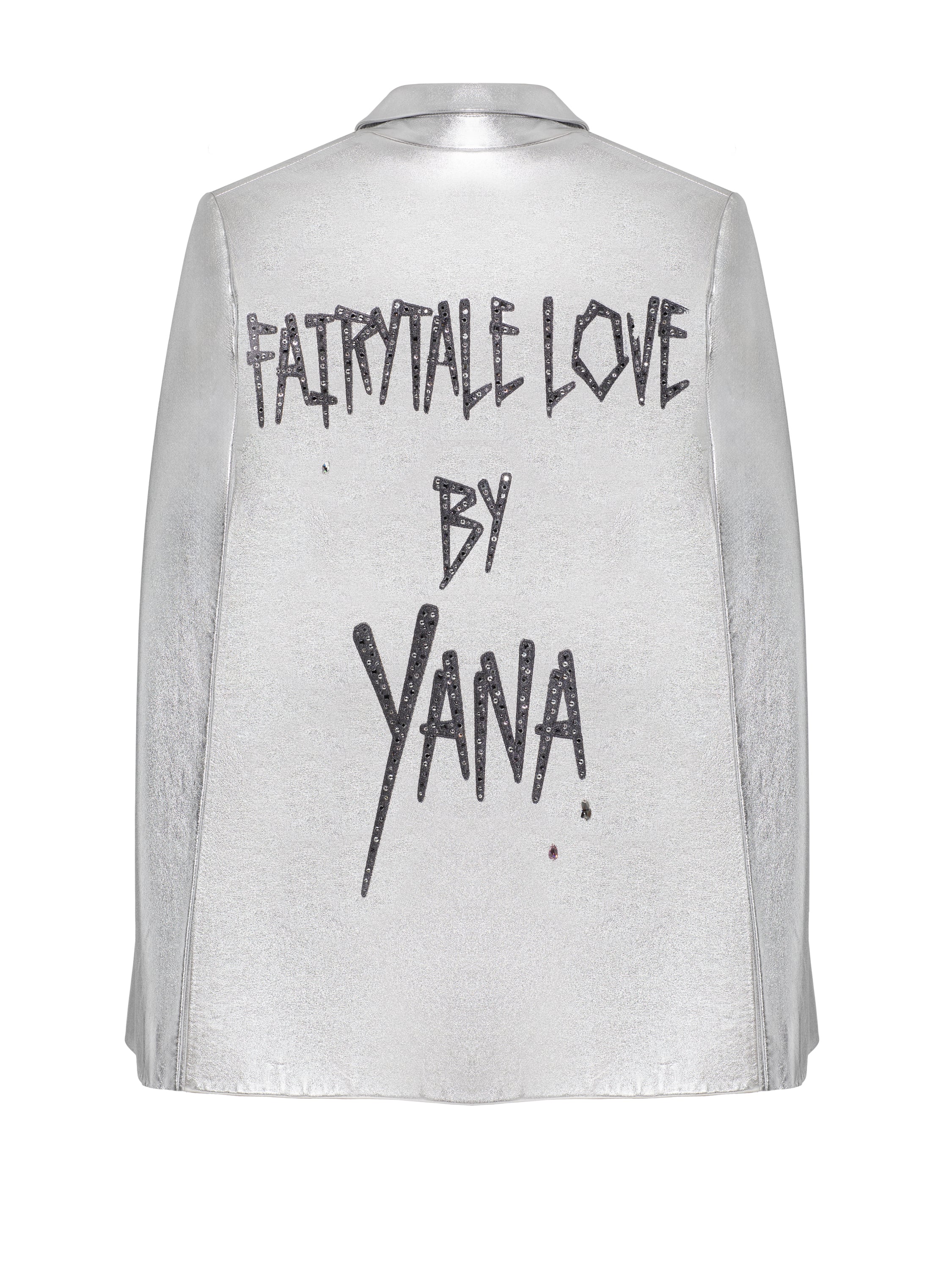 The silver cape is made of genuine leather and complemented by lilac heart-shaped lapels. On the back: black embroidered Fairytale Love by Yana inscription with Swarovski crystals.