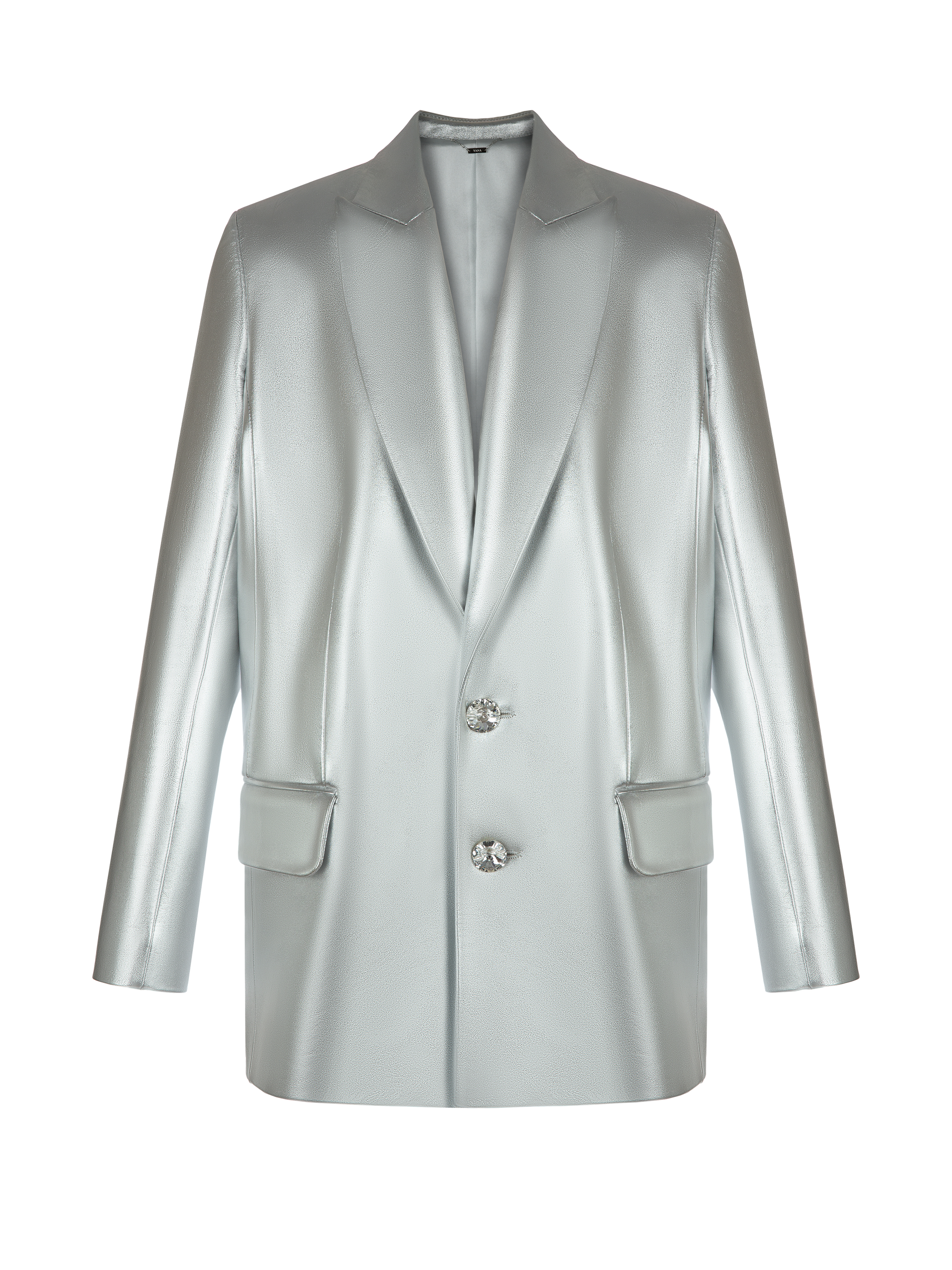 The single-breasted blazer is made of textured silver-colored leather with a large grain. Classic straight cut, silk lining and notched lapel collar. Fastens with two large crystal-shaped buttons.