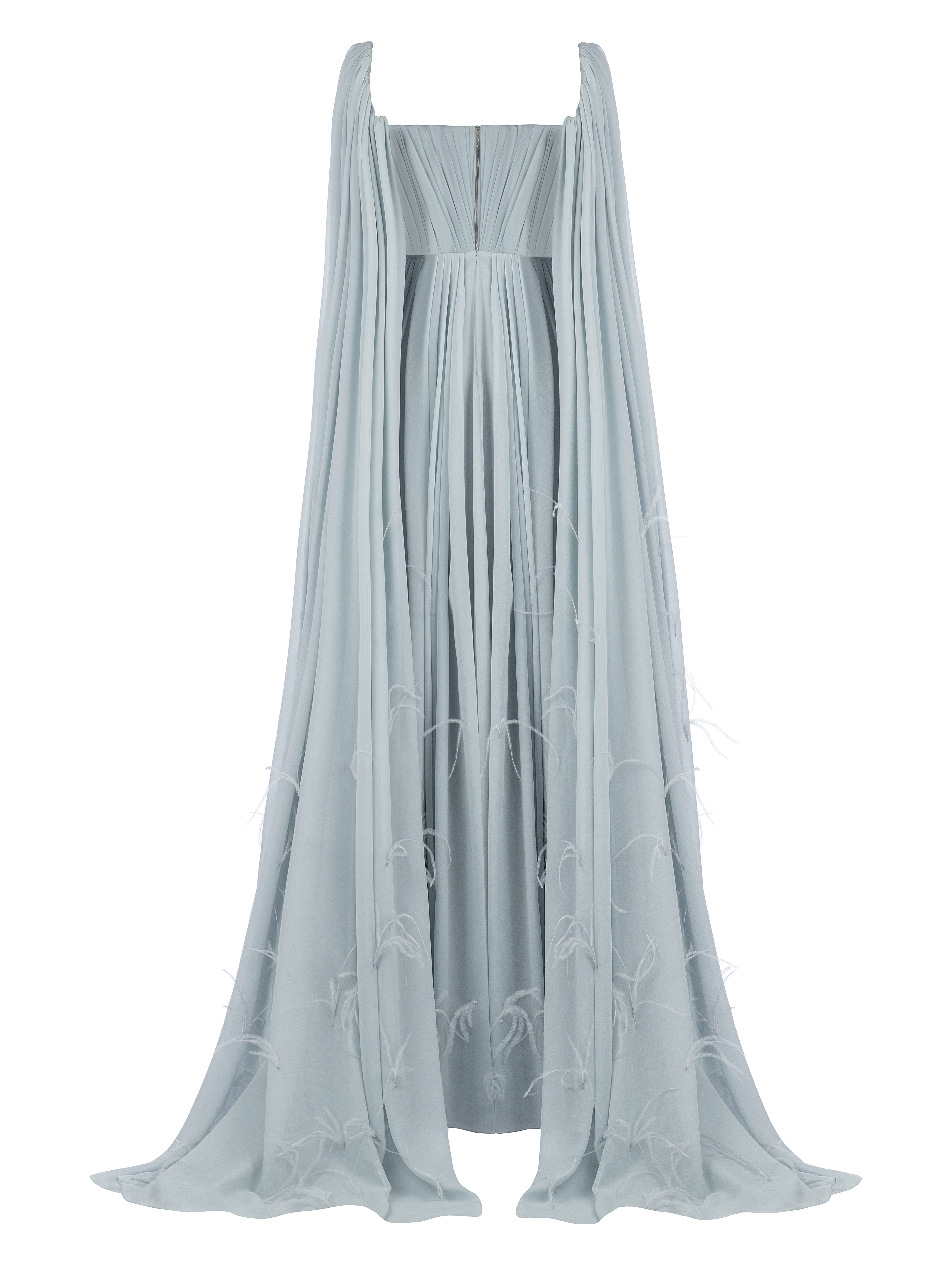 A grey-blue maxi dress with bare shoulders is made of draped chiffon. Flowing floor-length wing sleeves turn into a spectacular train. The hem of the dress is decorated with feathers.