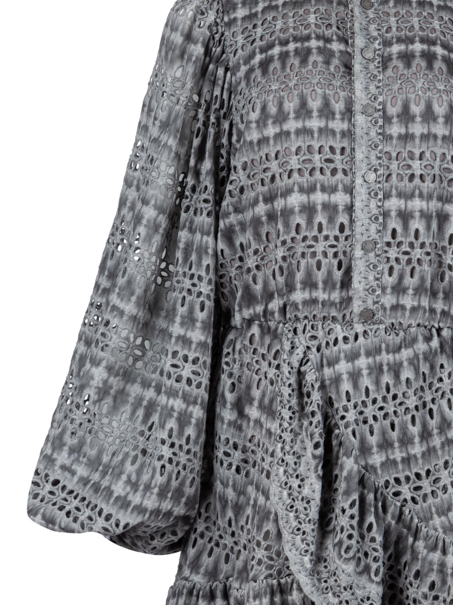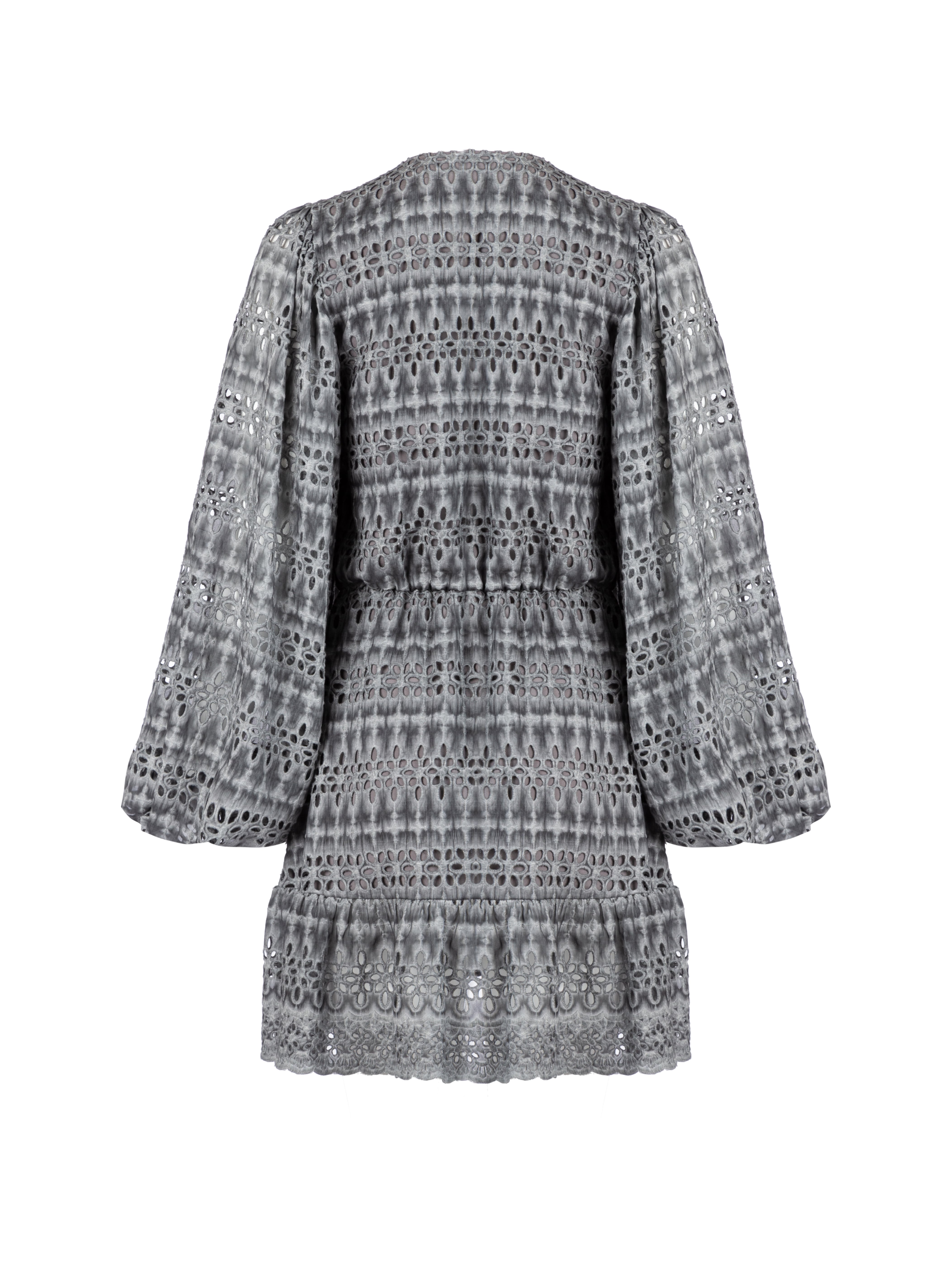The grey mini dress is made of cotton fabric with perforation. The flowing silhouette is accentuated by long puff sleeves and a ruffle at the hem.