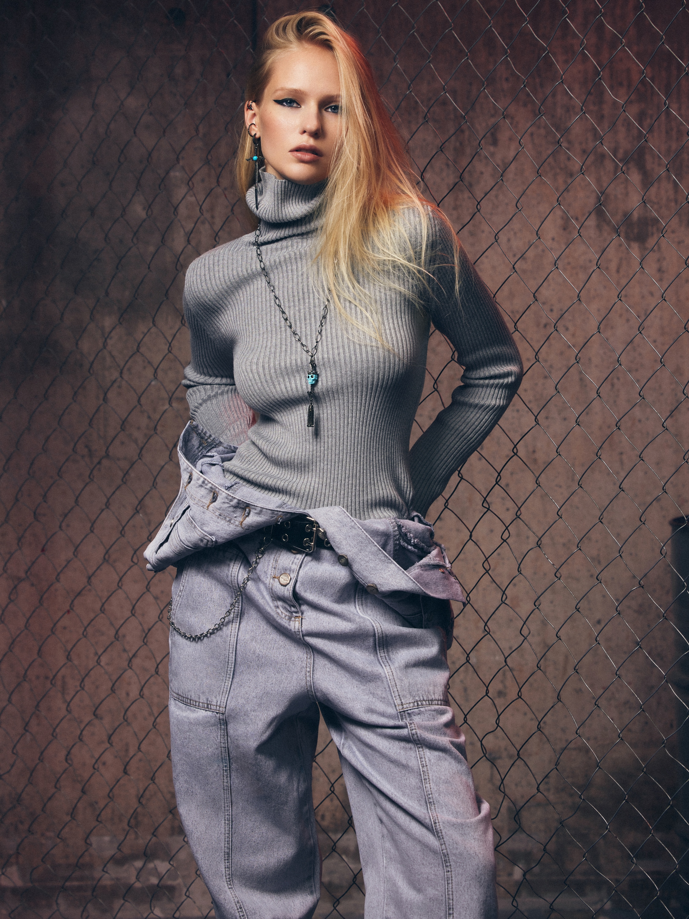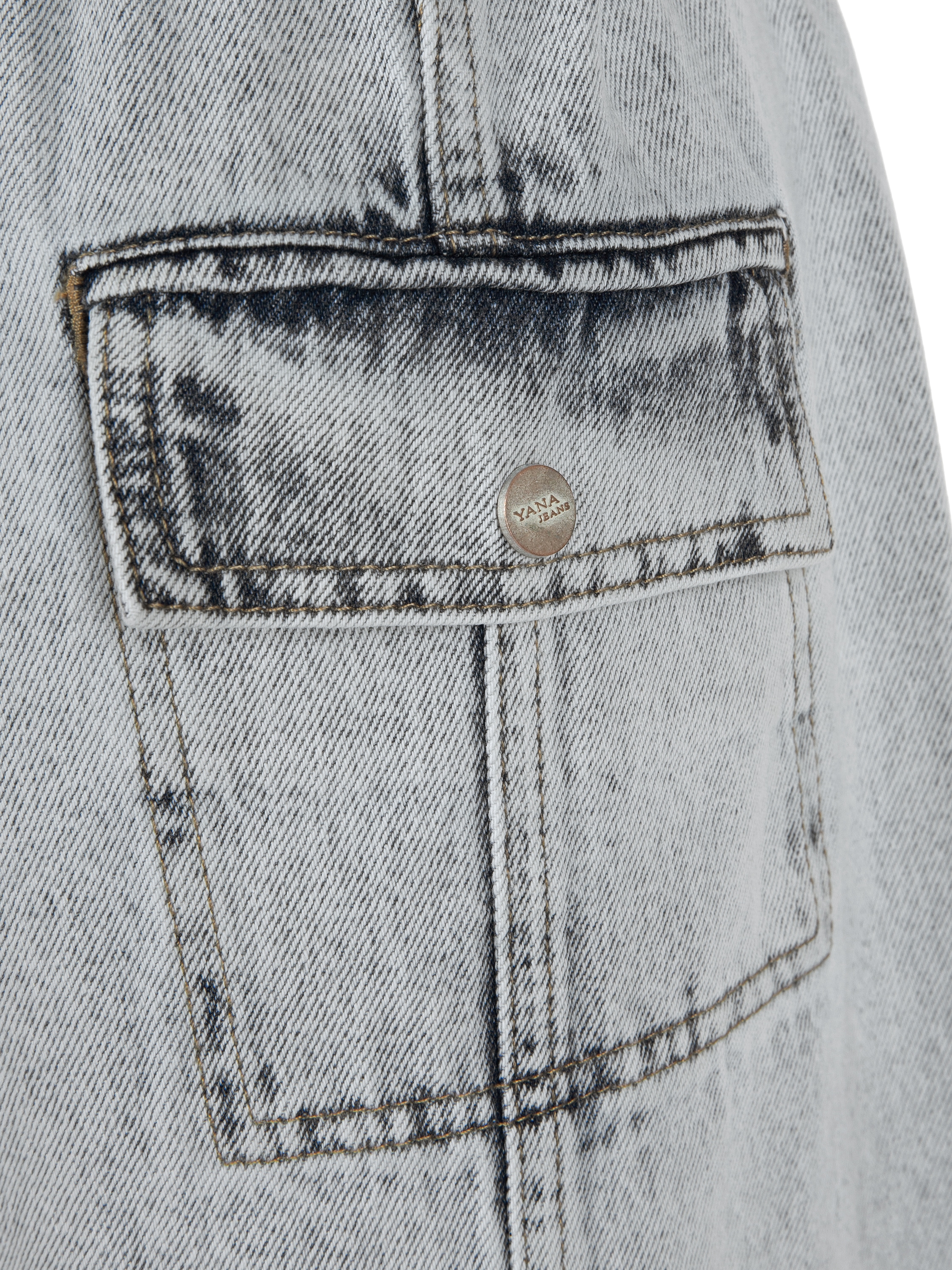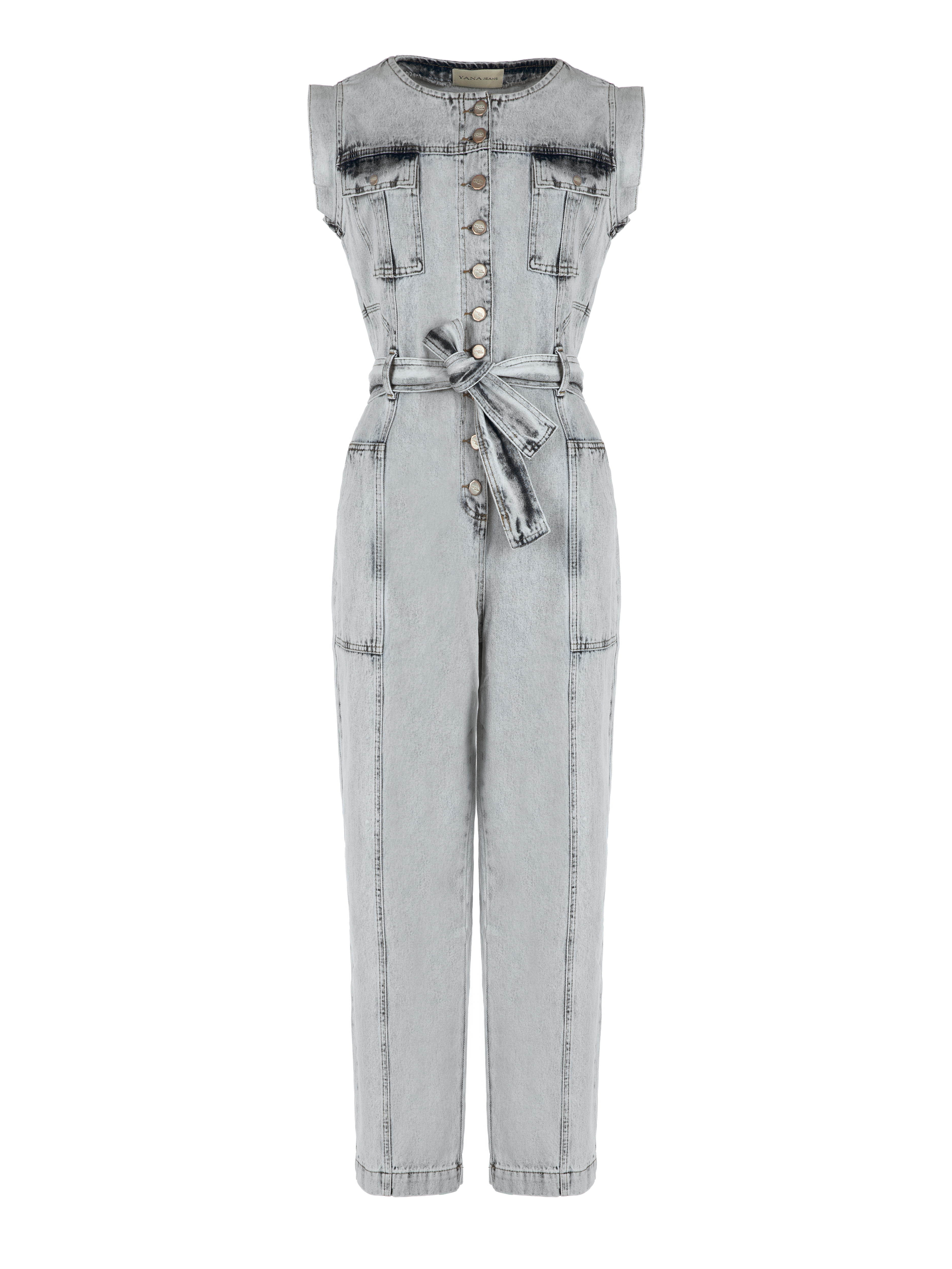 The light grey sleeveless jumpsuit is made of denim. The model fastens with front buttons and is complemented by a belt and patch pockets at the front and back. Pair with Yana Shoes footwear and Yana Jewellery accessories.
