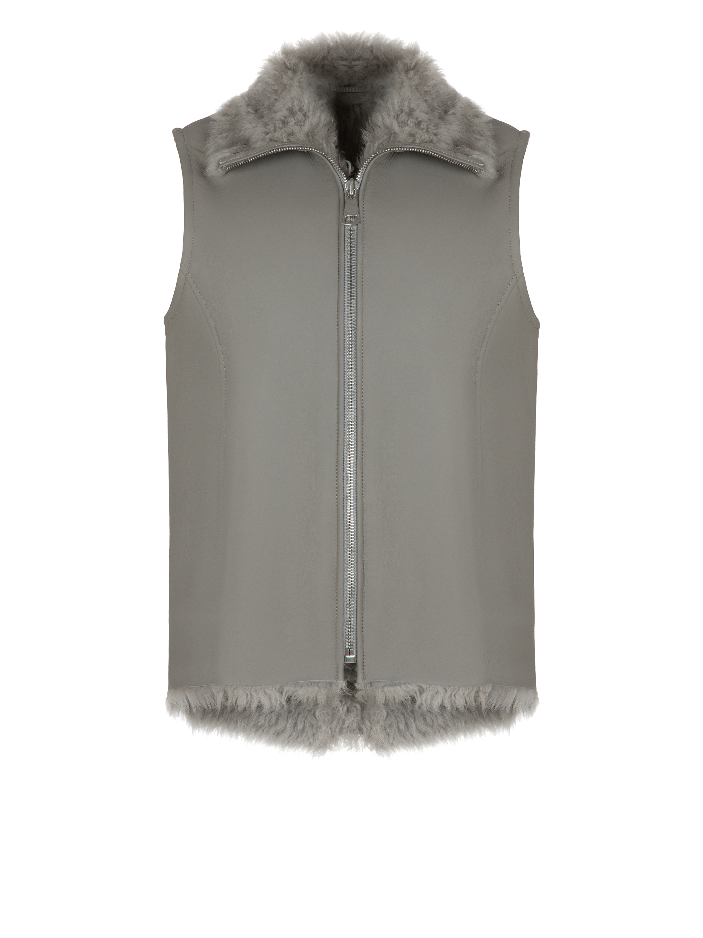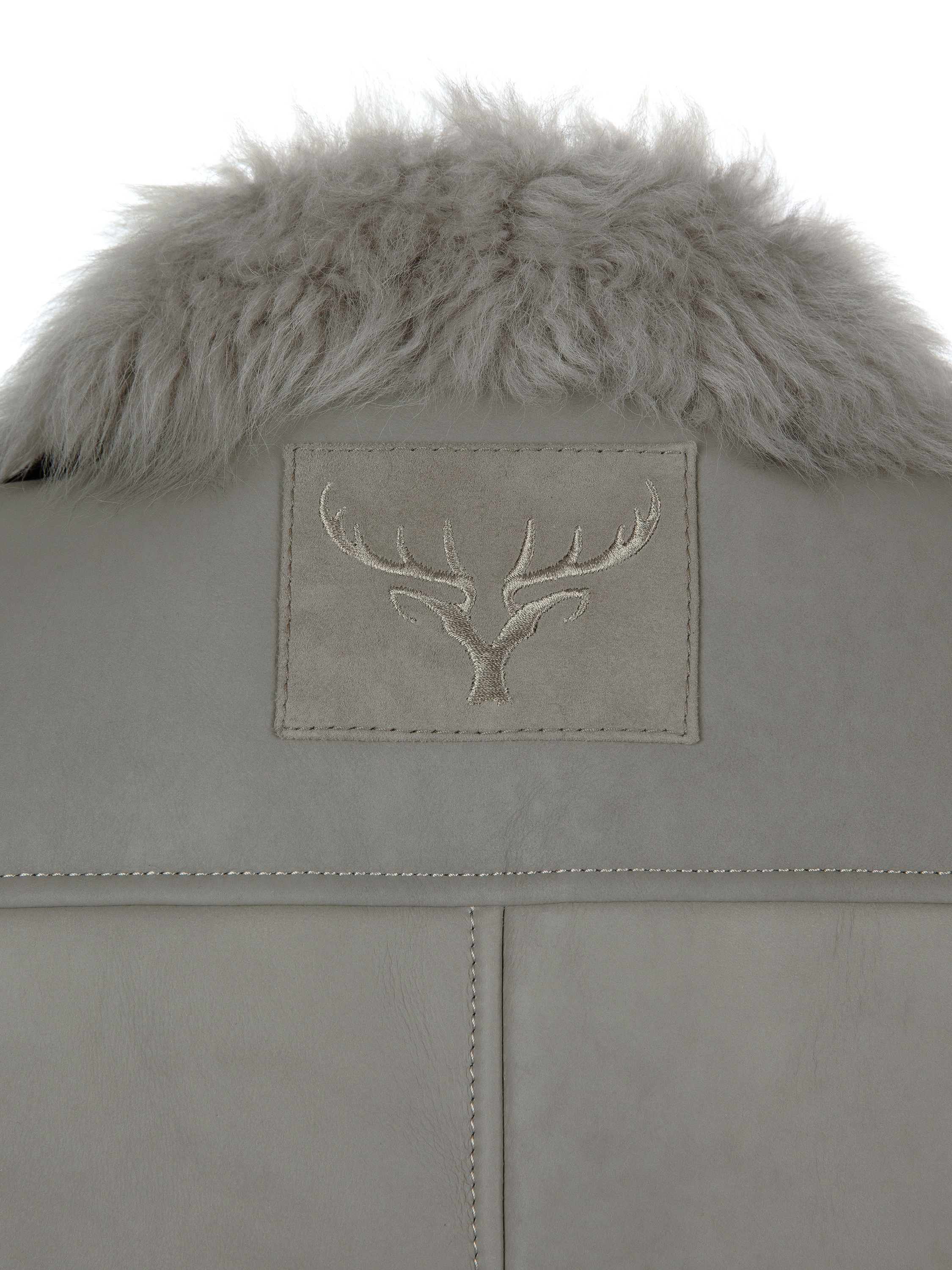 Straight-cut grey vest made of genuine sheepskin. Zip fastening with a stand-up collar. A suede patch with an embroidered deer on the back.