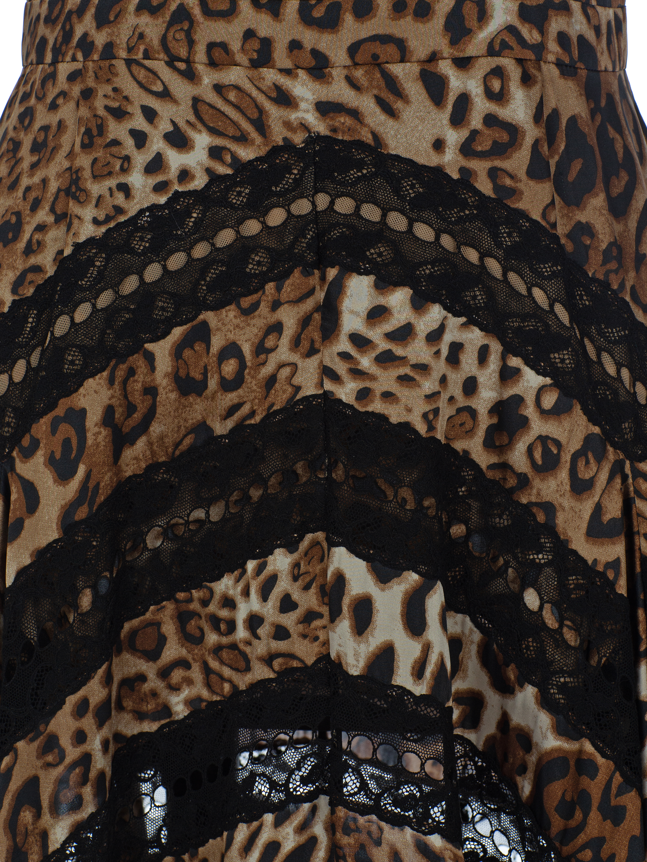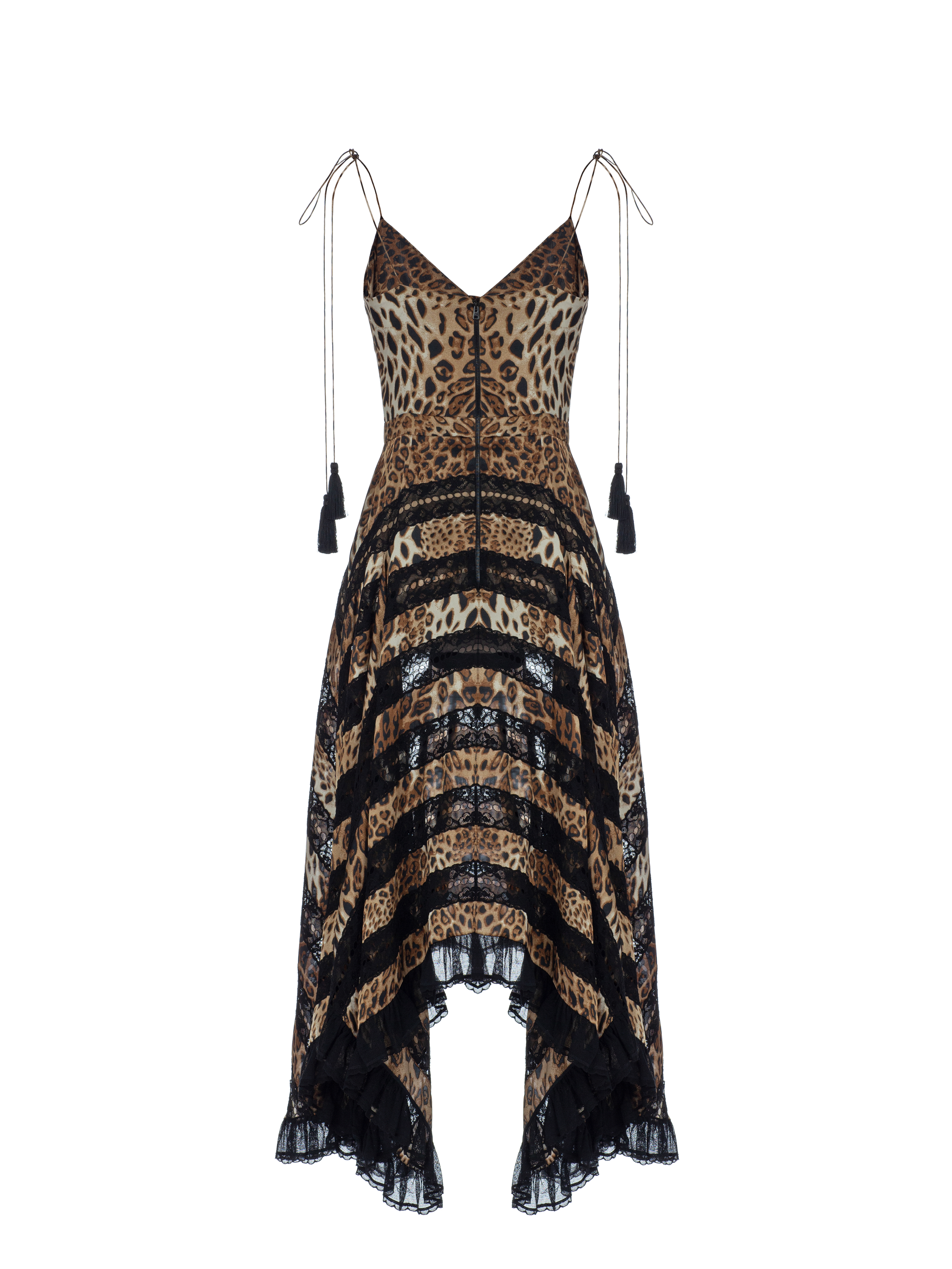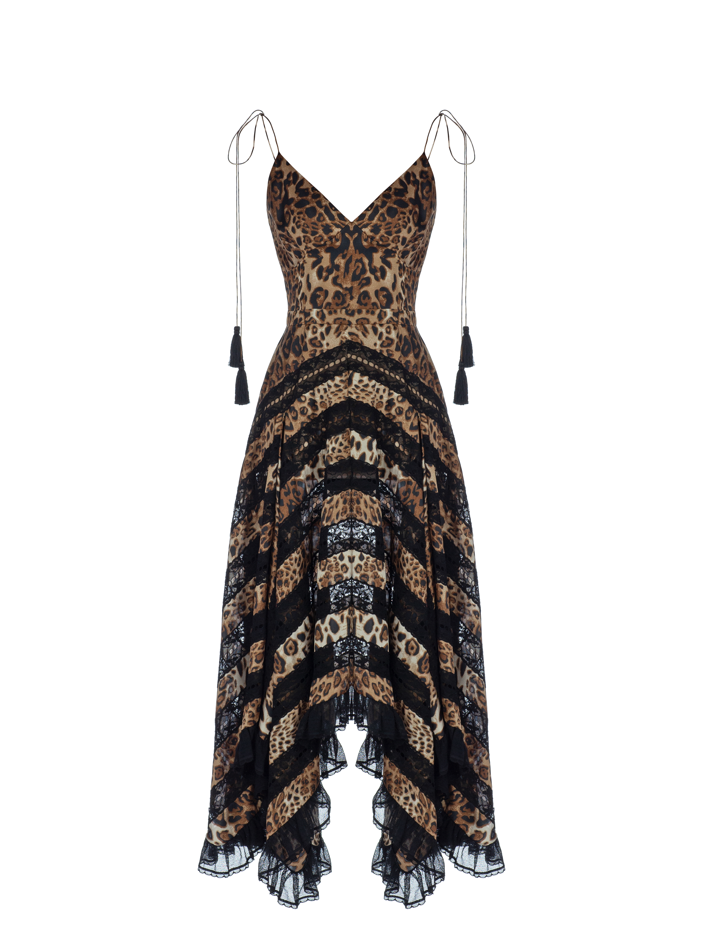 This silk midi dress is both feminine and provocative. The first is ensured by the multilayered asymmetric hem decorated with ruffles and black lace, and the second by the leopard print and bodice with a deep V-neckline on thin straps with black tassels. Create a unique look by complementing the dress with shoes and accessories from Yana Dress.