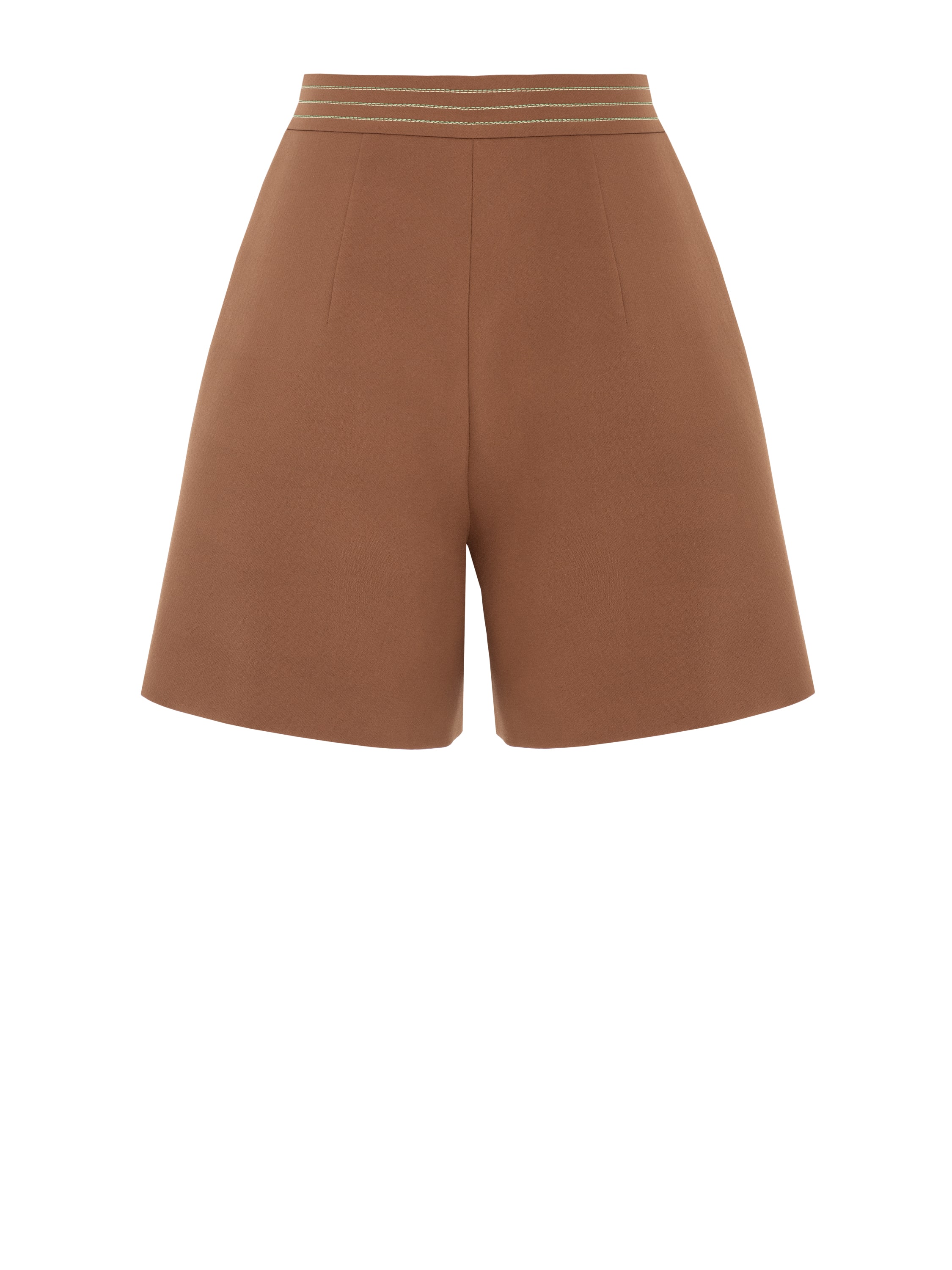 The light brown shorts are complemented by decorative topstitching along the waistband that delicately emphasizes the waistline. The minimalist model does not limit styling options.