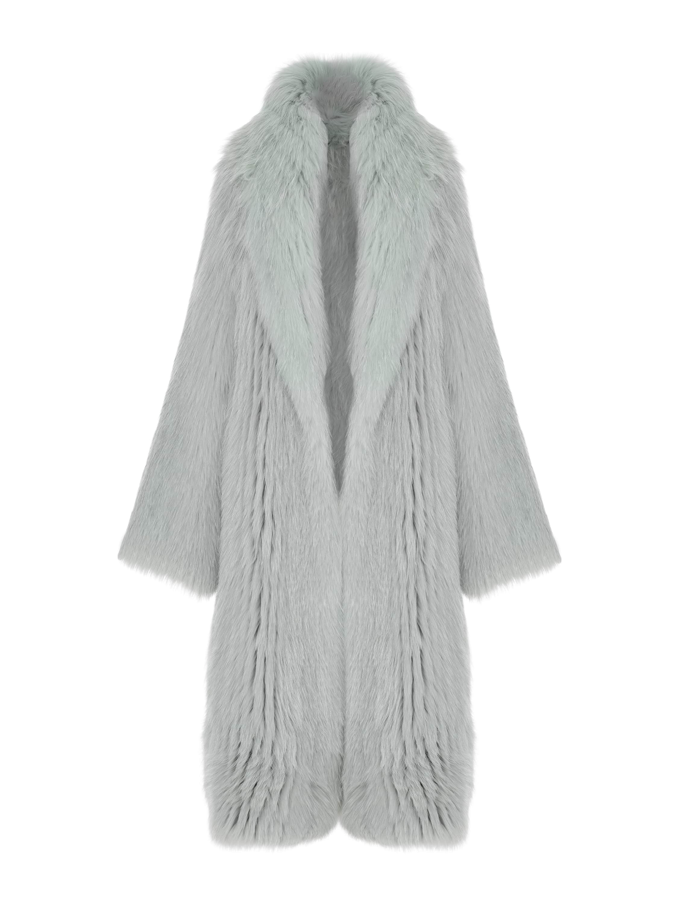 A grey knitted fur coat made of fox fur retains heat well and does not lose its texture in drizzling rain and wet snow. Trendy voluminous model with a shawl collar and flared sleeves.