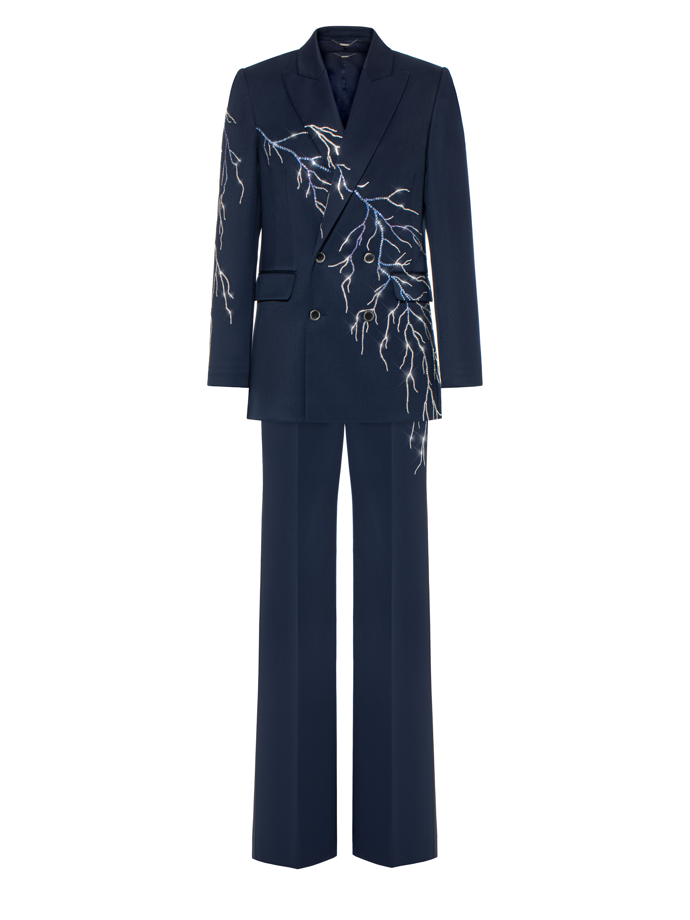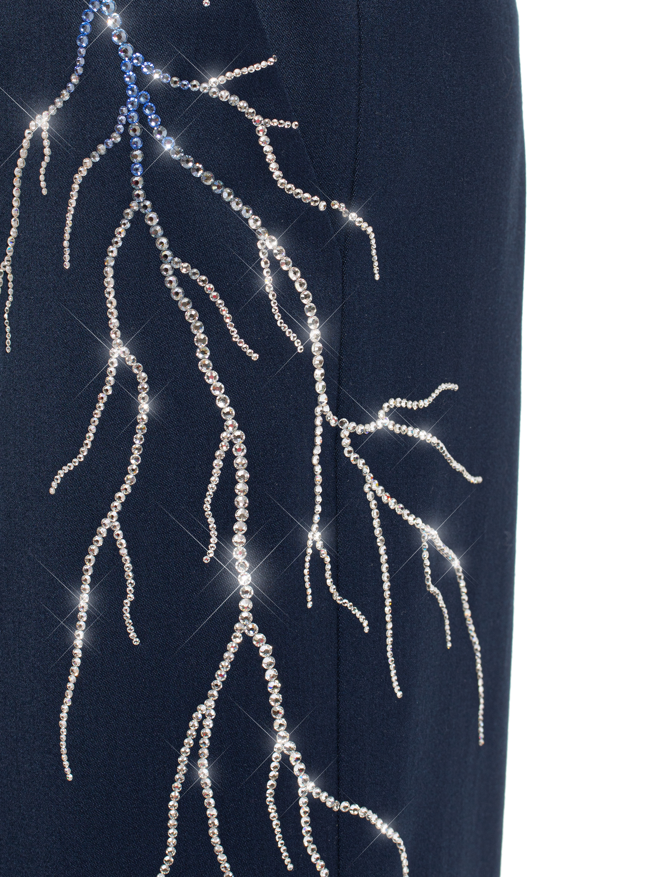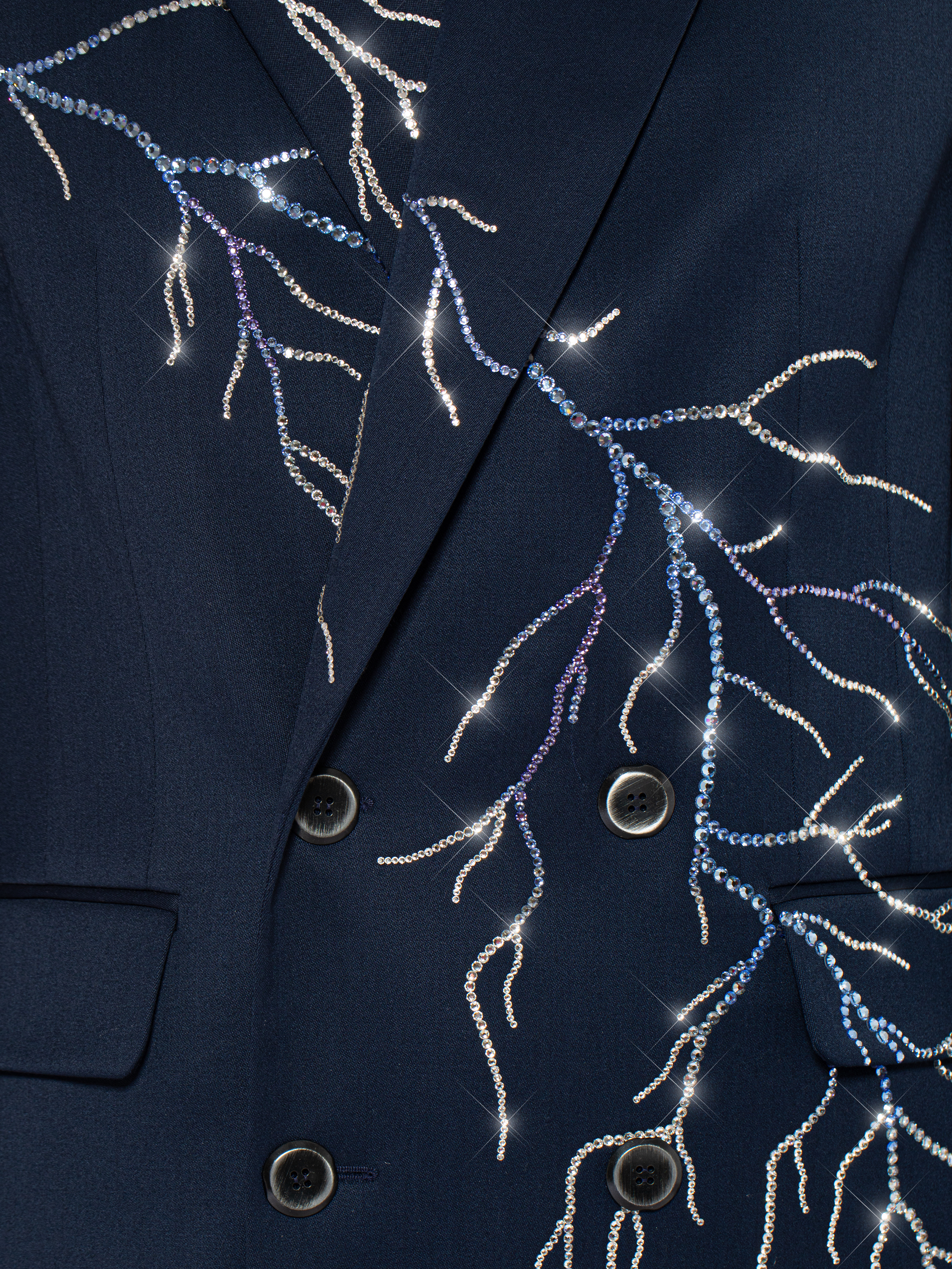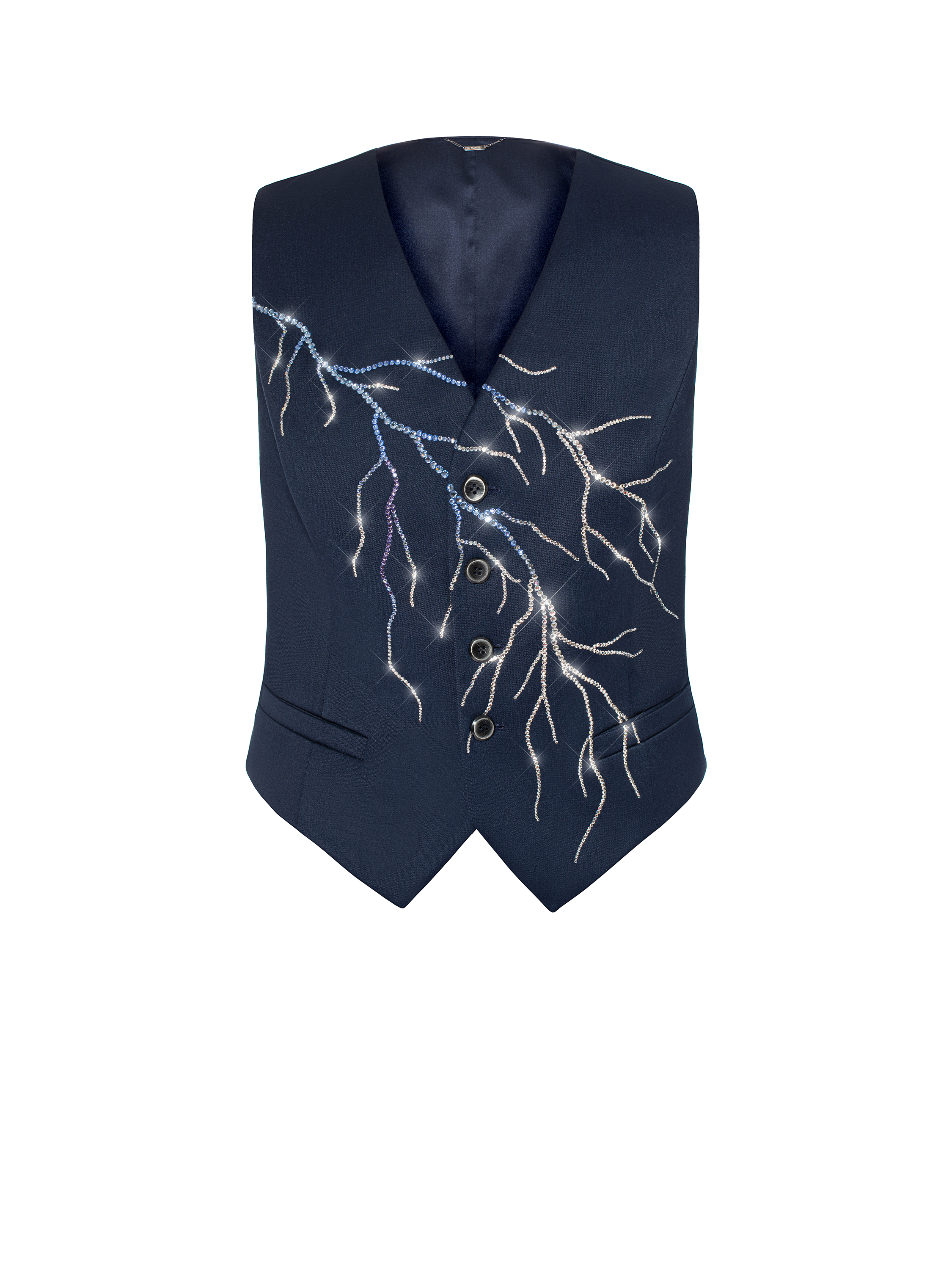 A classic three-piece suit is a timeless item. The model is made of dark blue wool and decorated with lightning motifs made of shimmering Swarovski crystals in silver and blue. The suit consists of straight-leg trousers with pressed creases, a vest, and a double-breasted jacket with sharp shaped lapels and two welt flap pockets. It took 54.5 hours of handwork by Yana fashion house craftsmen to create the suit.