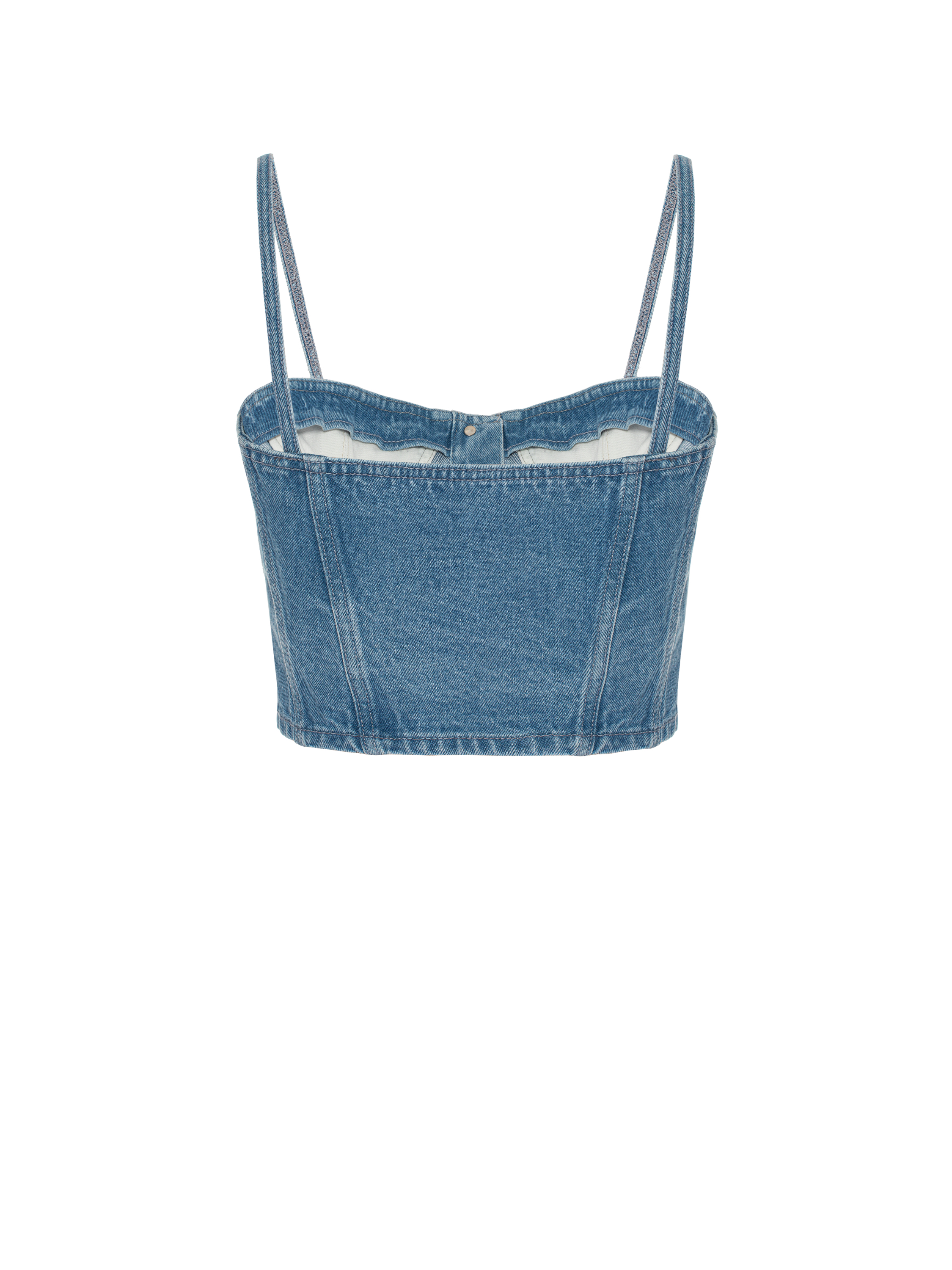 A corset top with thin straps is made of washed blue denim. It fastens at the front with branded logo buttons.