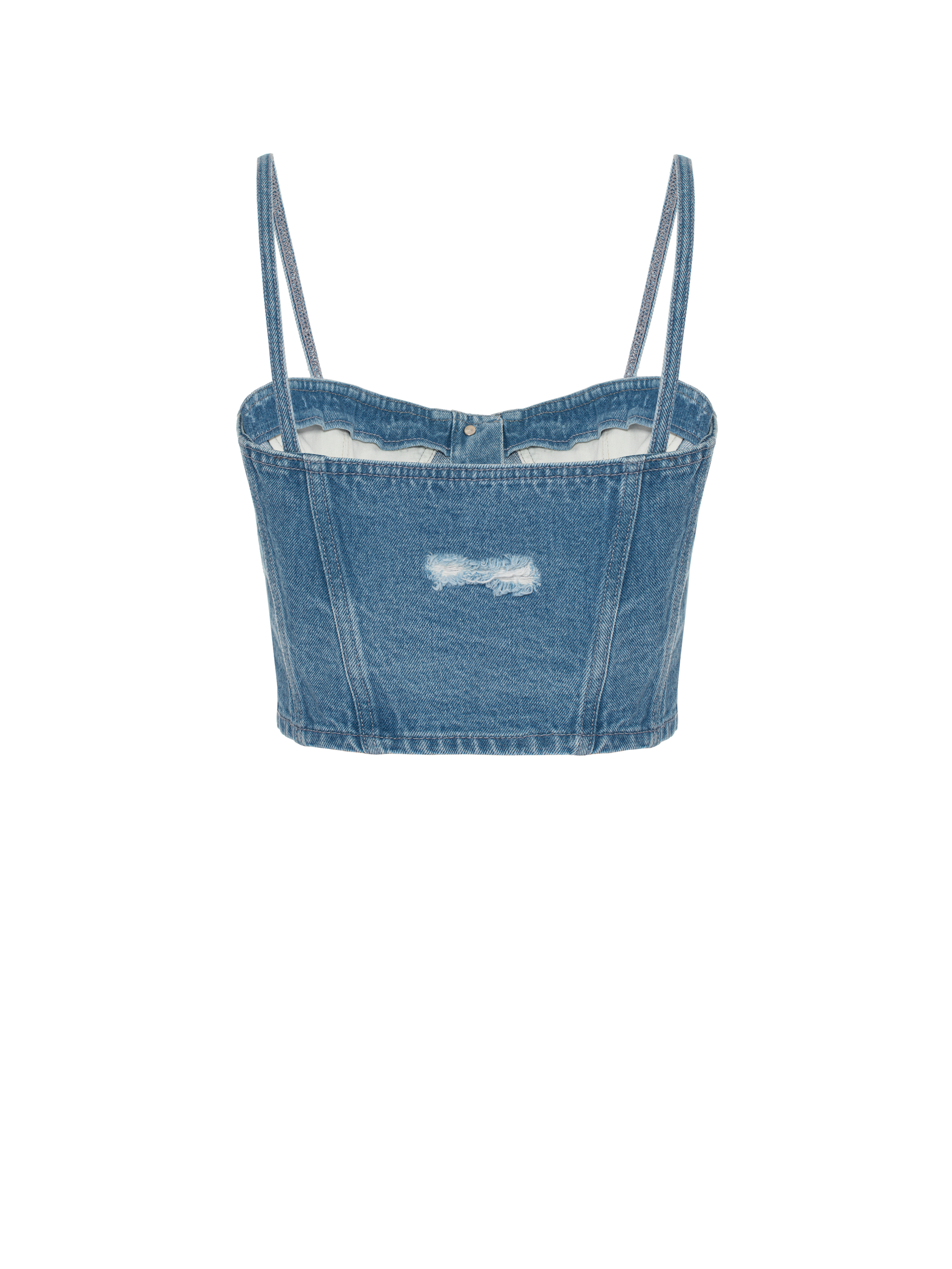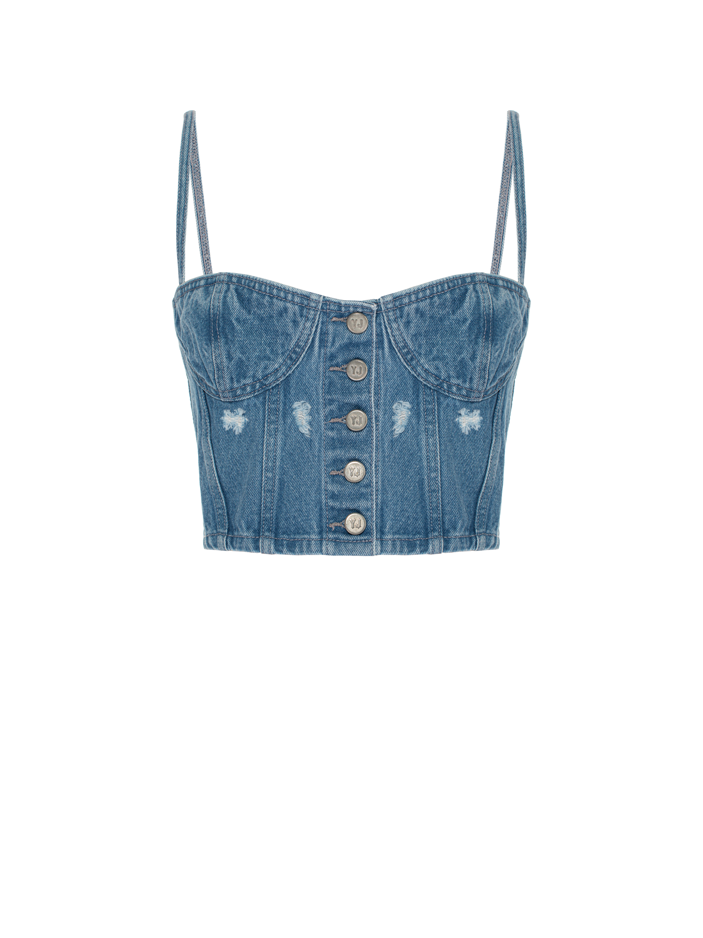 A corset top with thin straps is made of washed blue denim. The model is complemented by decorative scuffs. It fastens at the front with branded logo buttons.