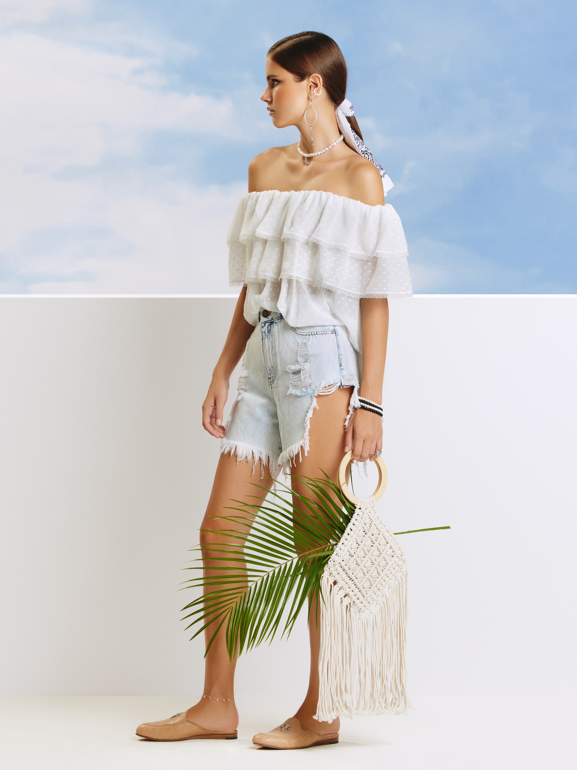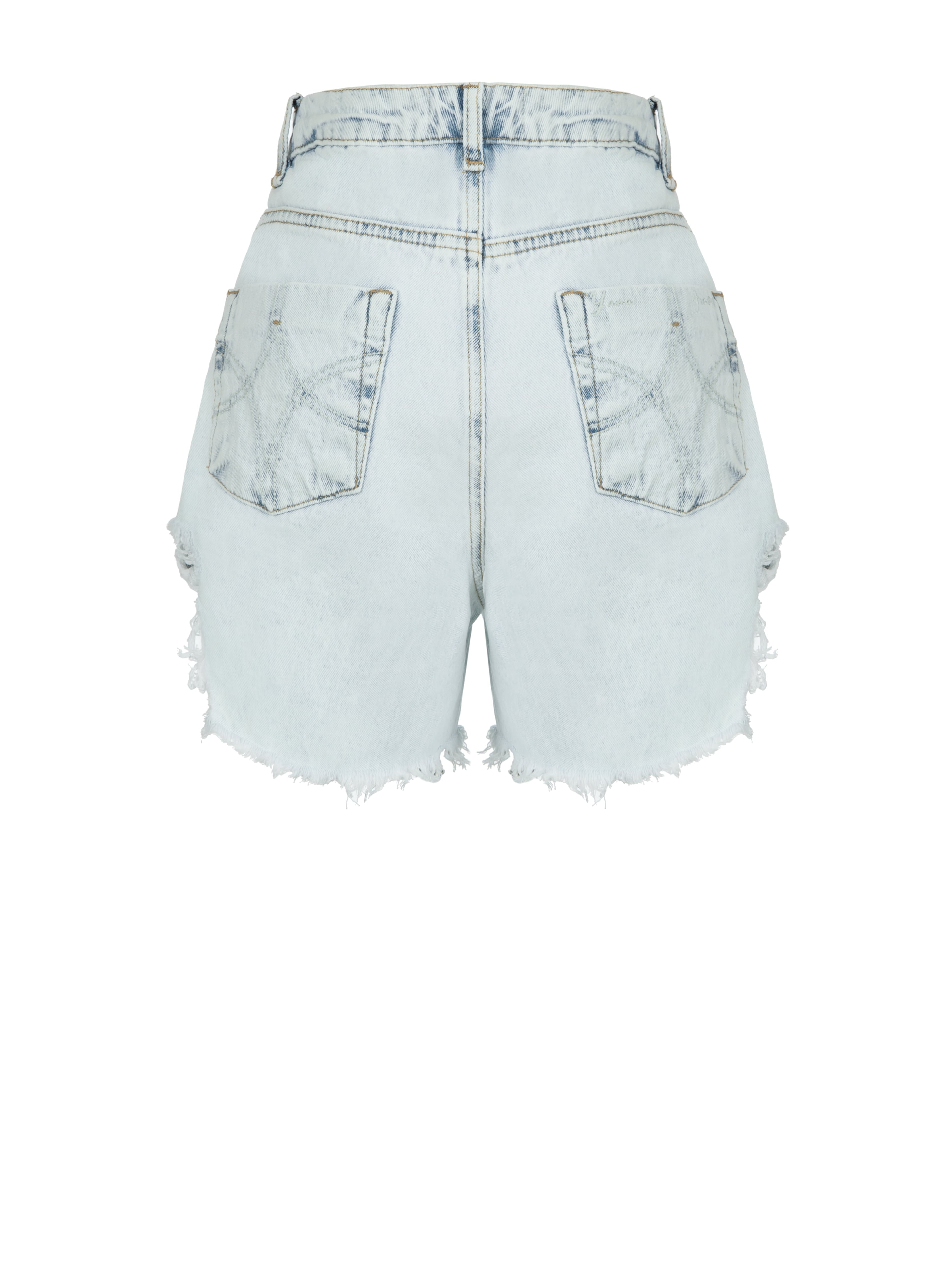 A summer addition to the Yana Jeans line — short denim shorts with raw hems made of light blue denim. An indispensable part of any summer wardrobe, these shorts have a deeper cut at the sides and sensually reveal the thigh. High-rise model.