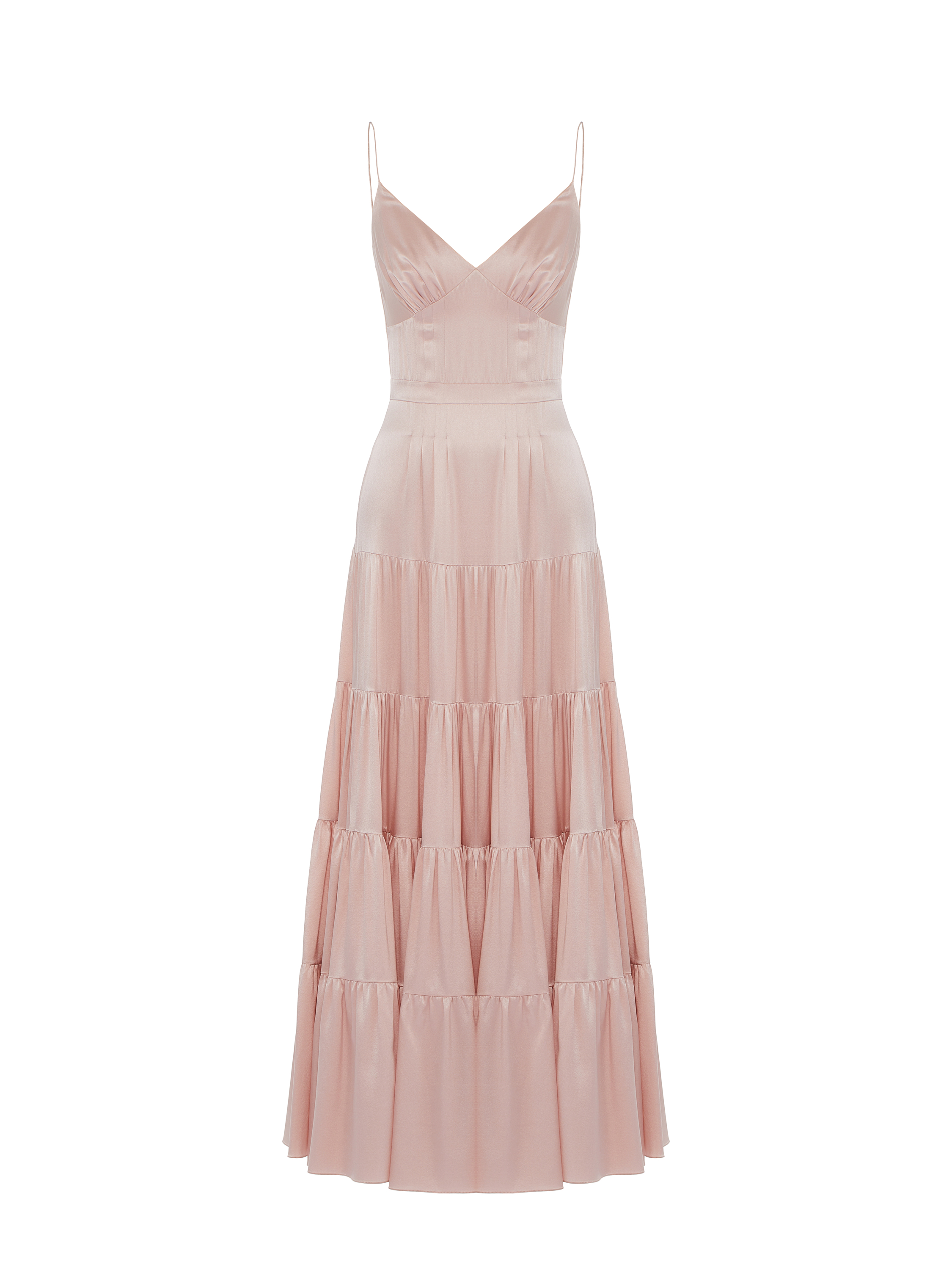 A light pink maxi dress on thin straps is made of silk. The hem is cut in four tiers. The model is complemented by a cut-out and tassel ties at the back. Style it with shoes and accessories by Yana Dress to complete the look.