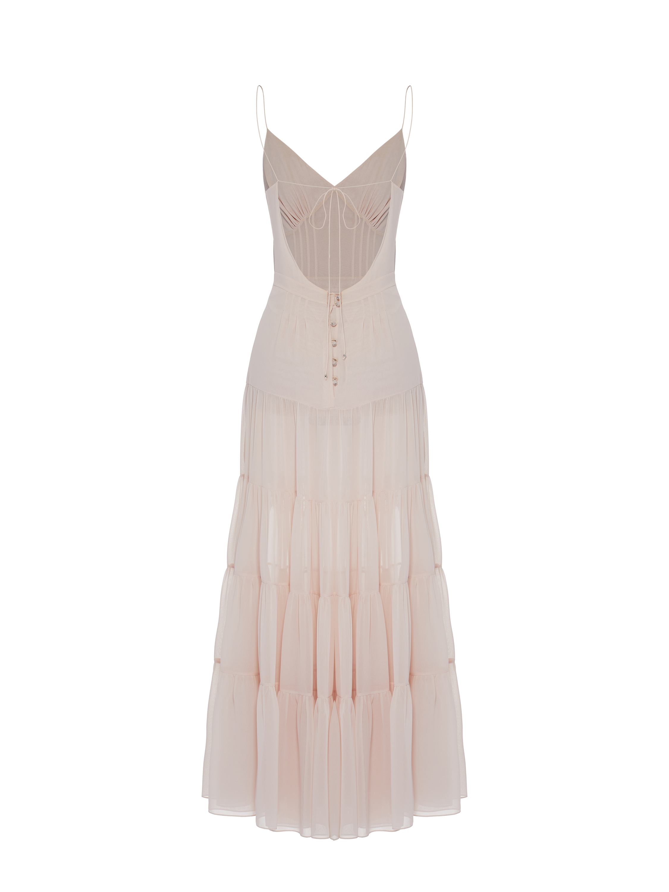 A light pink maxi dress on thin straps with an open back is made of semi-sheer chiffon. The hem is cut in four tiers and complemented with slits and ties at the front. Fastening with mother-of-pearl buttons and ties at the back.