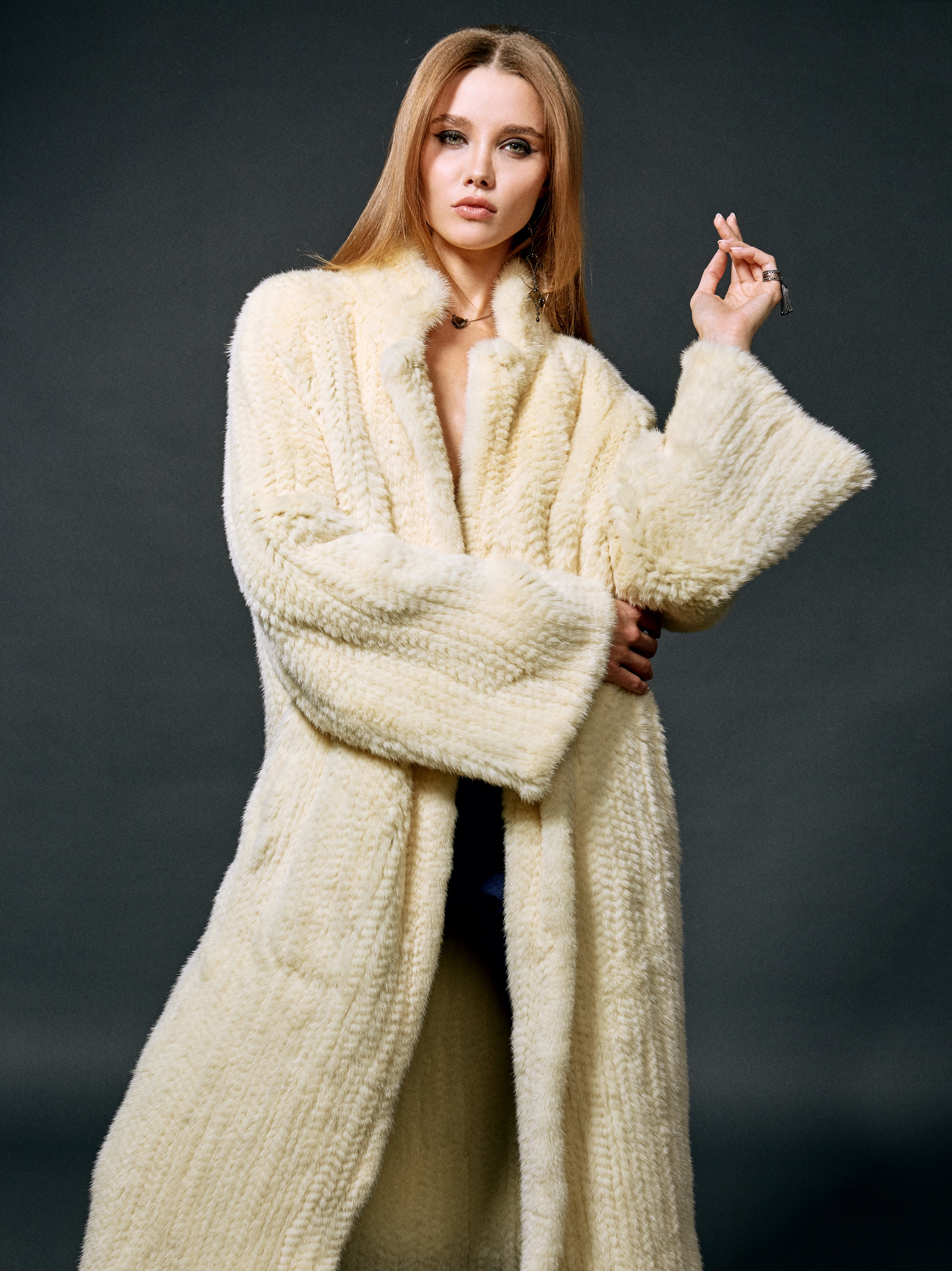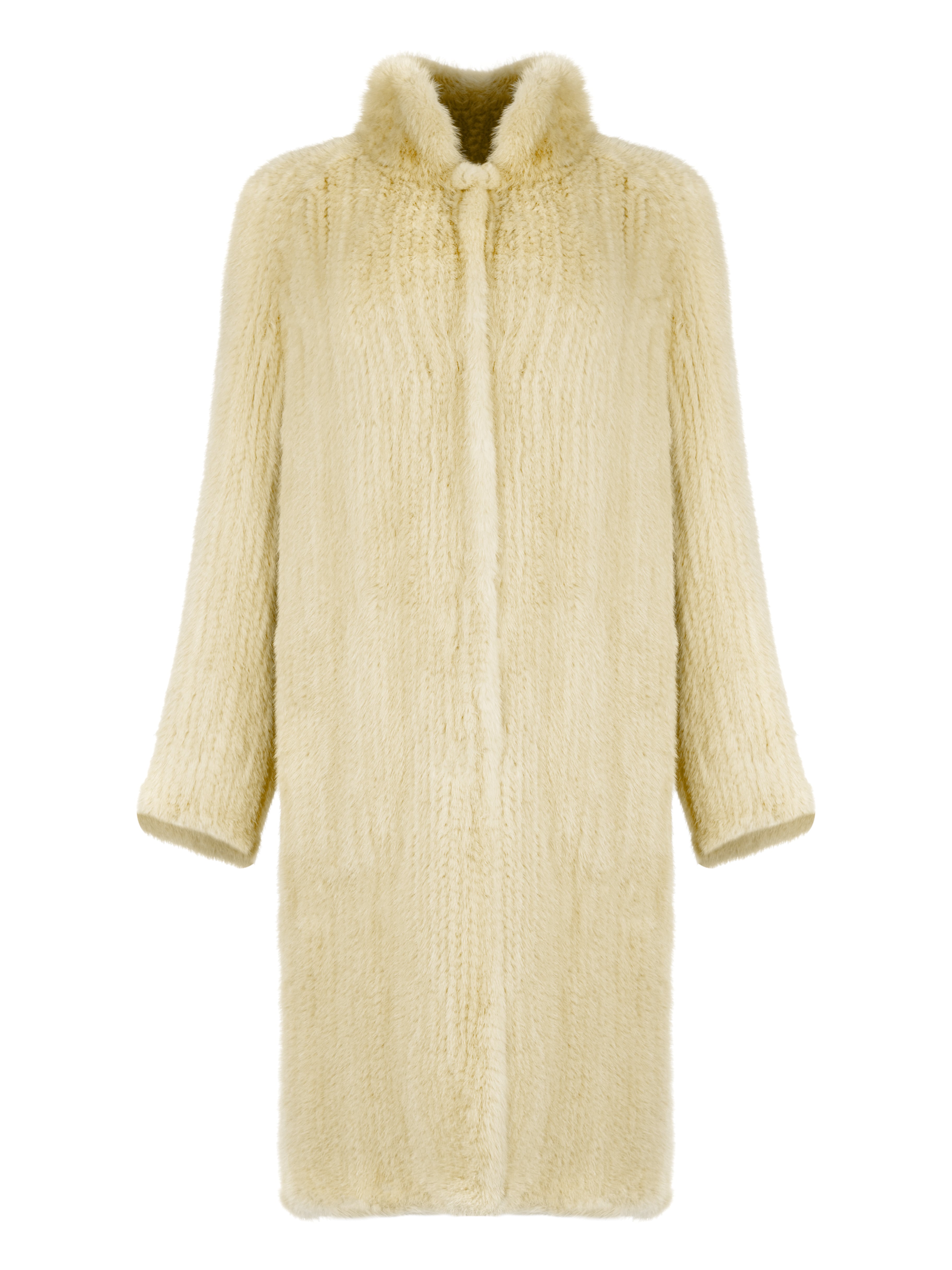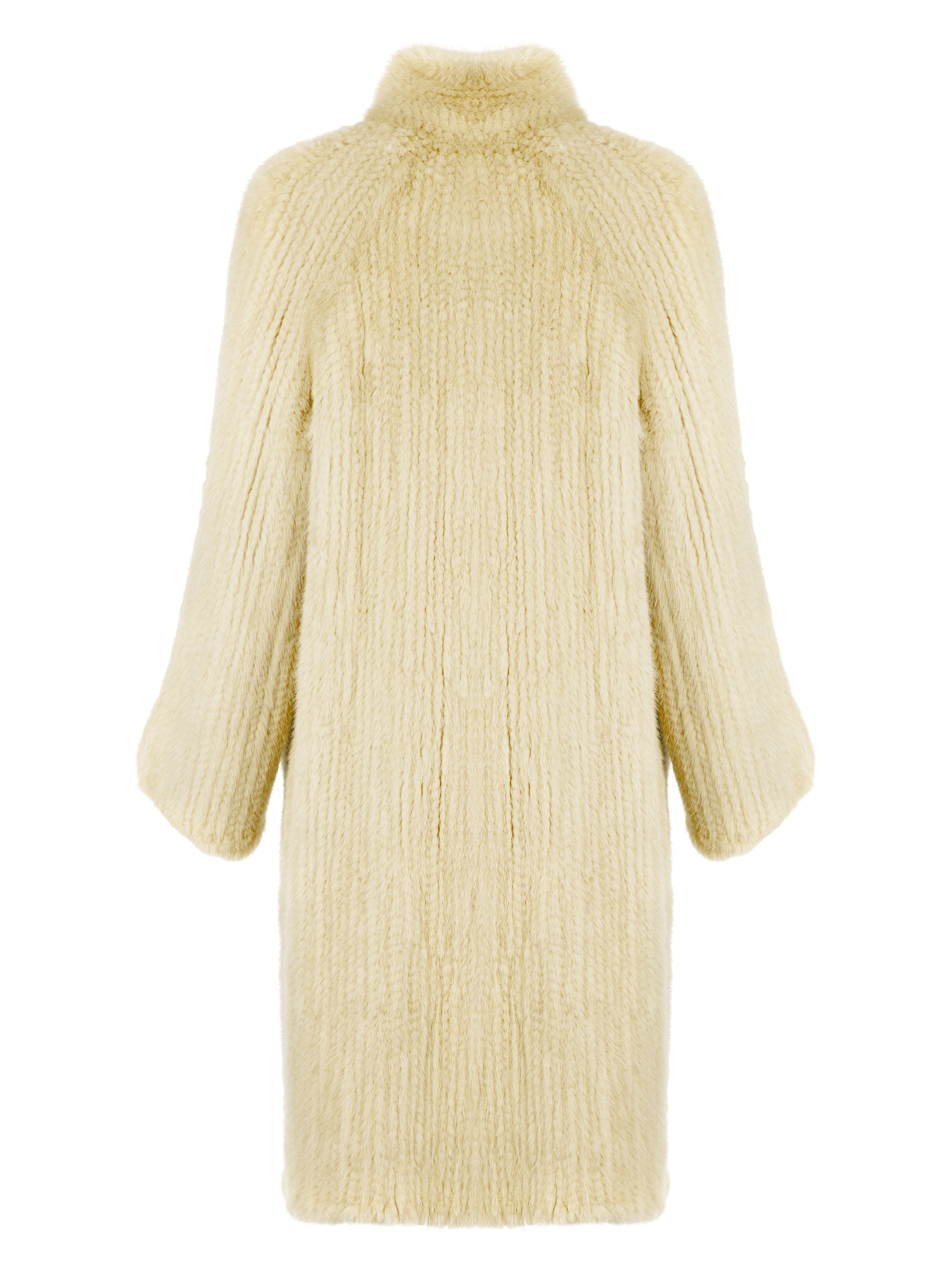 A knitted fur coat made of mink fur in a light yellow shade. The model fastens with hooks at the front and is complemented by convenient side pockets.