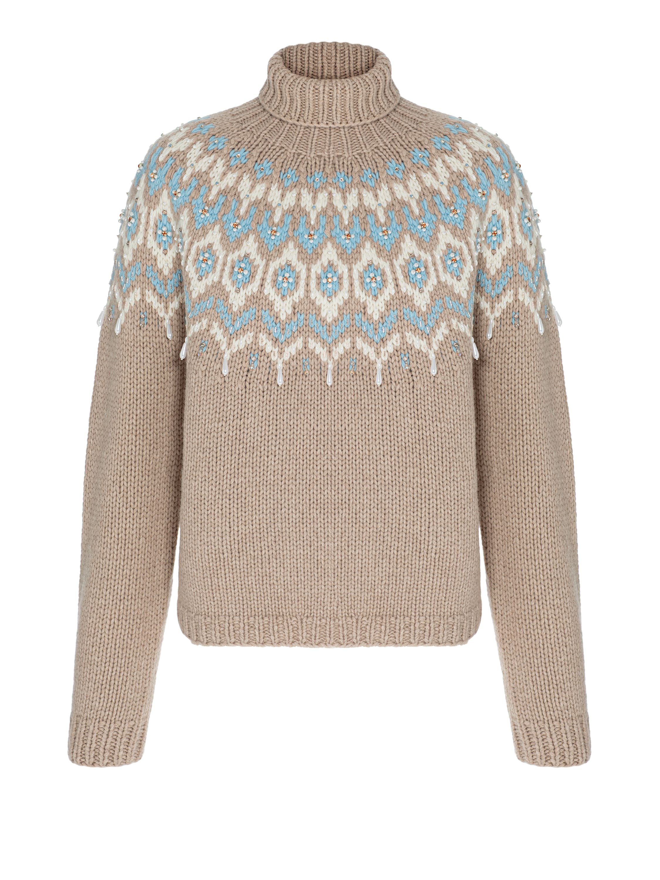The beige patterned sweater is hand-knitted from 100% cashmere. The high-neck design is adorned with hand embroidery featuring pearl beads and crystals. It took the artisans 50 hours of handwork to create and decorate the piece.