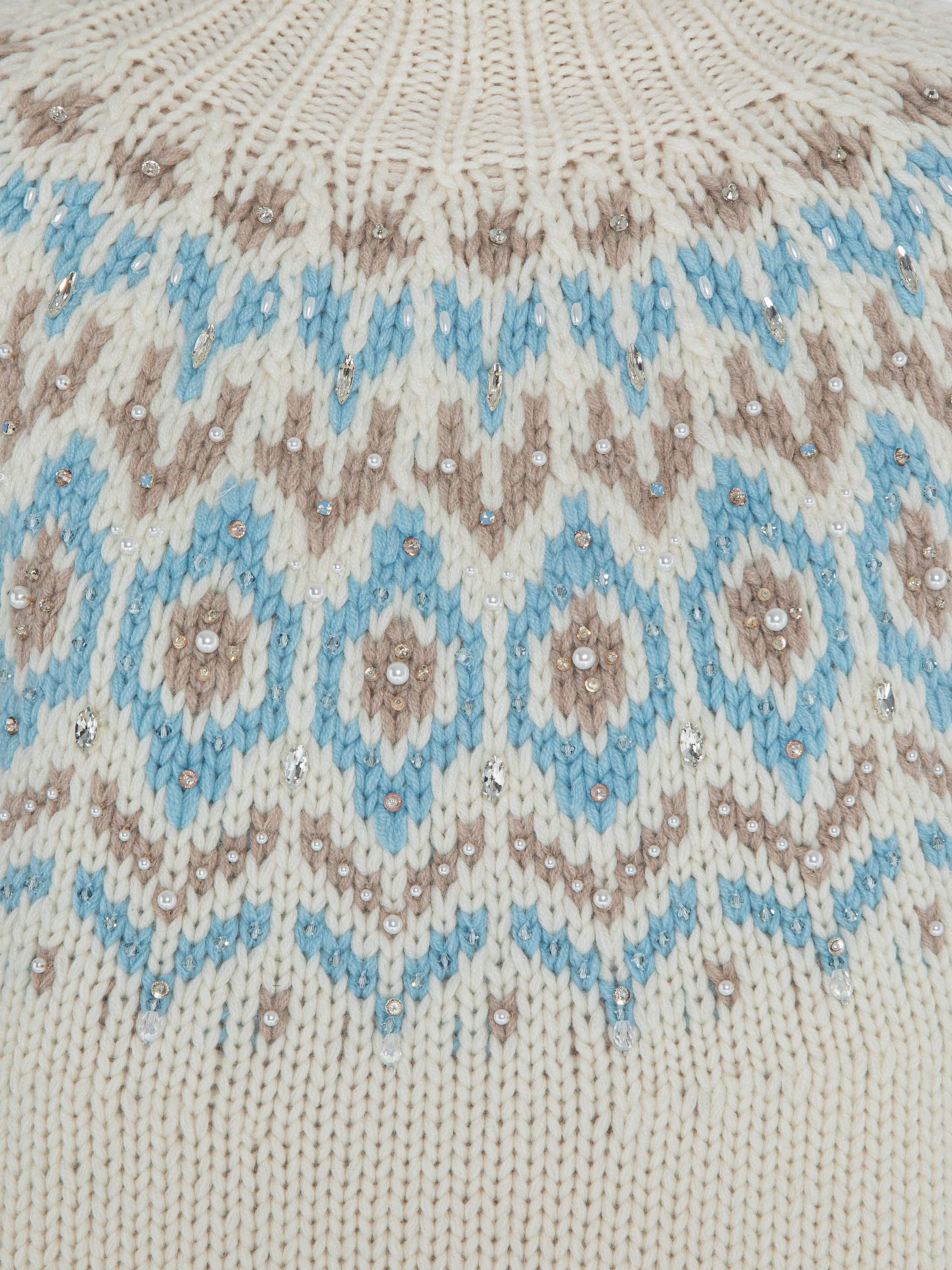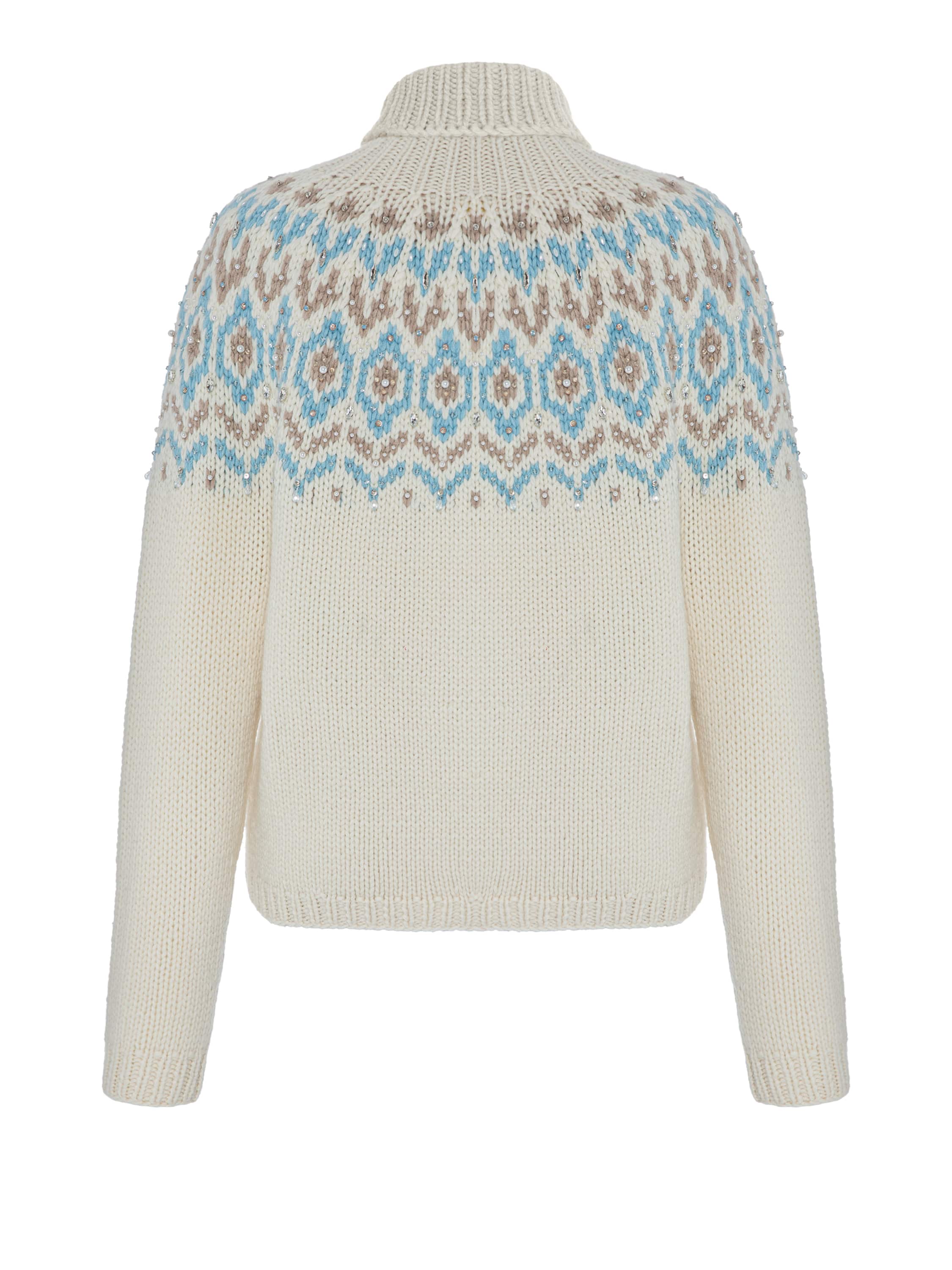 The milky sweater with an ornament is hand-knitted from 100% cashmere. The model with a high neck is complemented by hand embroidery with beads, crystals and bugle beads. It took the craftsmen 50 hours of handwork to create and decorate the item.