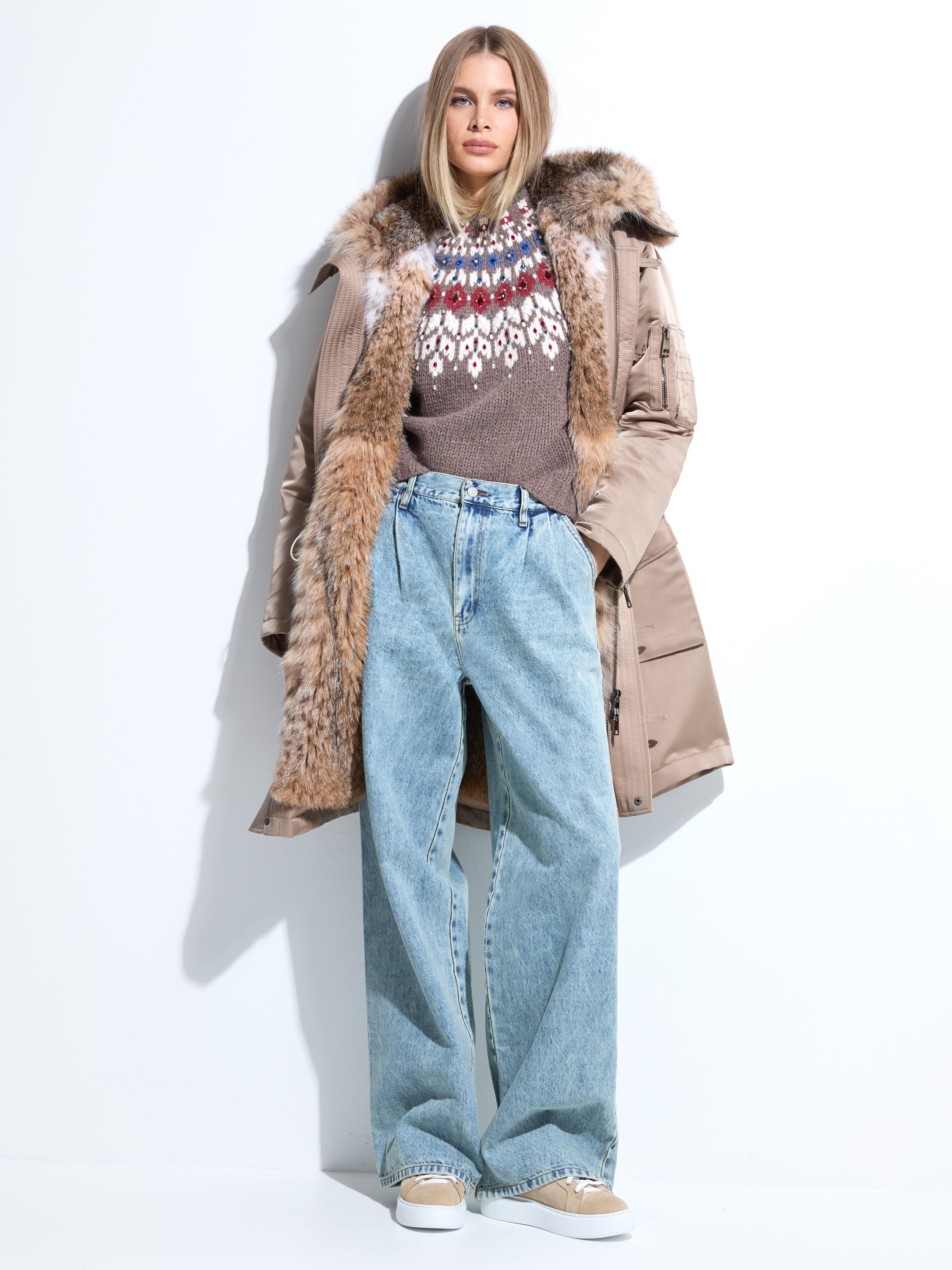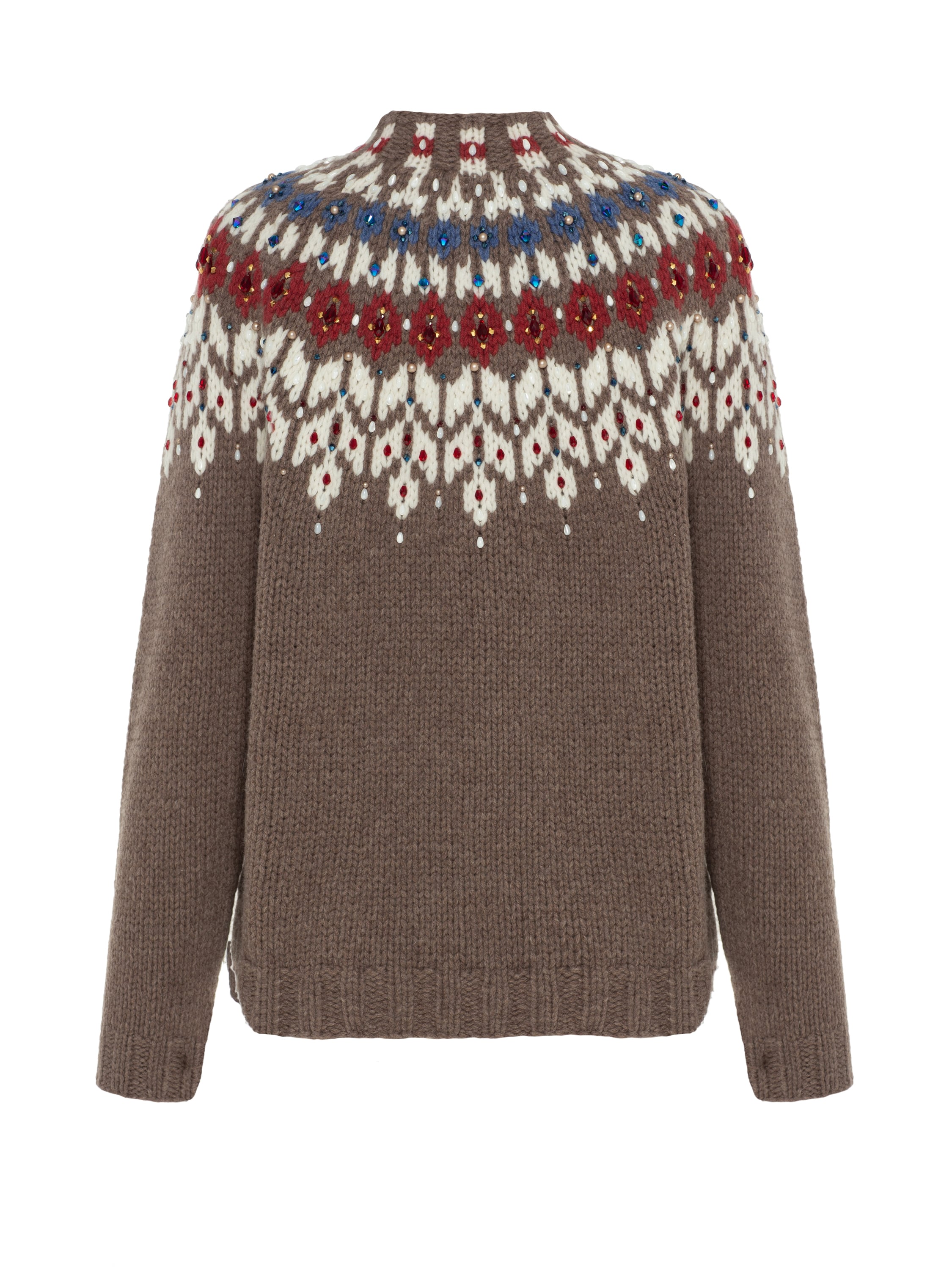 The brown sweater with a bright pattern is hand-knitted from 100% cashmere. The model with a delicate round neckline is complemented by hand embroidery with pearls and bicone beads. It took the craftsmen 38 hours of handwork to make and decorate the piece.