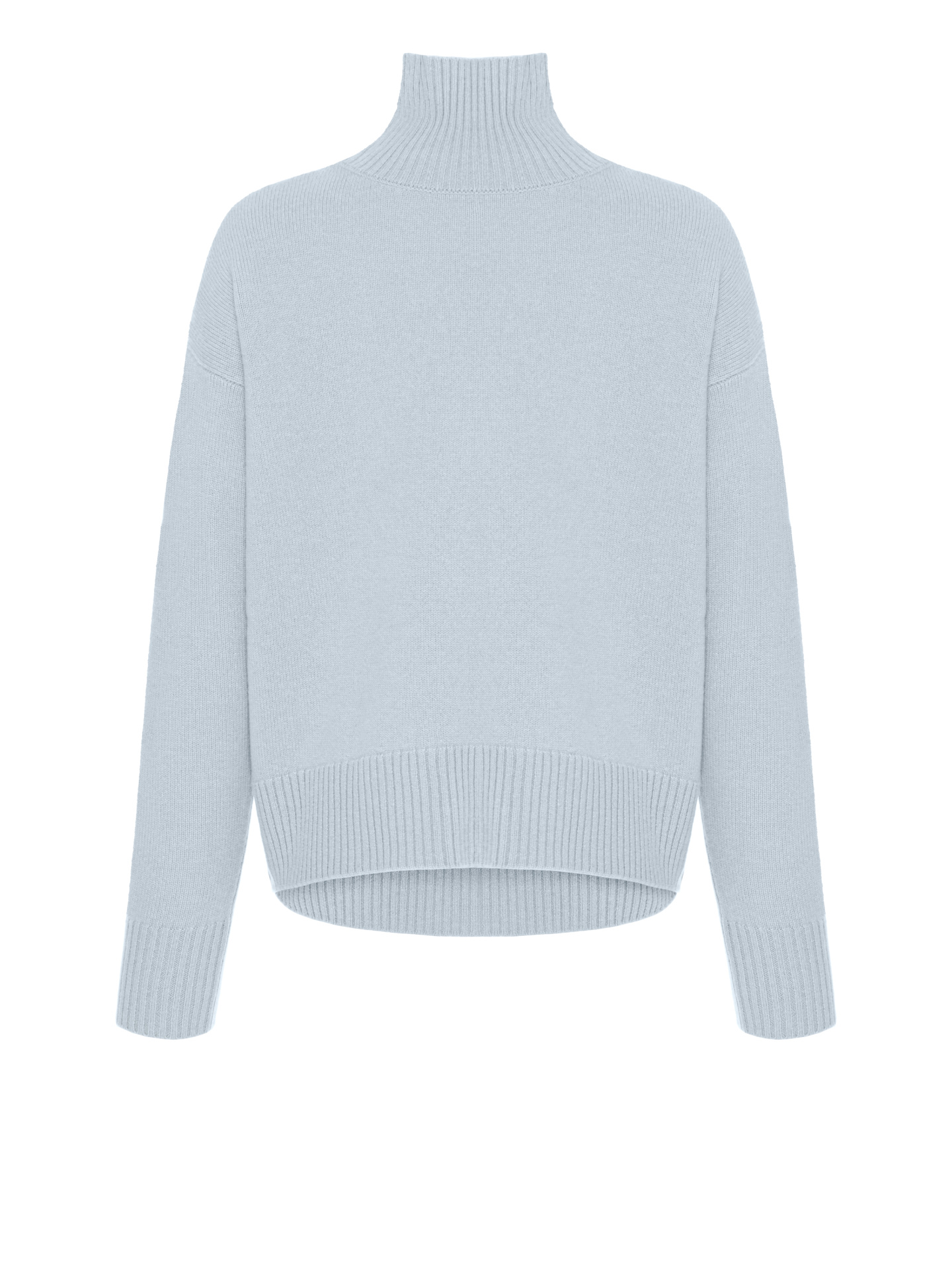 A cozy high-neck light blue sweater is made of 100% premium-quality royal cashmere. The fine, silky, almost weightless yarn reliably retains warmth and maintains a comfortable microclimate while allowing the skin to breathe. The material is highly durable, does not wrinkle and does not lose its shape. The basic model is relevant for any wardrobe and suits all body types.