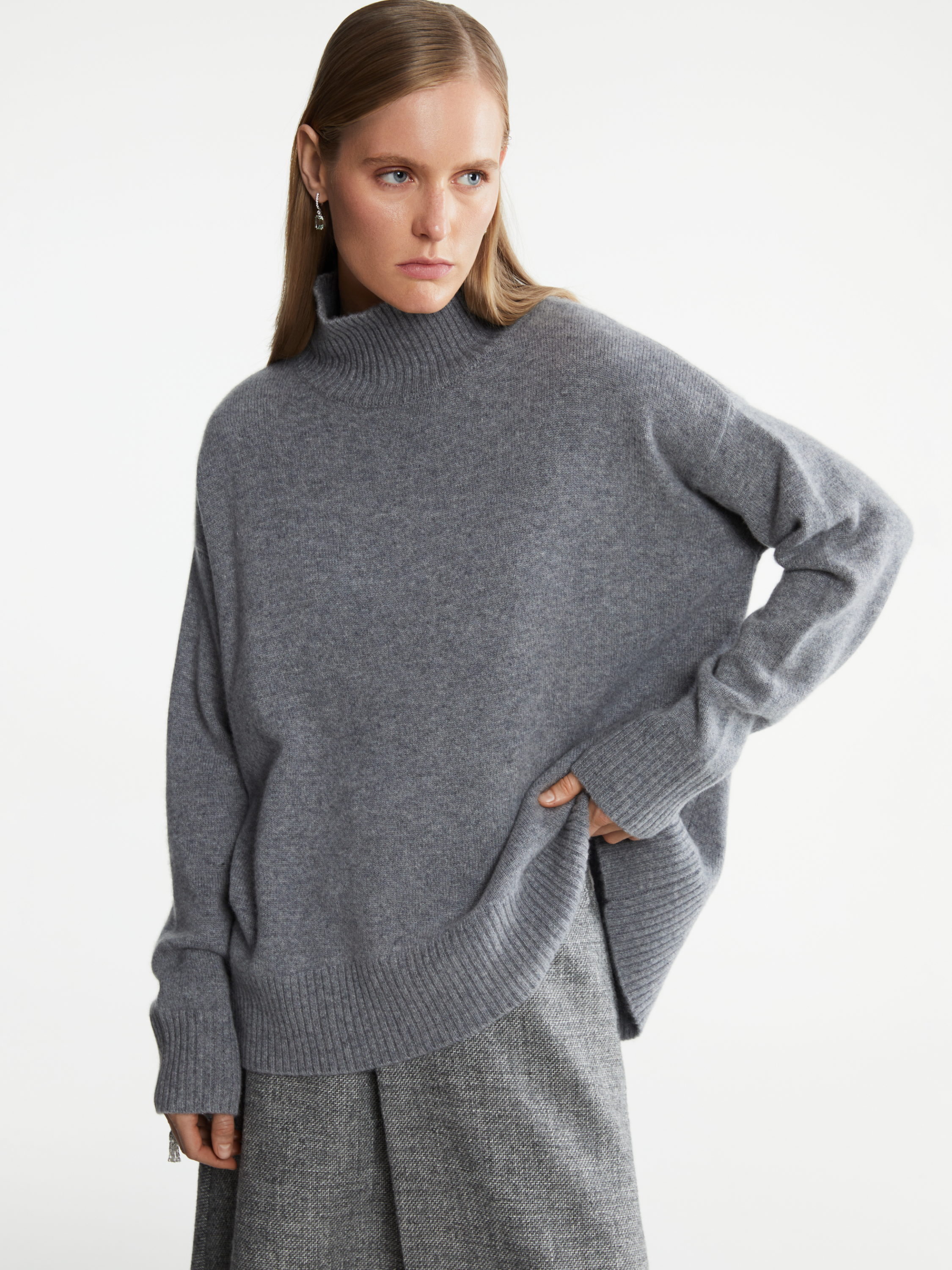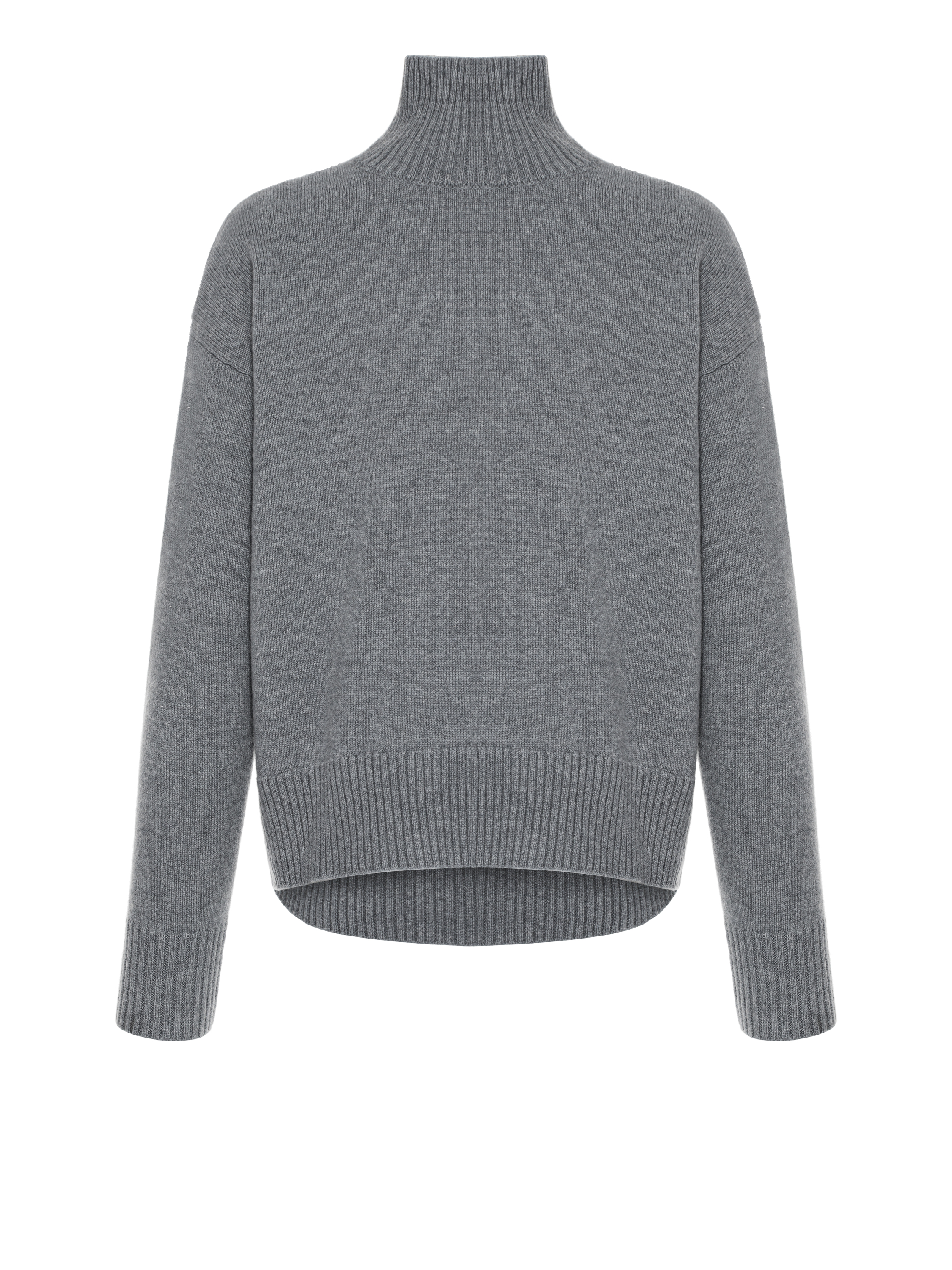 A cozy high-neck gray sweater is made of 100% premium-quality royal cashmere. The fine, silky, almost weightless yarn reliably retains warmth and maintains a comfortable microclimate while allowing the skin to breathe. The material is highly durable, does not wrinkle and does not lose its shape. The basic model is relevant for any wardrobe and suits all body types.