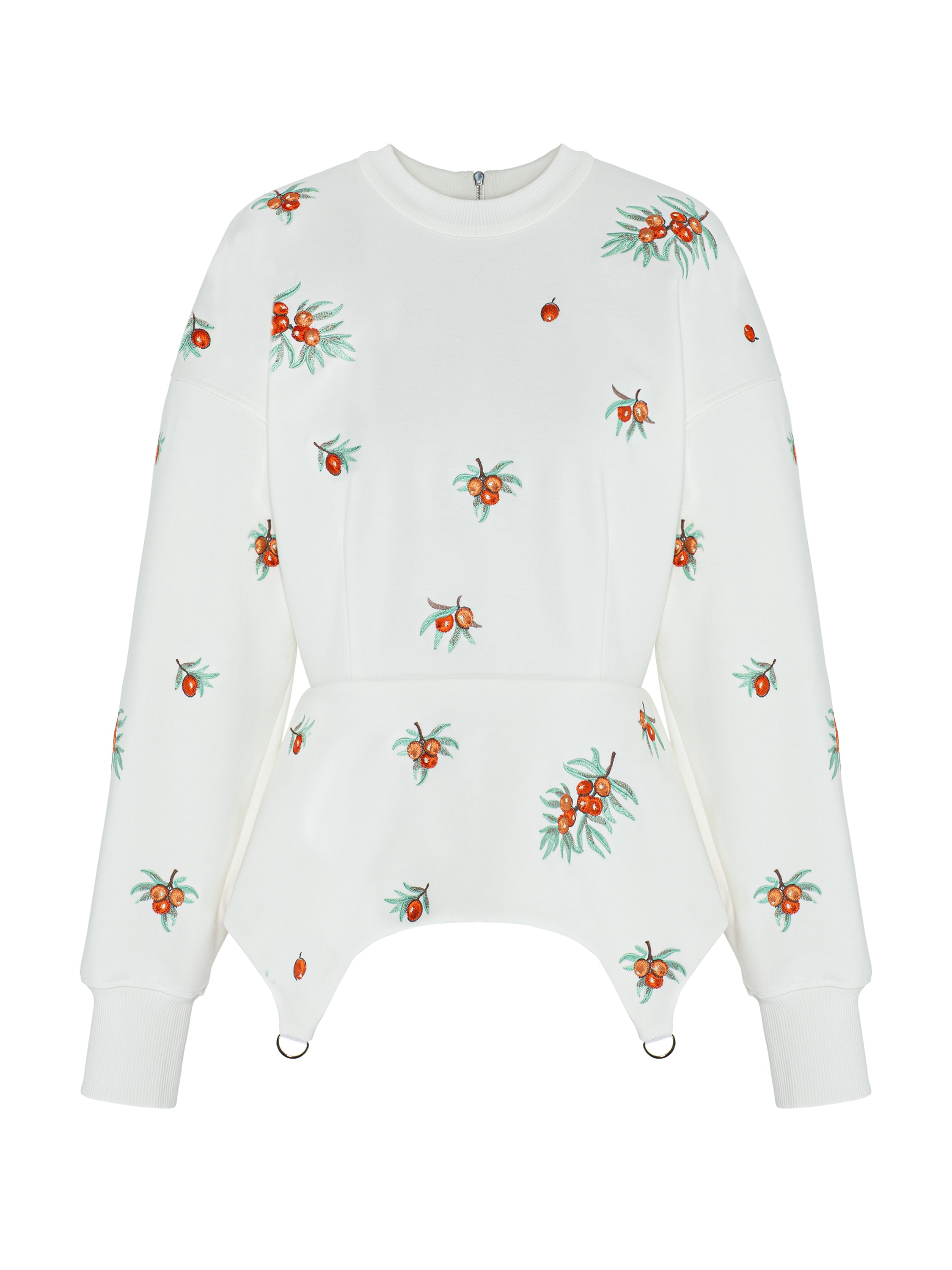 A sweatshirt made of milky footer with fleece will delight you with its softness and practicality. A stylish detail in the form of a shaped peplum and a zipper at the back make the model expressive, while the delicate embroidery depicting sea buckthorn gives a special accent to the look.