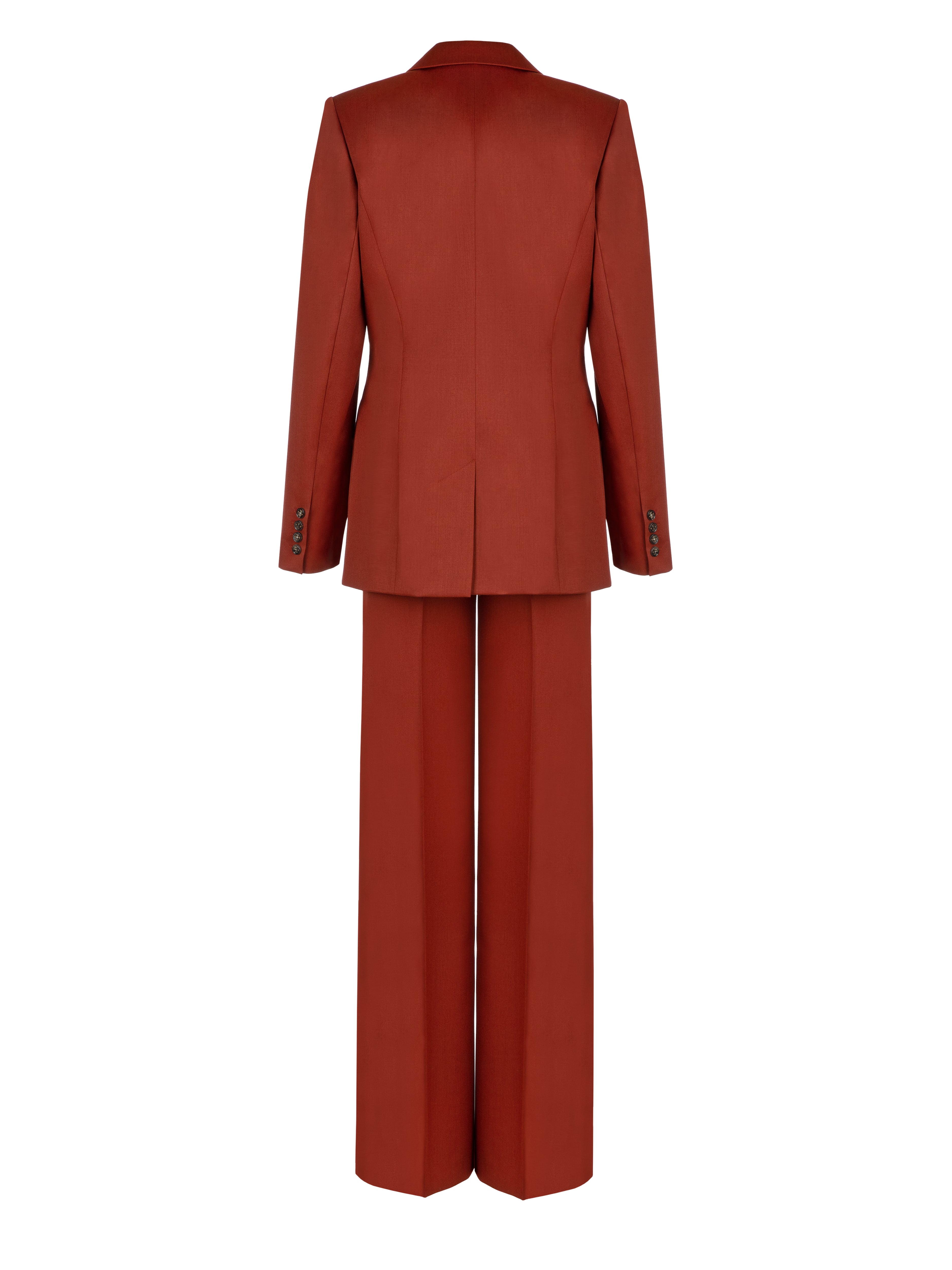 A terracotta three-piece suit consists of straight high-waisted trousers with creases, a vest, and a single-breasted straight-cut blazer with shaped lapels.