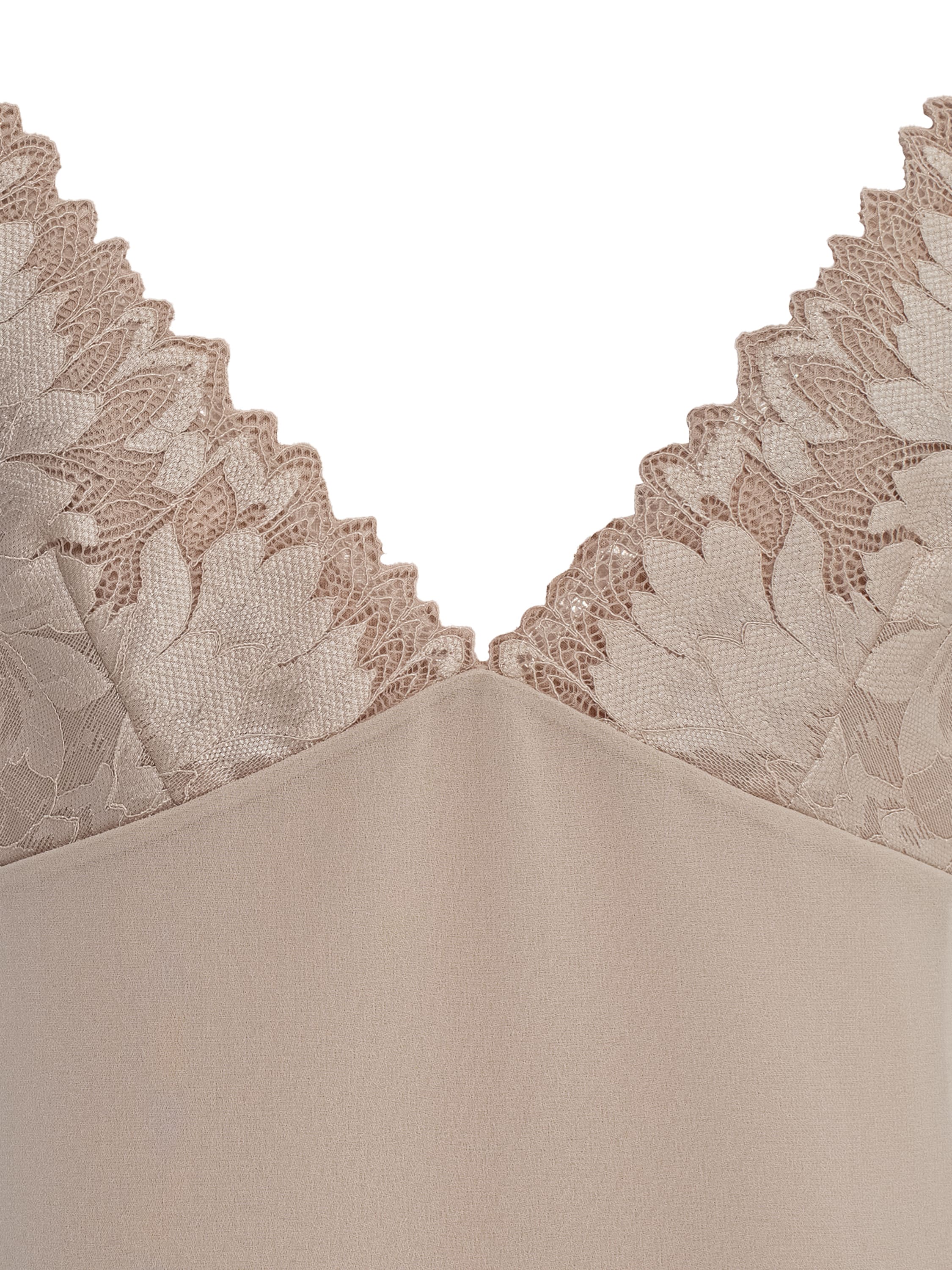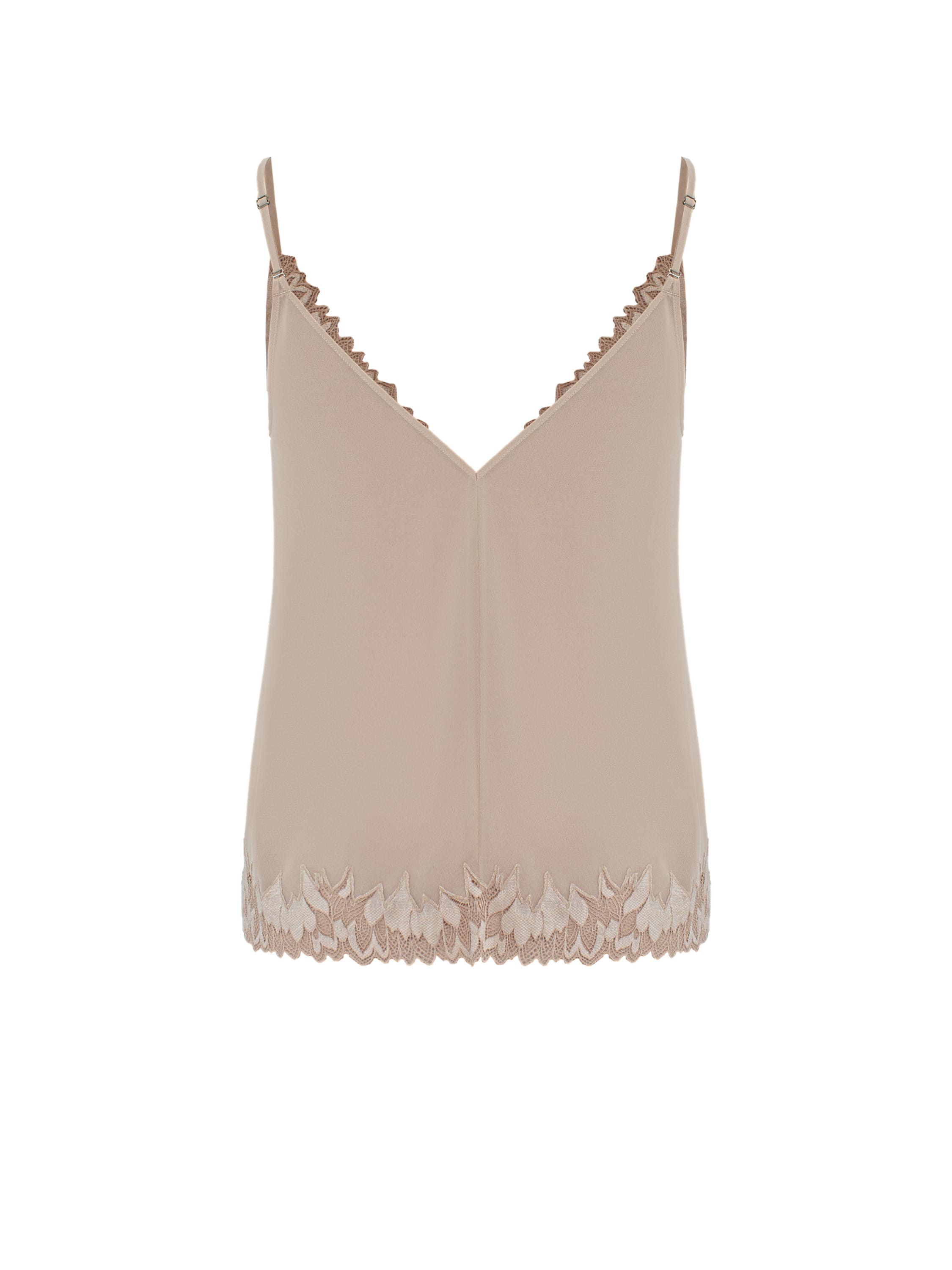 The beige top with thin straps is made of chiffon. The décolleté area and the hem of the piece are decorated with elegant lace.