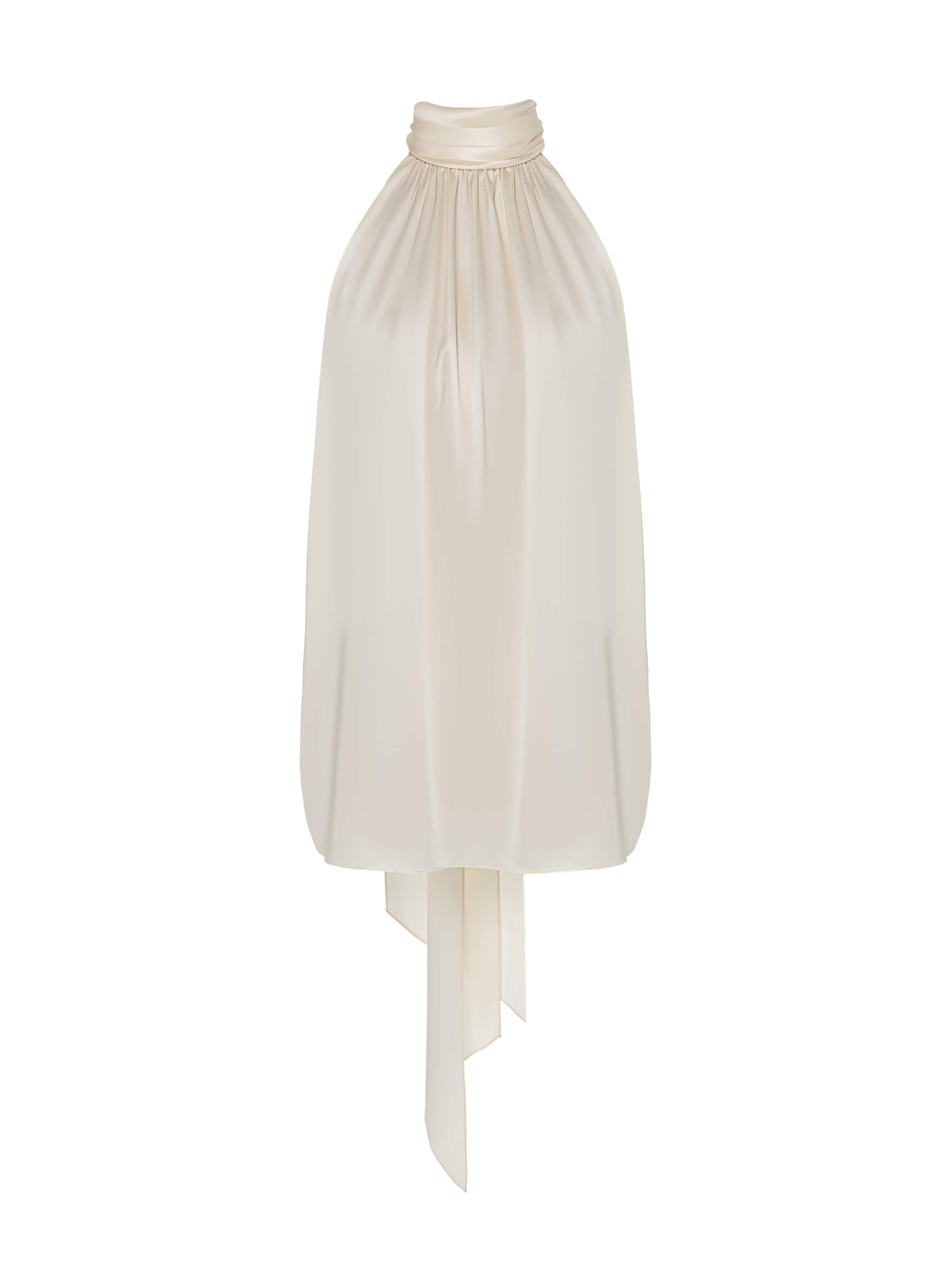 A top made of milky silk fabric is a perfect example of refined femininity: the light, flowing fabric creates delicate drapes and gives the look an airy feel. The strict stand-up collar is complemented by long ties that can be formed into an accent bow. The halter armhole gracefully bares the shoulders.