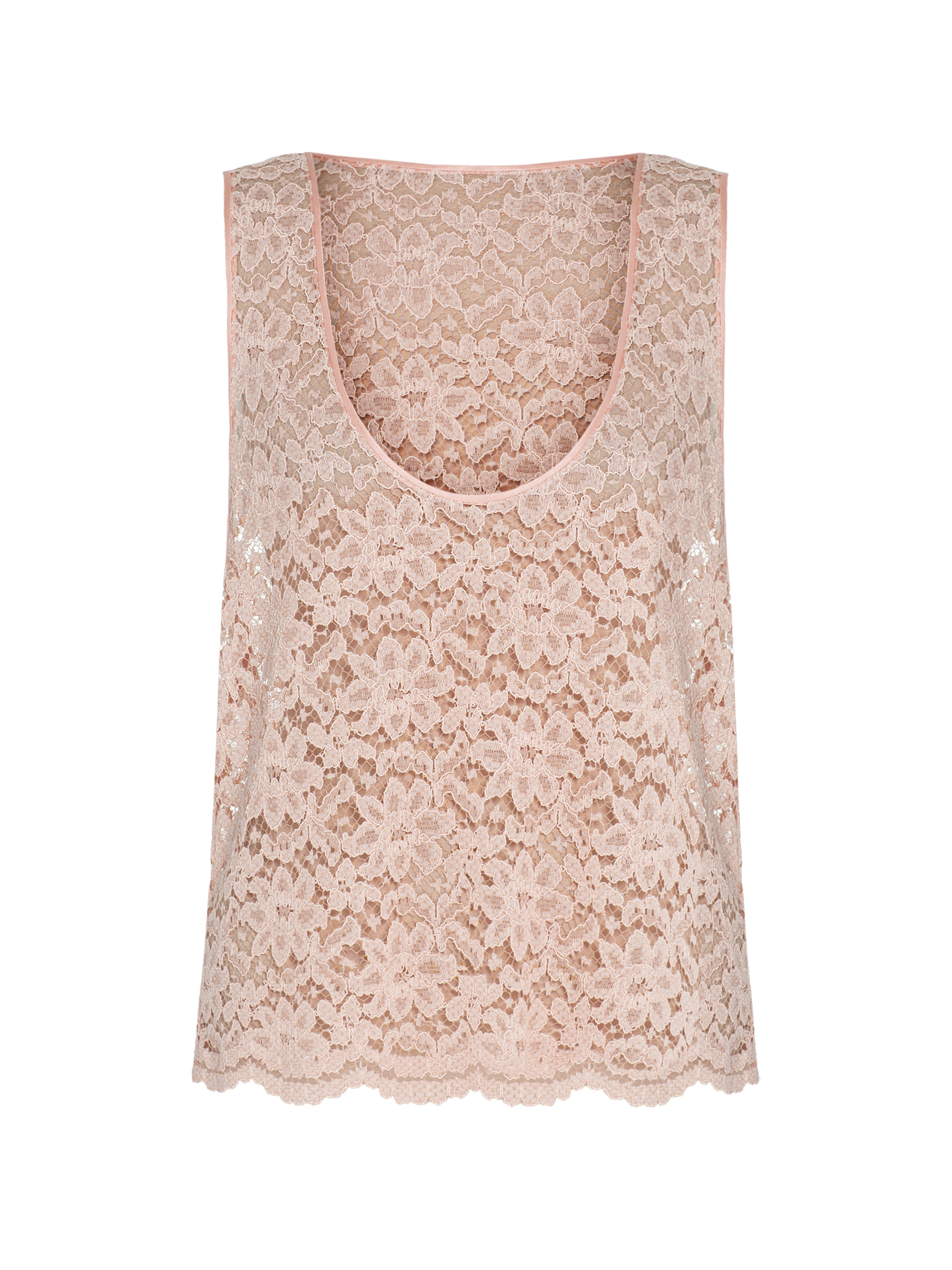 An elegant top made of peach lace will be a perfect foundation for any look. The piece is complemented by delicate scalloped trim along the hem.
