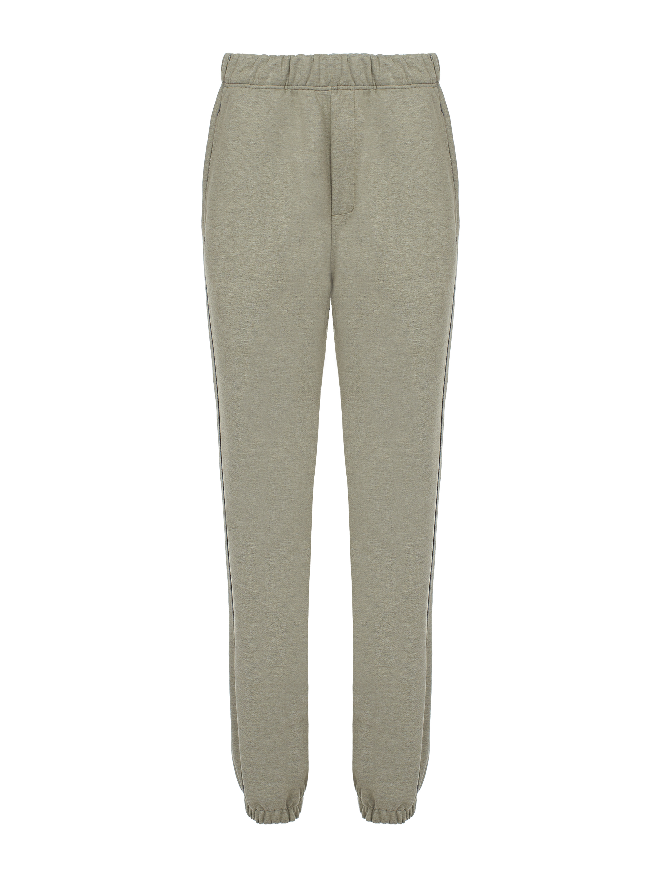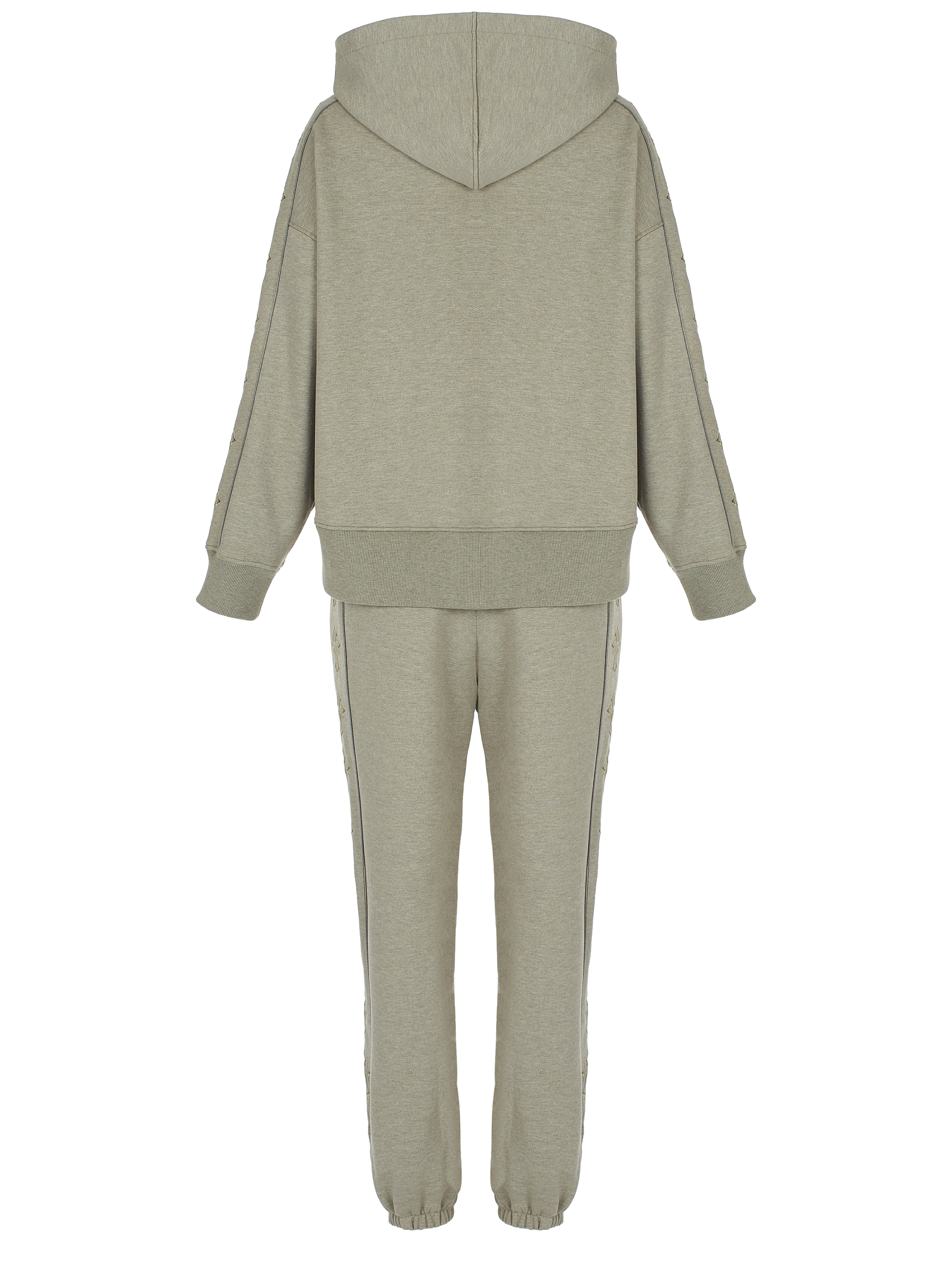 The knitted suit made of melange khaki jersey consists of a hoodie with tone-on-tone cross embroidery on the sleeves and track pants with side stripes and elasticated cuffs. Large kangaroo pocket with brand logo on the front.
