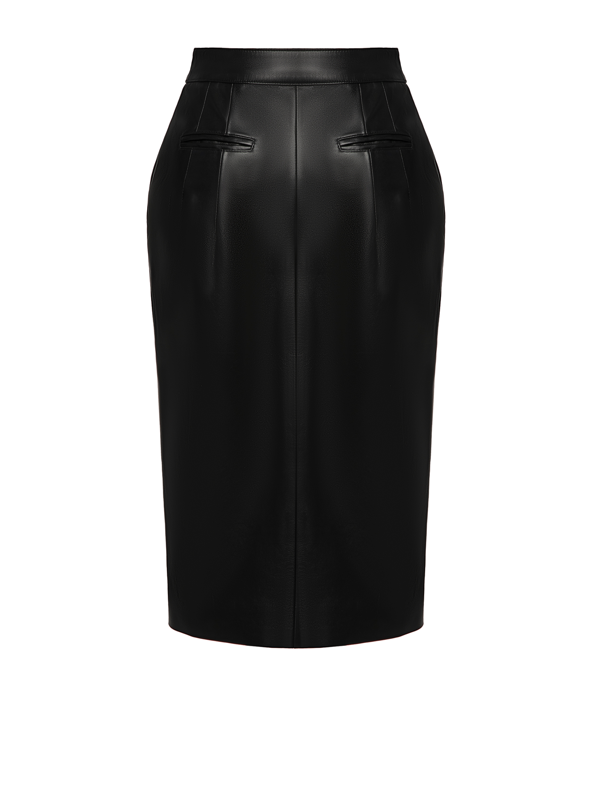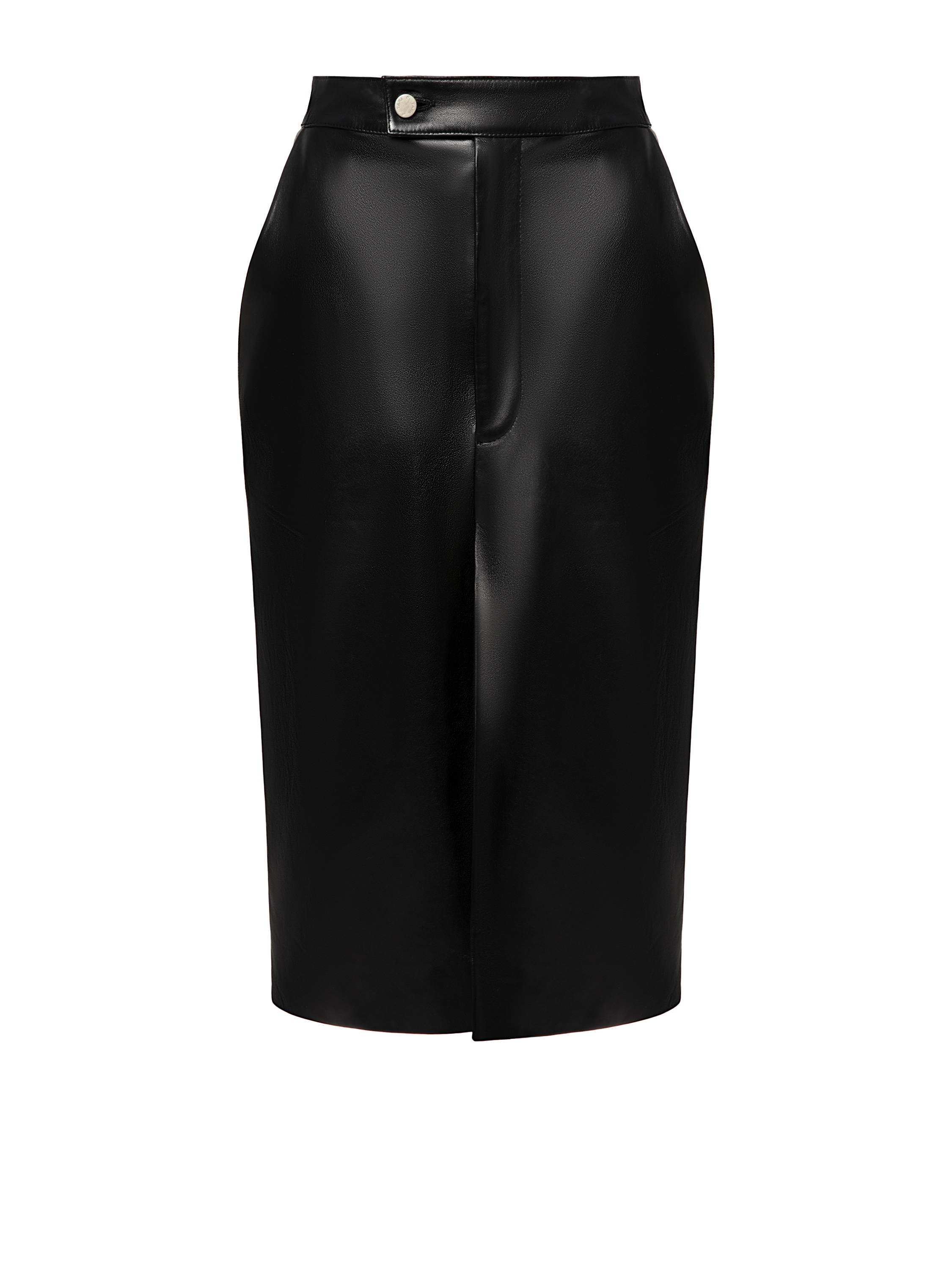 A black pencil skirt with a high front slit made of soft lambskin leather. The midi-length design will be a versatile option for creating an everyday look.