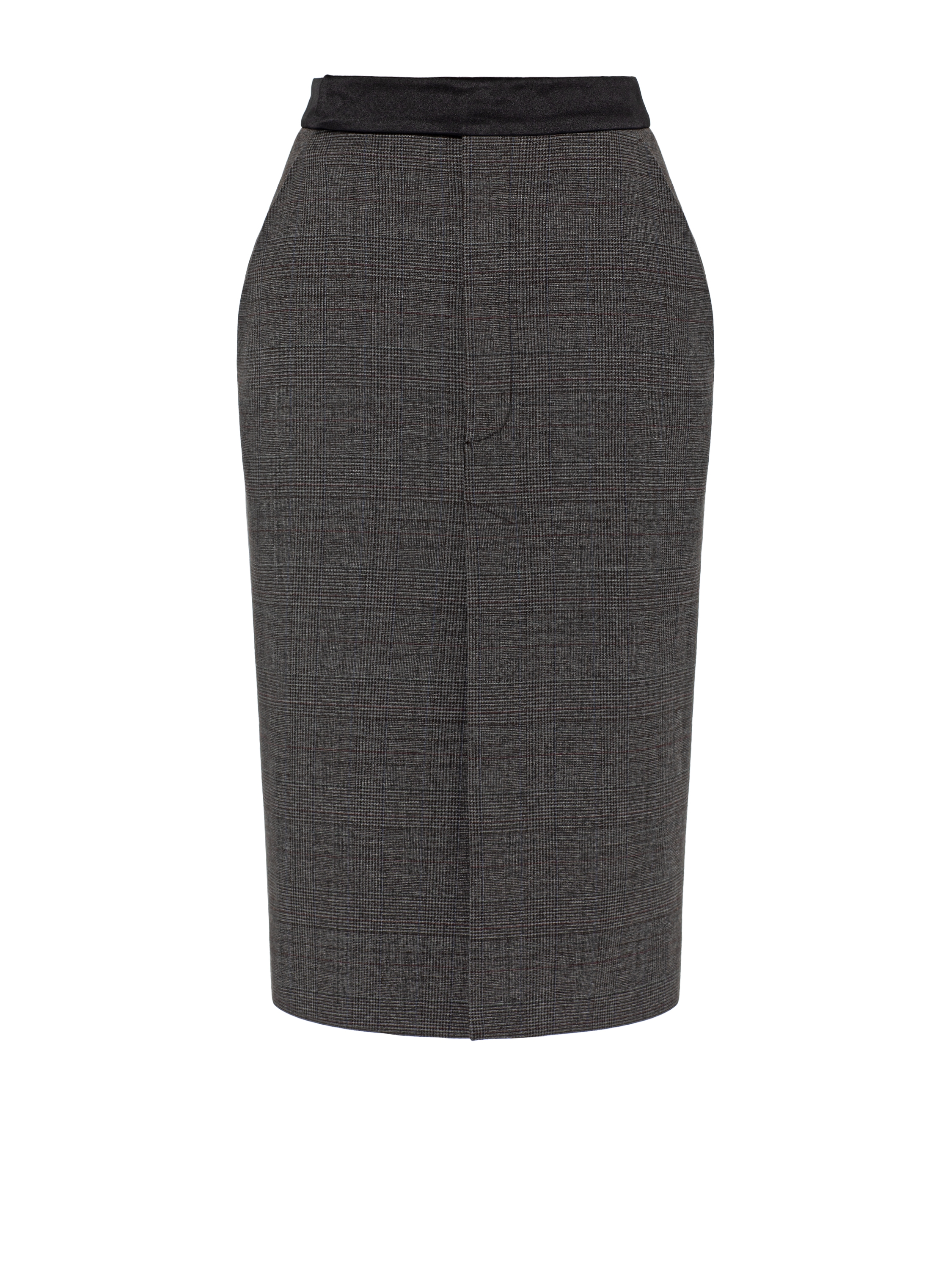 The classic grey above-the-knee skirt is made of suiting fabric in a neutral check pattern. The satin waistband and front slit make the skirt both elegant and comfortable. The model from the new collection, inspired by the aesthetics of uniform, combines rigor and femininity. Item length: 55 cm.